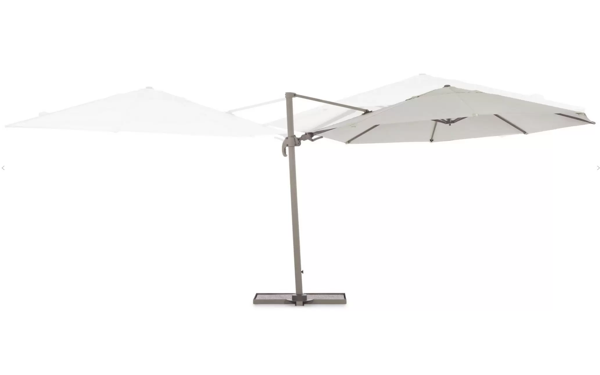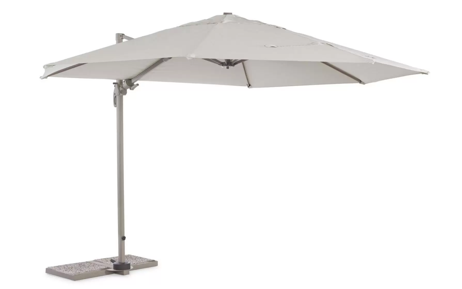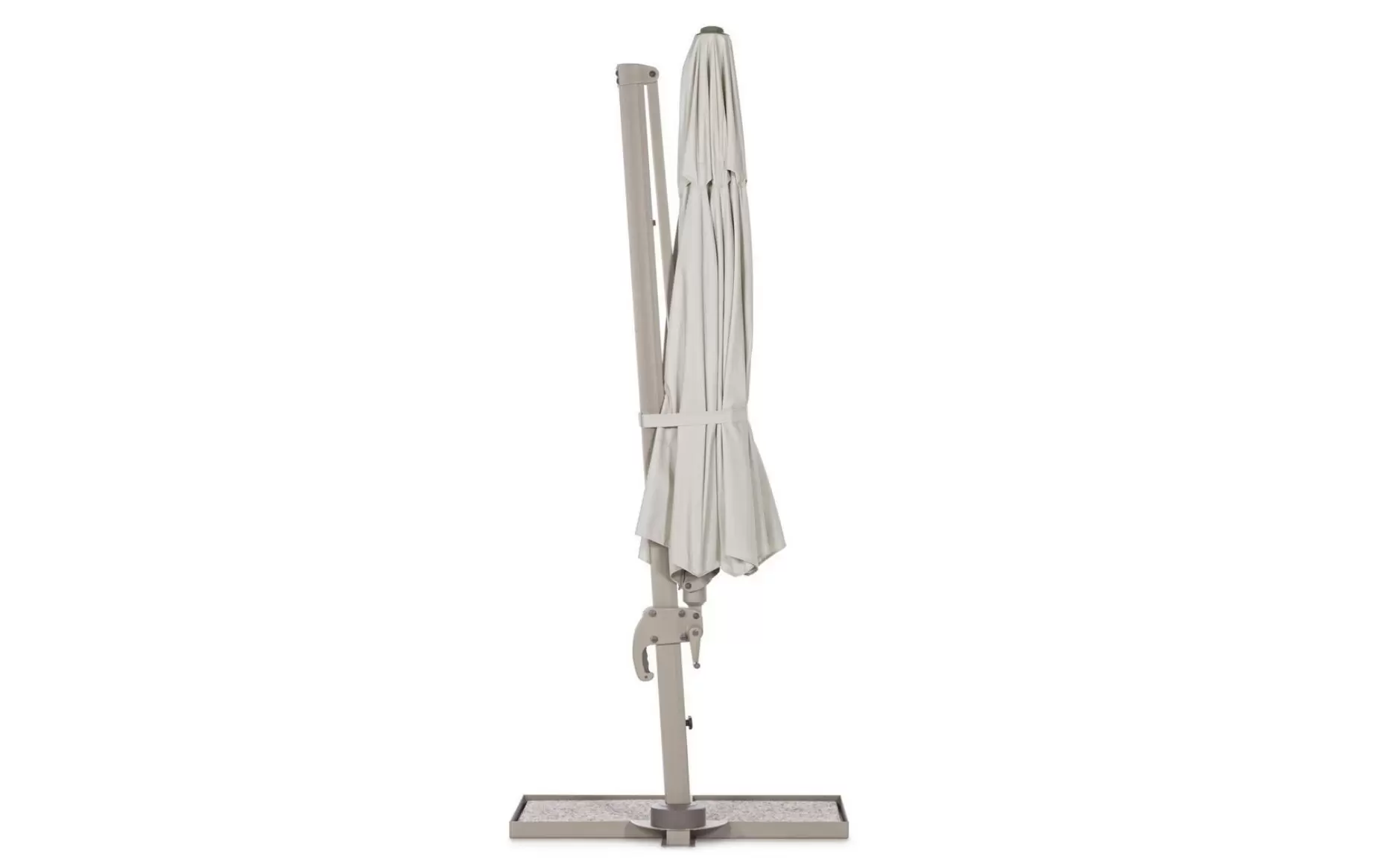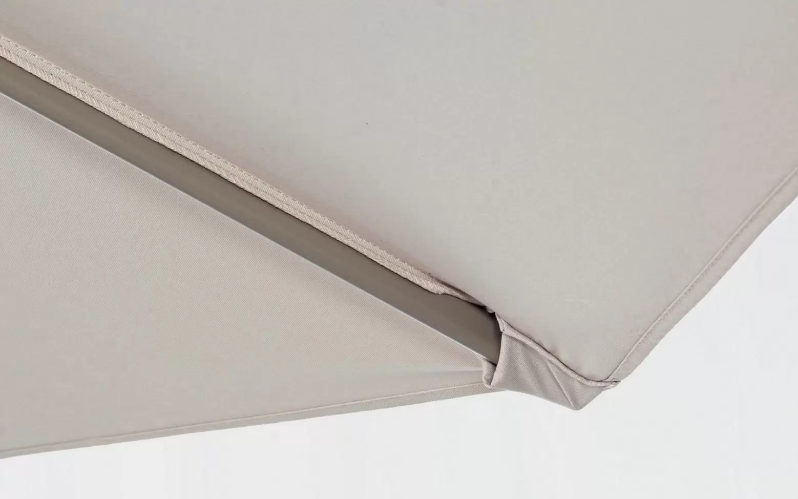 W zestawie znajduje się stalowa podstawa boczna, przystosowana do obciążenia bloczkami cementowymi (zalecane minimum 4 szt. o łącznej wadze ok. 100 kg). Parasol jest kompatybilny z oświetleniem LED oraz głośnikiem z tej samej kolekcji.