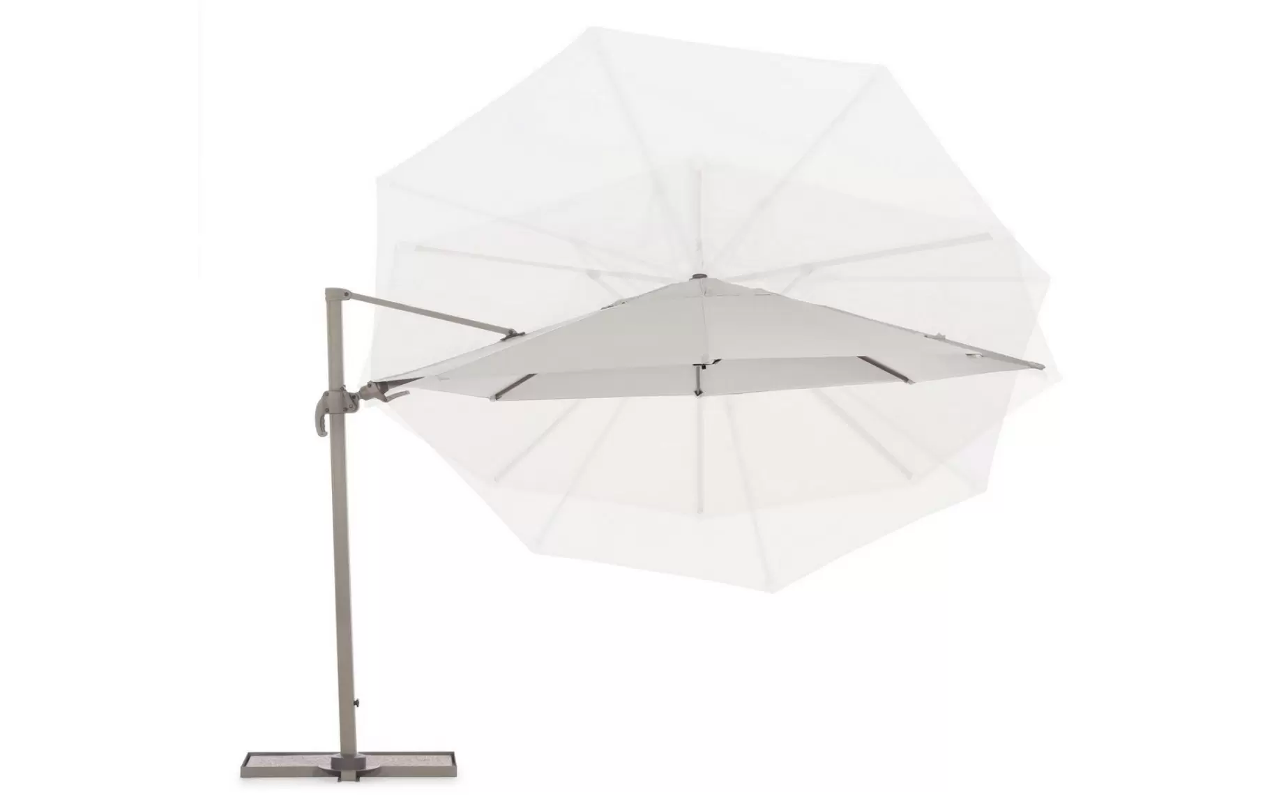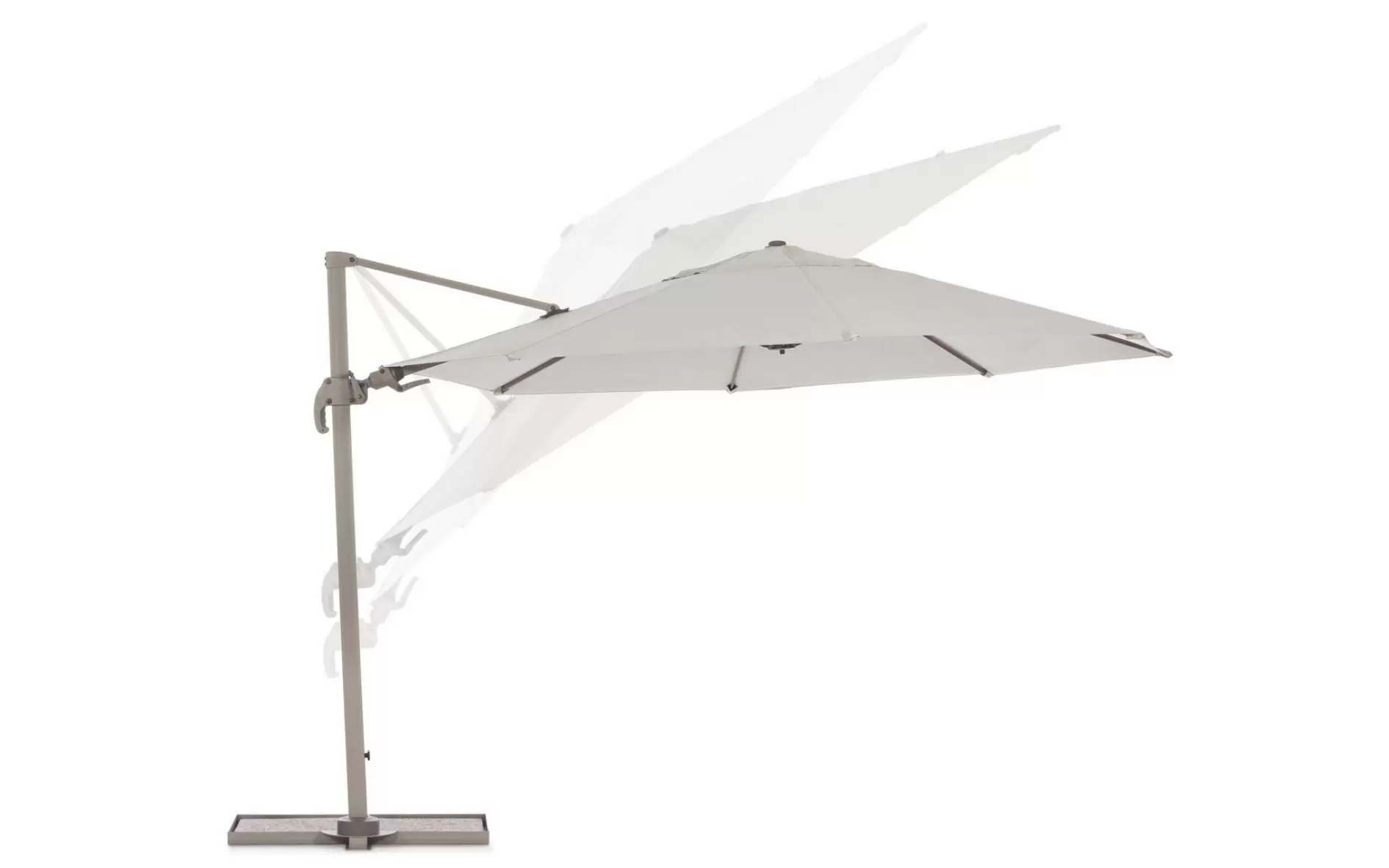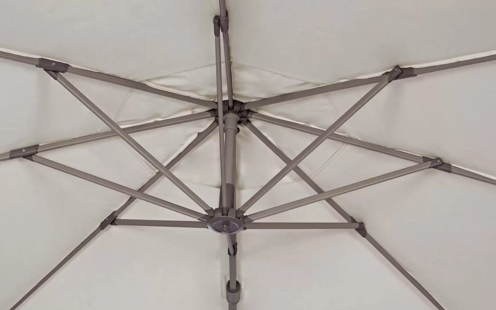 Konstrukcję wykonano z aluminium malowanego proszkowo, co gwarantuje odporność na korozję i stabilność. Parasol wyposażono w mechanizm obrotu 360° obsługiwany pedałem, a także w regulację pionową w 5 pozycjach oraz regulację boczną za pomocą uchwytu. Pozwala to precyzyjnie ustawić czaszę względem słońca.