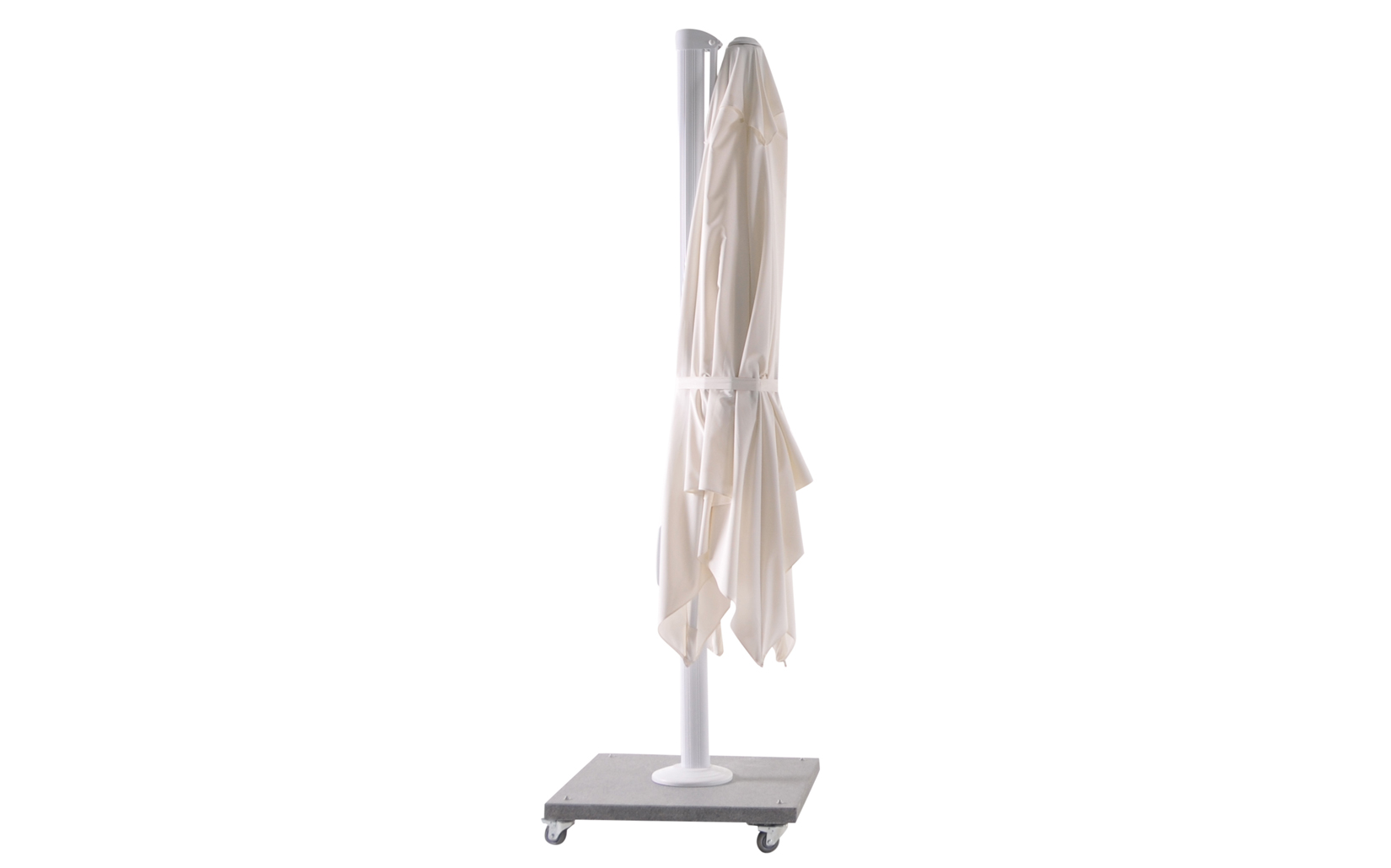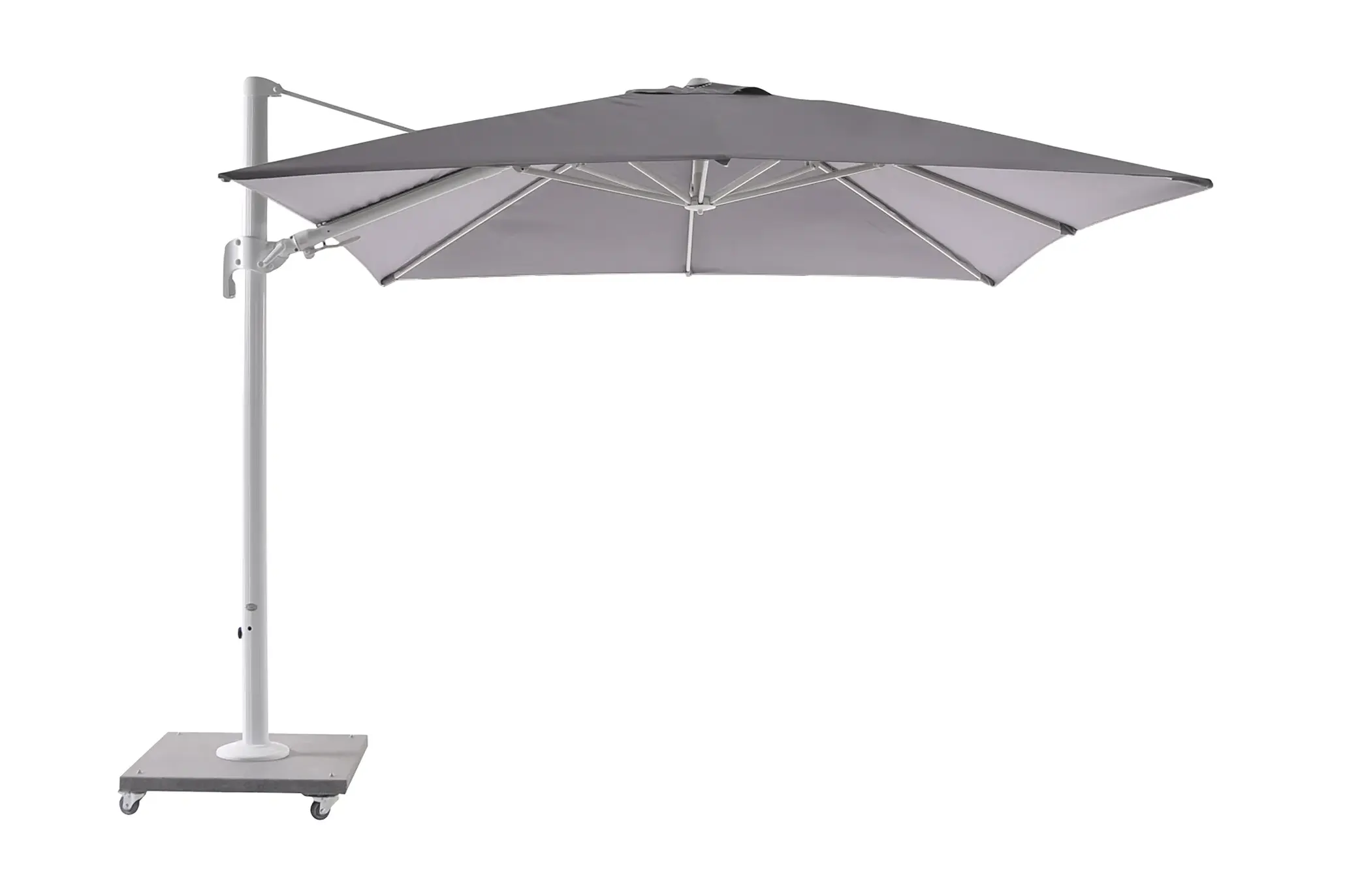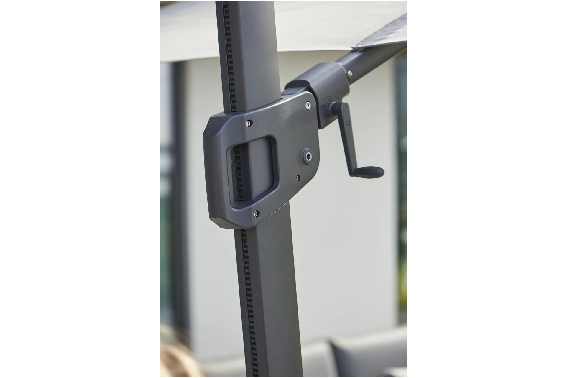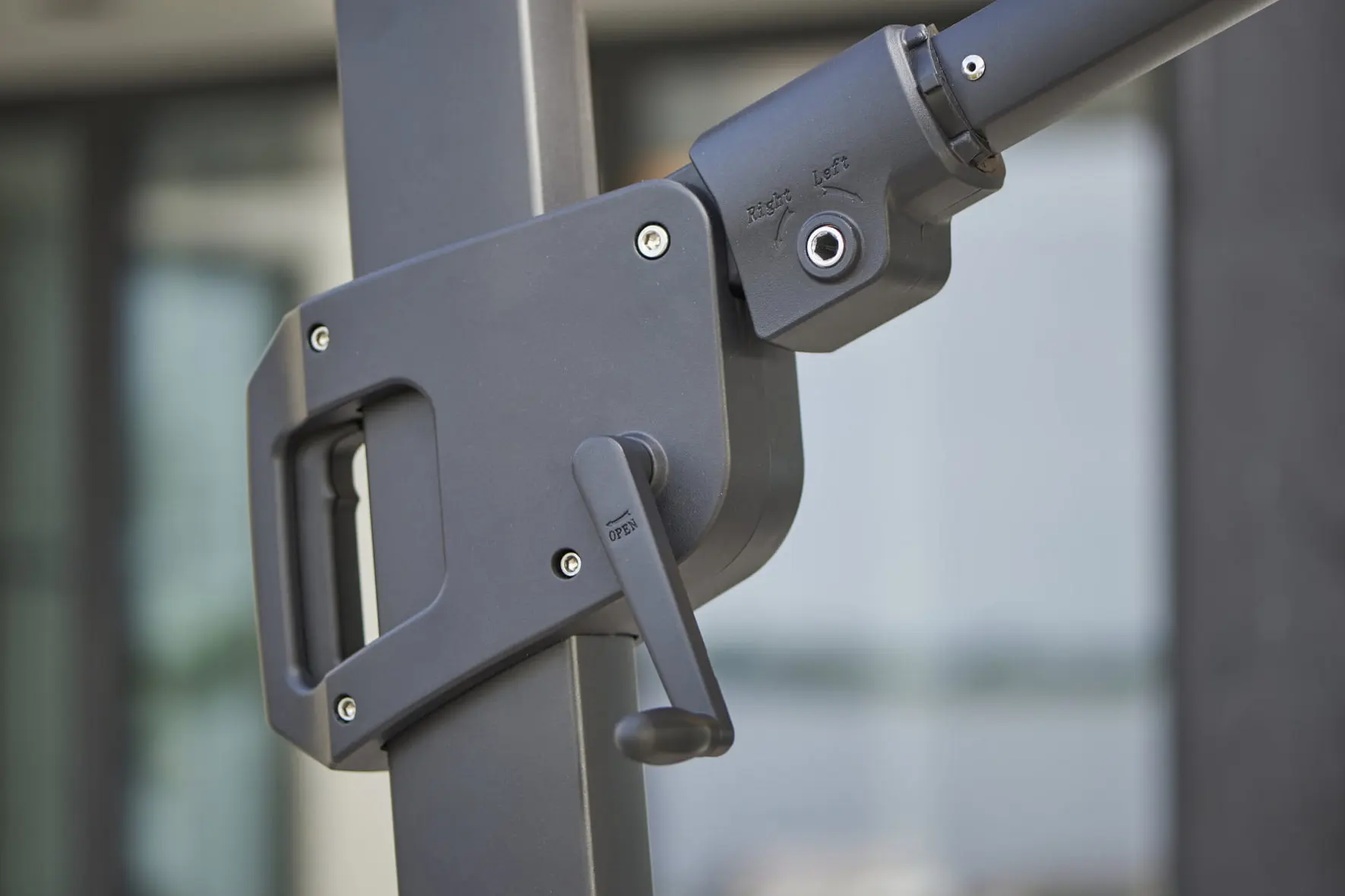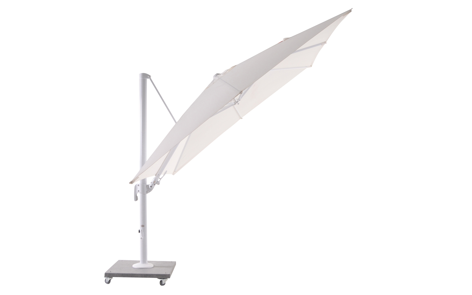 Parasol można obrócić o 360 stopni za pomocą korbki. Dwukierunkowe nachylenie czaszy ułatwia ustawienie "cienia". Można to osiągnąć jednym naciśnięciem przycisku. Ciężka granitowa podstawa (150 kg) posiada stabilne, blokowane kółka ułatwiające przesuwanie parasola.
