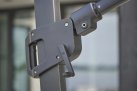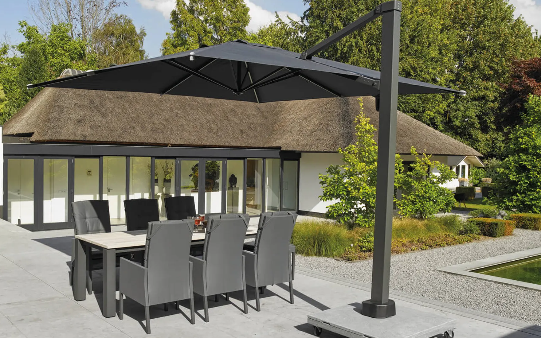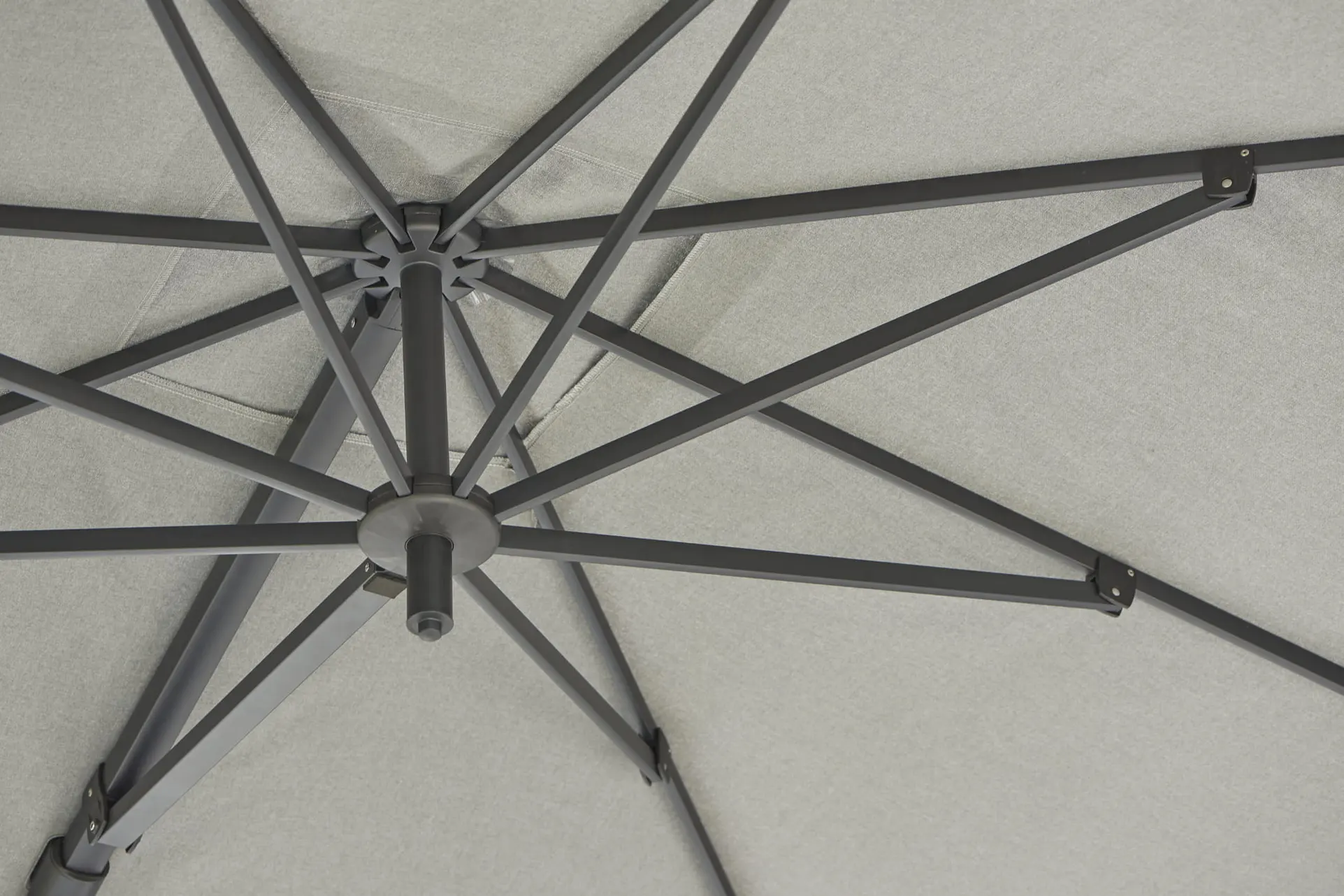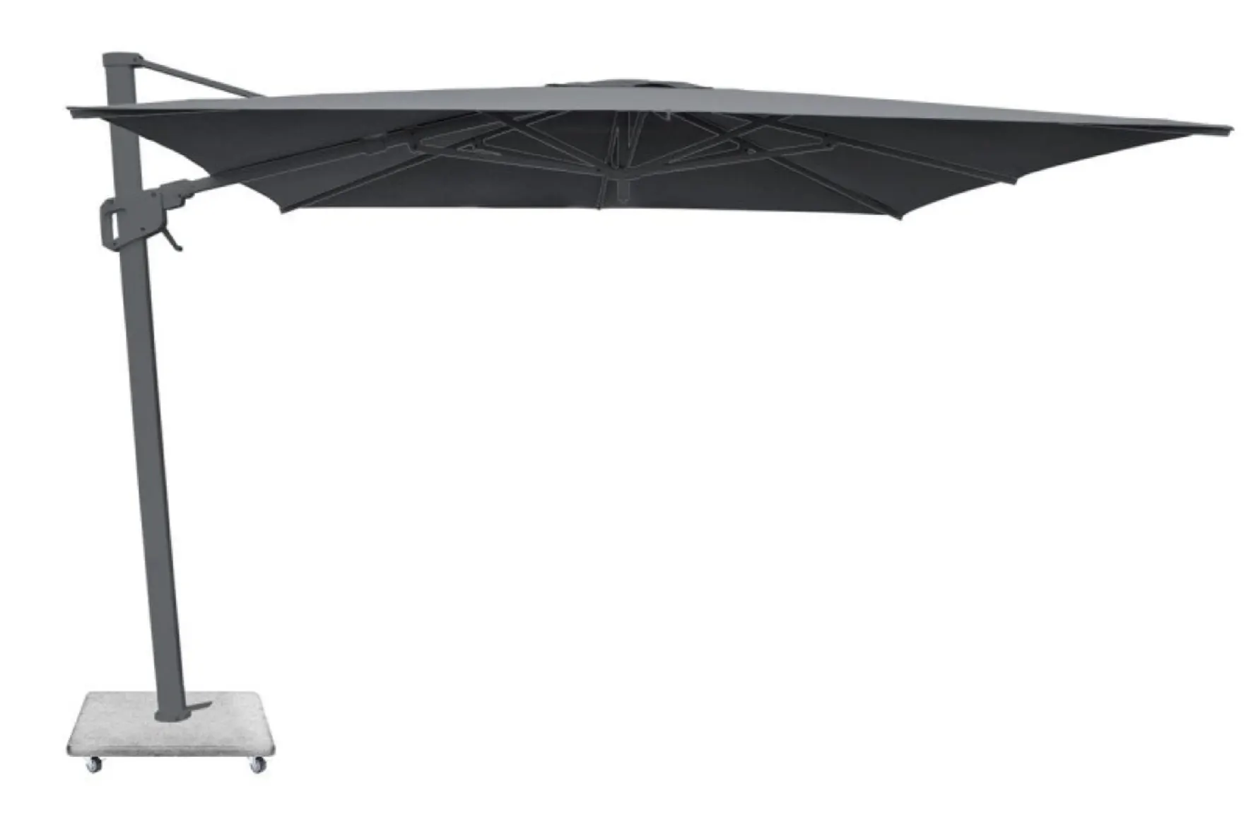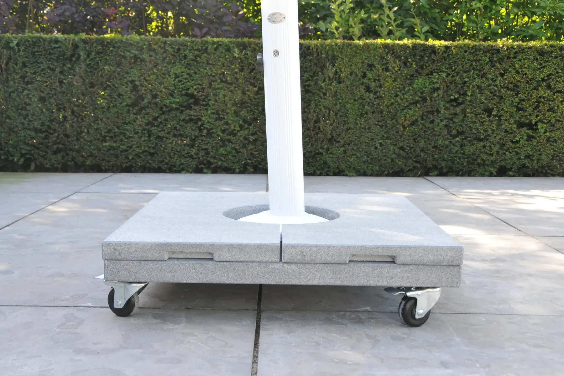 Parasol można obrócić o 360 stopni za pomocą korbki. Dwukierunkowe nachylenie czaszy ułatwia ustawienie "cienia". Można to osiągnąć jednym naciśnięciem przycisku. Ciężka granitowa podstawa (150 kg) posiada stabilne, blokowane kółka ułatwiające przesuwanie parasola.