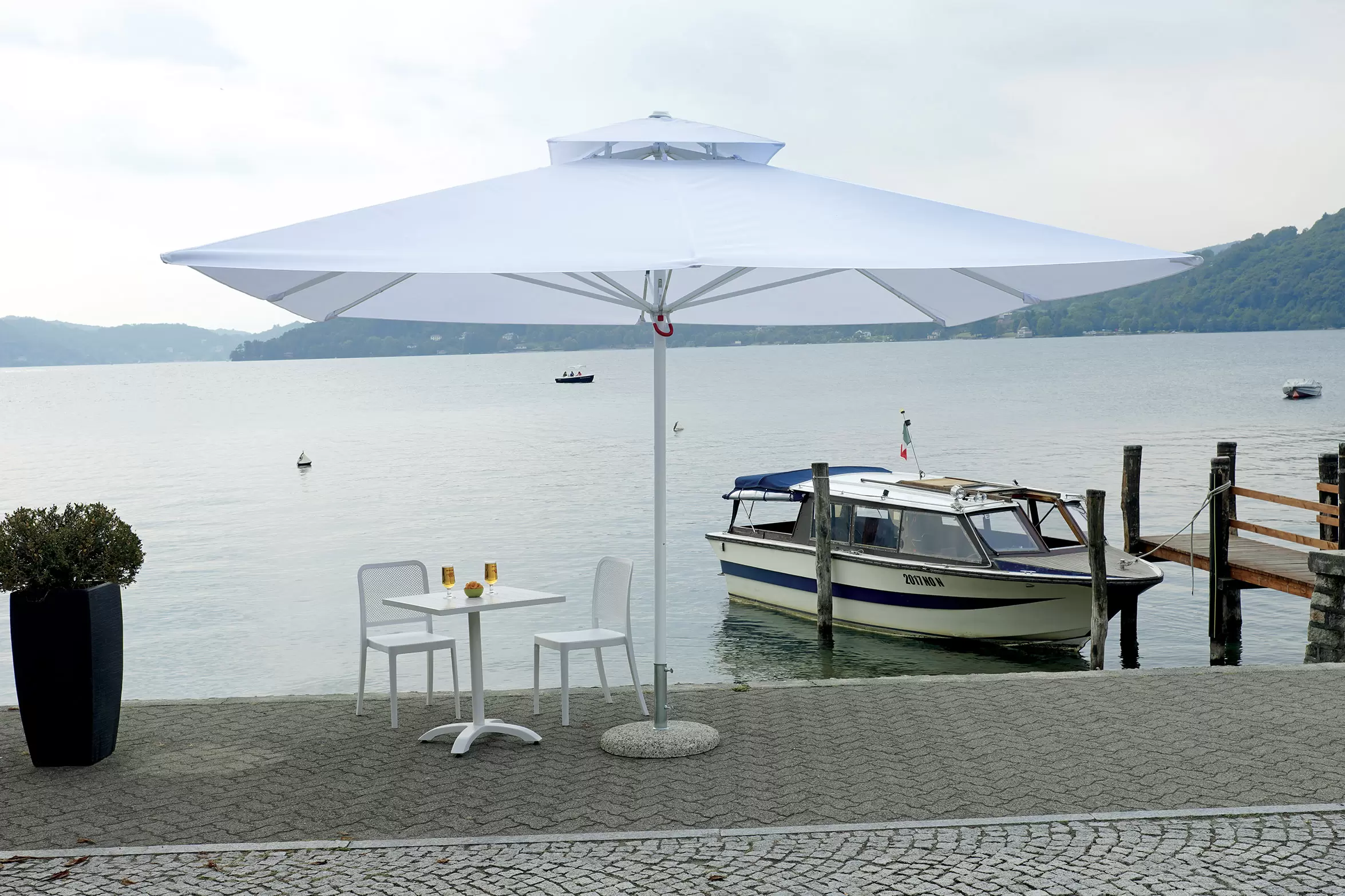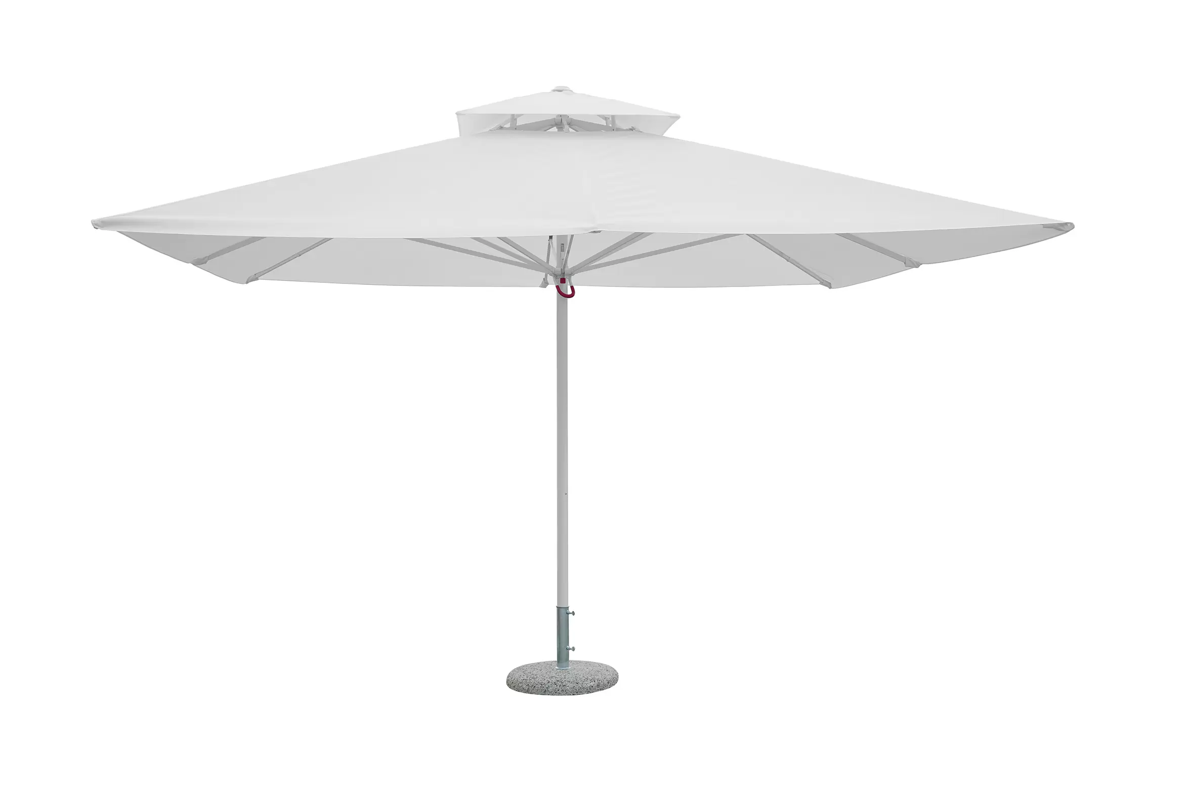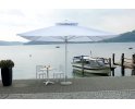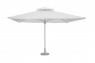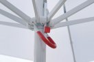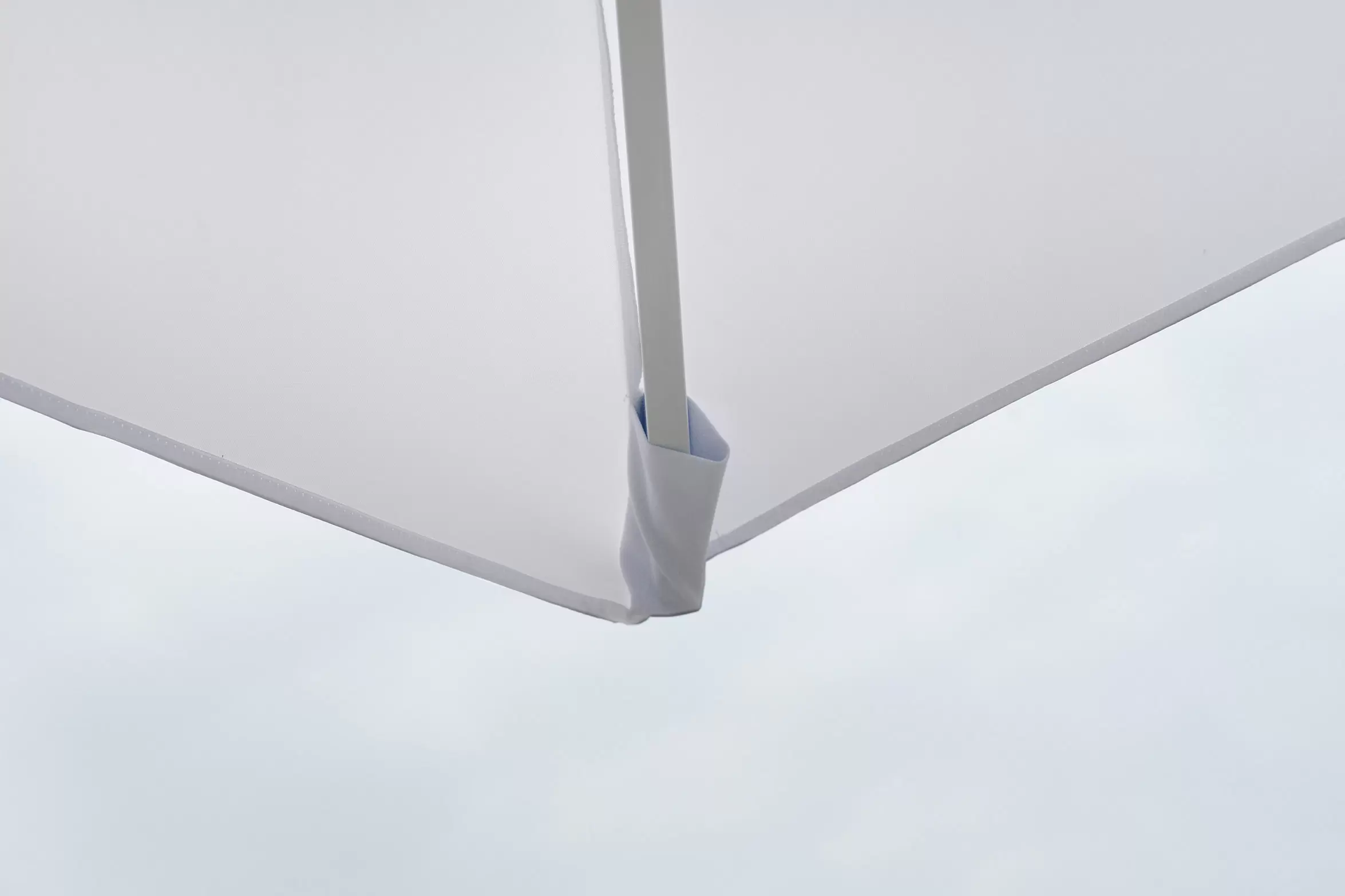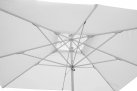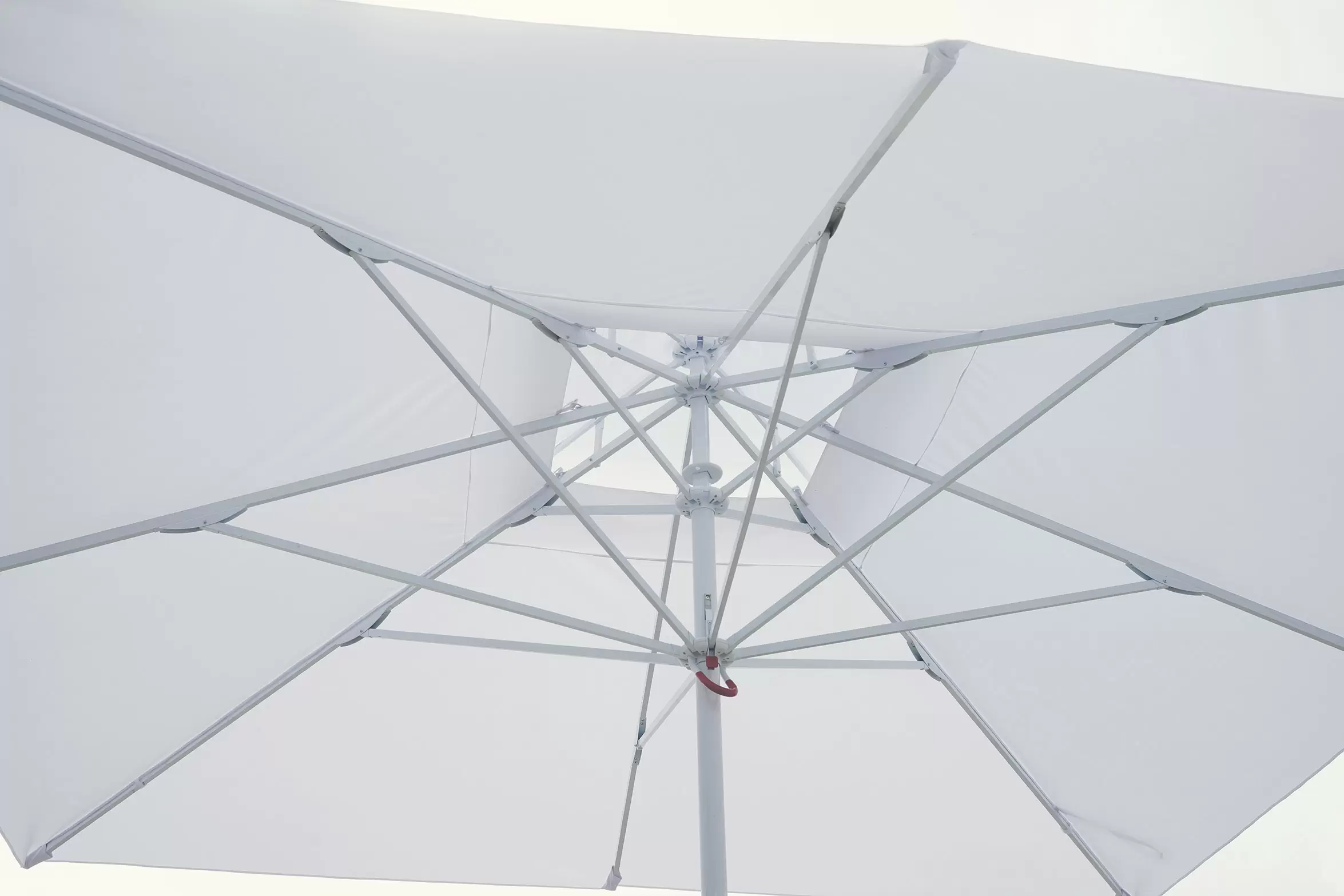 Parasol ogrodowy z teleskopowym mechanizmem otwierania, 8-ramienny i z białym poszyciem z impregnowanego materiału poliestrowego.