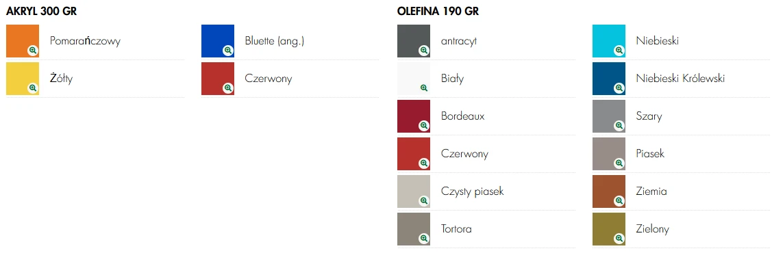 Konstrukcja z aluminium malowanego proszkowo, poszycie z akrylu 300 g/m², Olefin 190 g/m². Profile aluminiowe o przekroju 14×24×0,8 mm. Materiały odporne na wilgoć, promieniowanie UV i zabrudzenia. Tkaniny o wysokiej stałobarwności, filtr UV UPF 50+.
