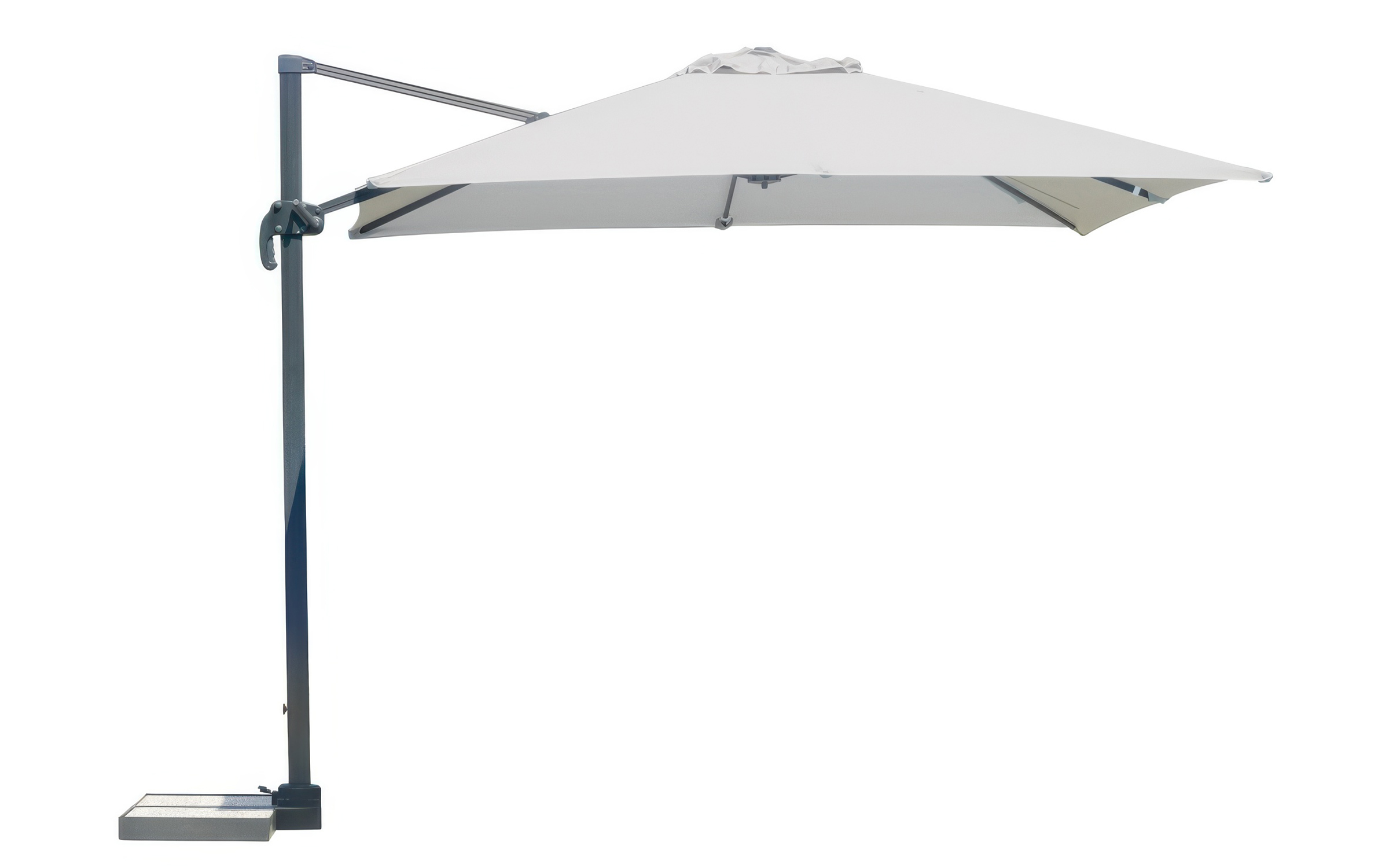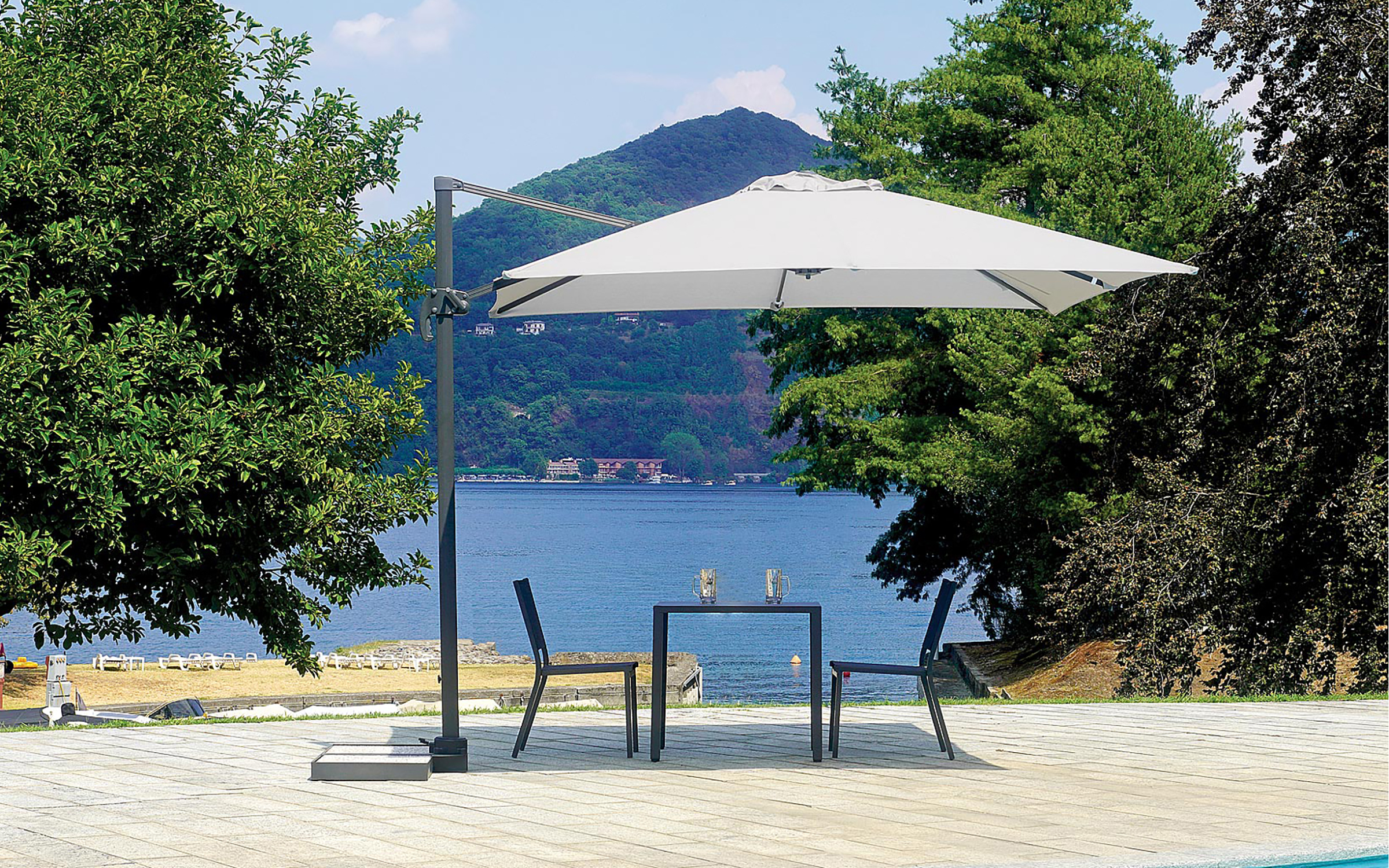 Parasol ogrodowy ROMA to elegancki model z nogą boczną z kolekcji Greenwood, produkowanej przez włoską firmę MOIA. Konstrukcja wykonana z aluminium malowanego proszkowo w kolorze antracytowym, z owalnym masztem 77×53 mm i podstawą boczną dającą więcej wolnego miejsca pod parasolem. Poszycie dostępne w trzech wariantach: akryl 300 g/m², Olefin 190 g/m². Parasol wyposażony w komin przeciwwiatrowy, 8 żeber aluminiowych 14×24×1 mm oraz system otwierania na korbę. Możliwość obrotu 360° i zamówienia z falbaną lub bez.