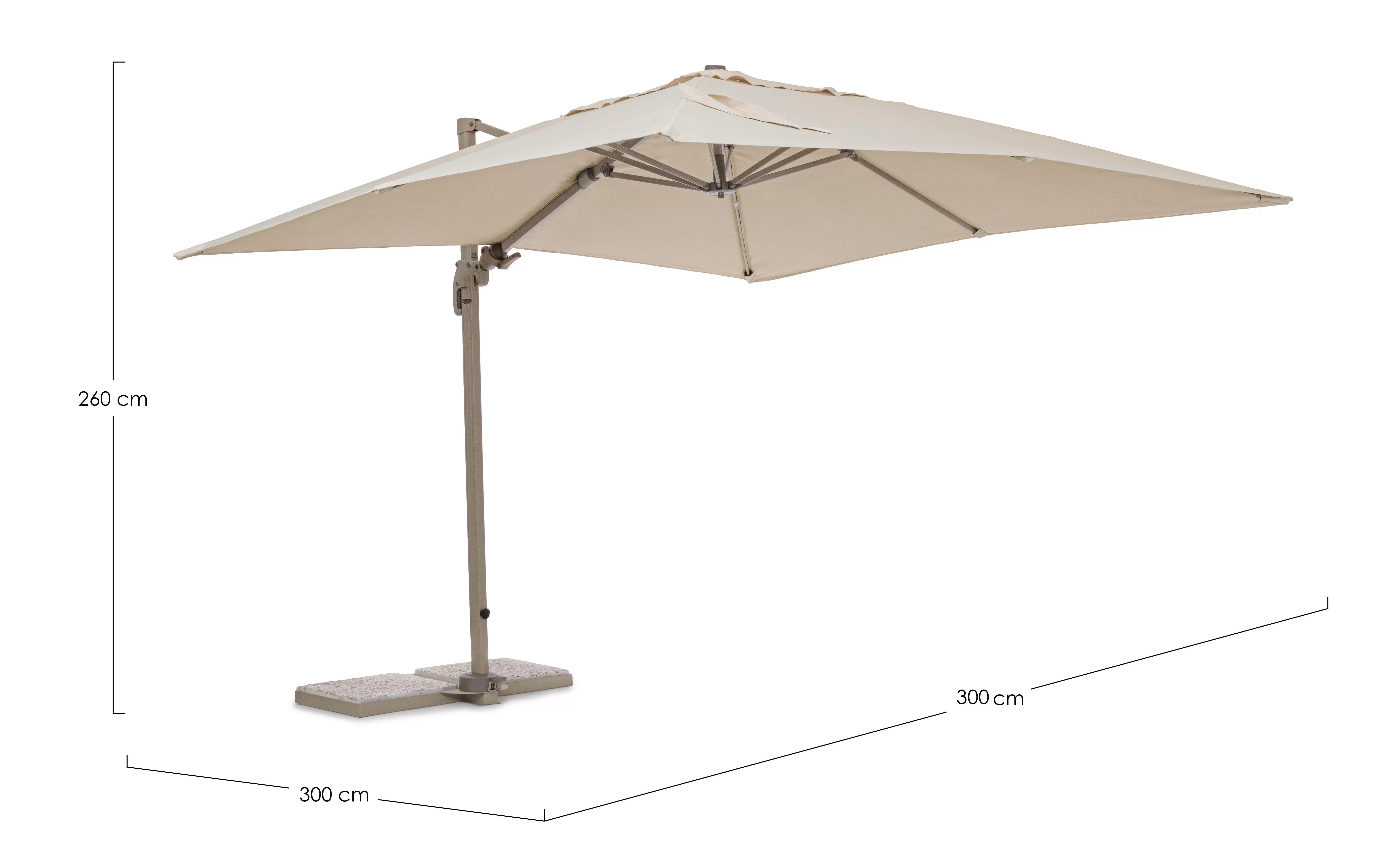 Konstrukcja parasola SARAGOZZA wykonana jest z aluminium malowanego proszkowo w kolorze beżowym, podstawa natomiast z stali w tym samym kolorze. Poszycie czaszy parasola z materiału poliestrowego także w piaskowej tonacji.
