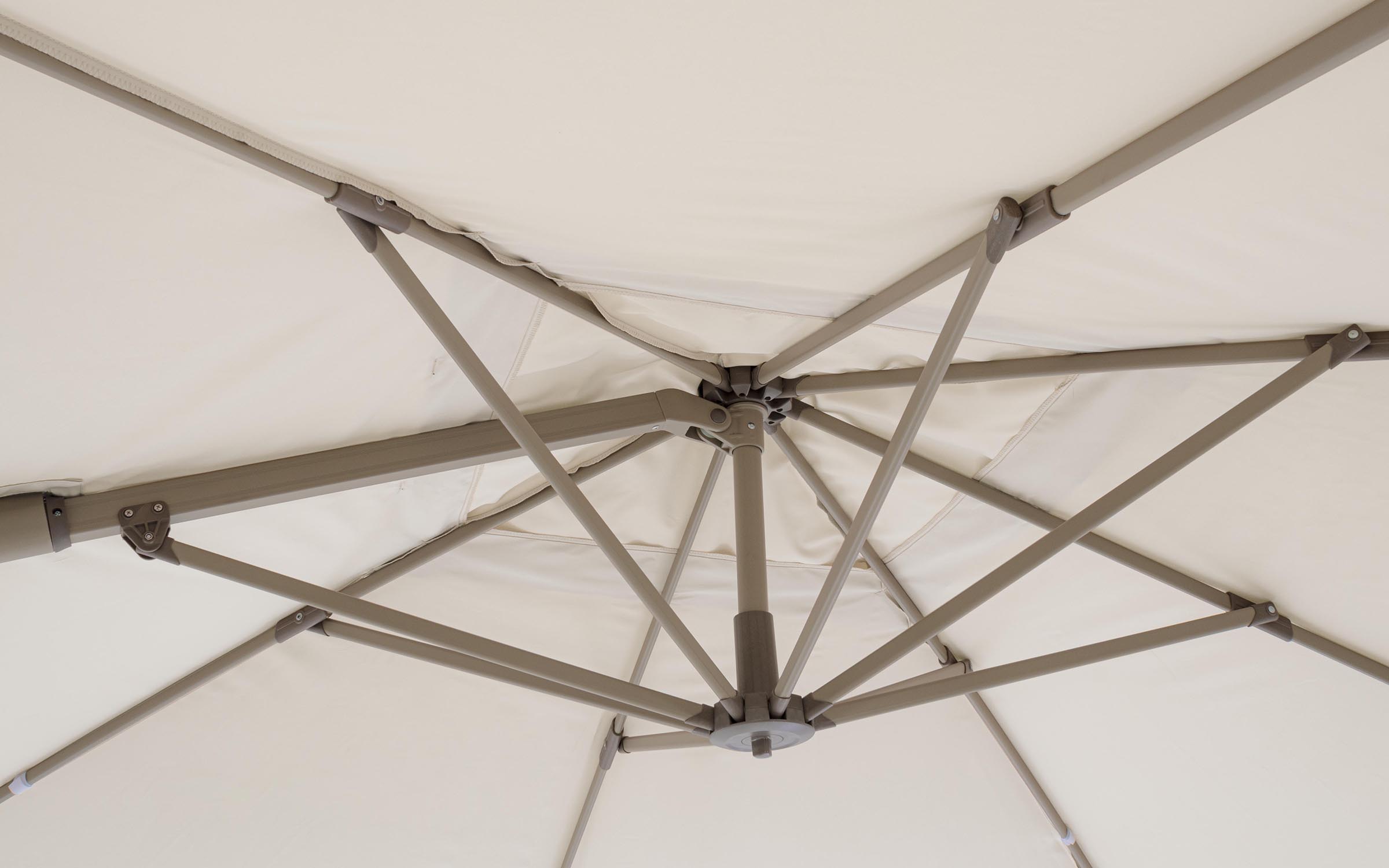Konstrukcja parasola SARAGOZZA wykonana jest z aluminium malowanego proszkowo w kolorze beżowym, podstawa natomiast ze stali w tym samym kolorze. Poszycie czaszy parasola z materiału poliestrowego także w piaskowej tonacji.