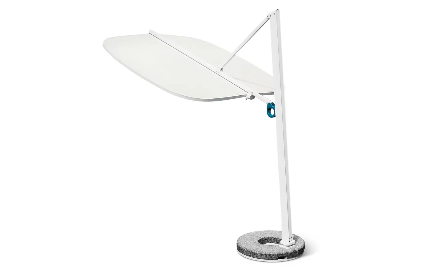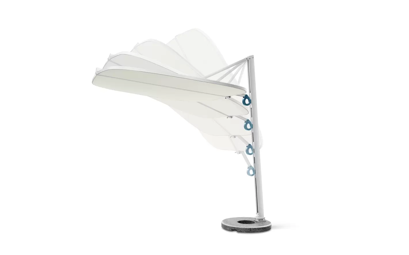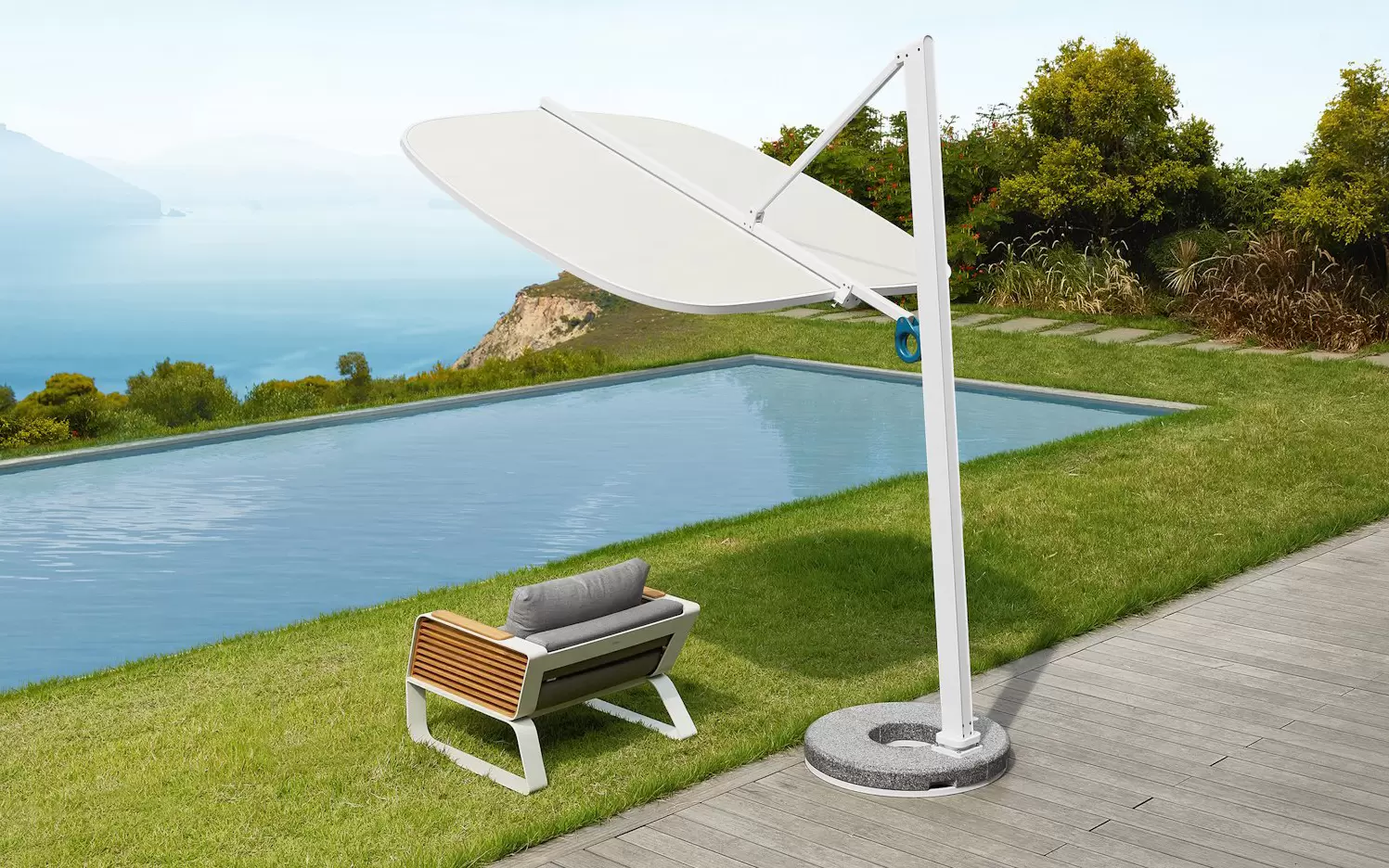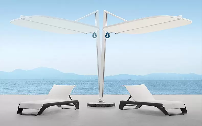 Podwójna czasza umożliwia niezależną regulację kąta po obu stronach, co pozwala precyzyjnie dostosować zacienienie do aktualnego położenia słońca. Ergonomiczne uchwyty zapewniają intuicyjną obsługę, a stabilna, minimalistyczna podstawa nadaje całości elegancki, architektoniczny charakter.