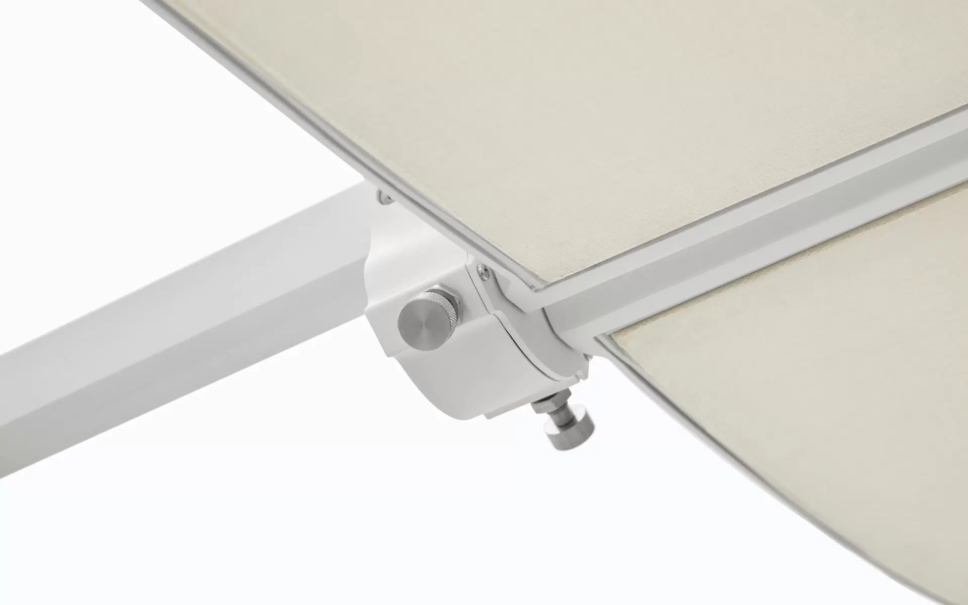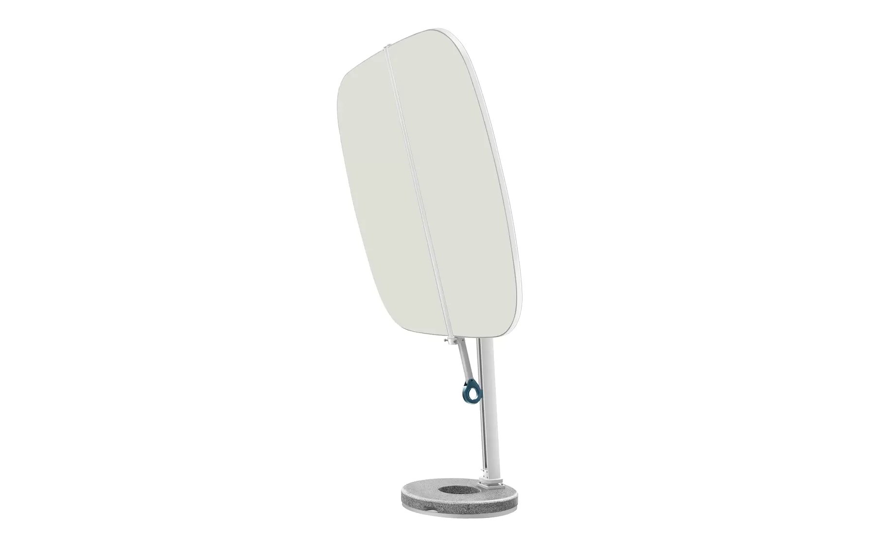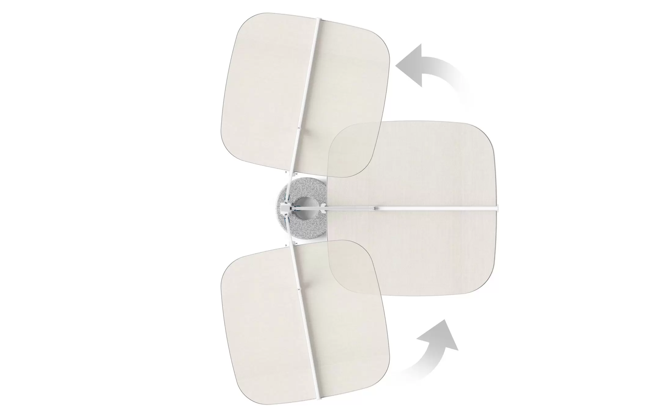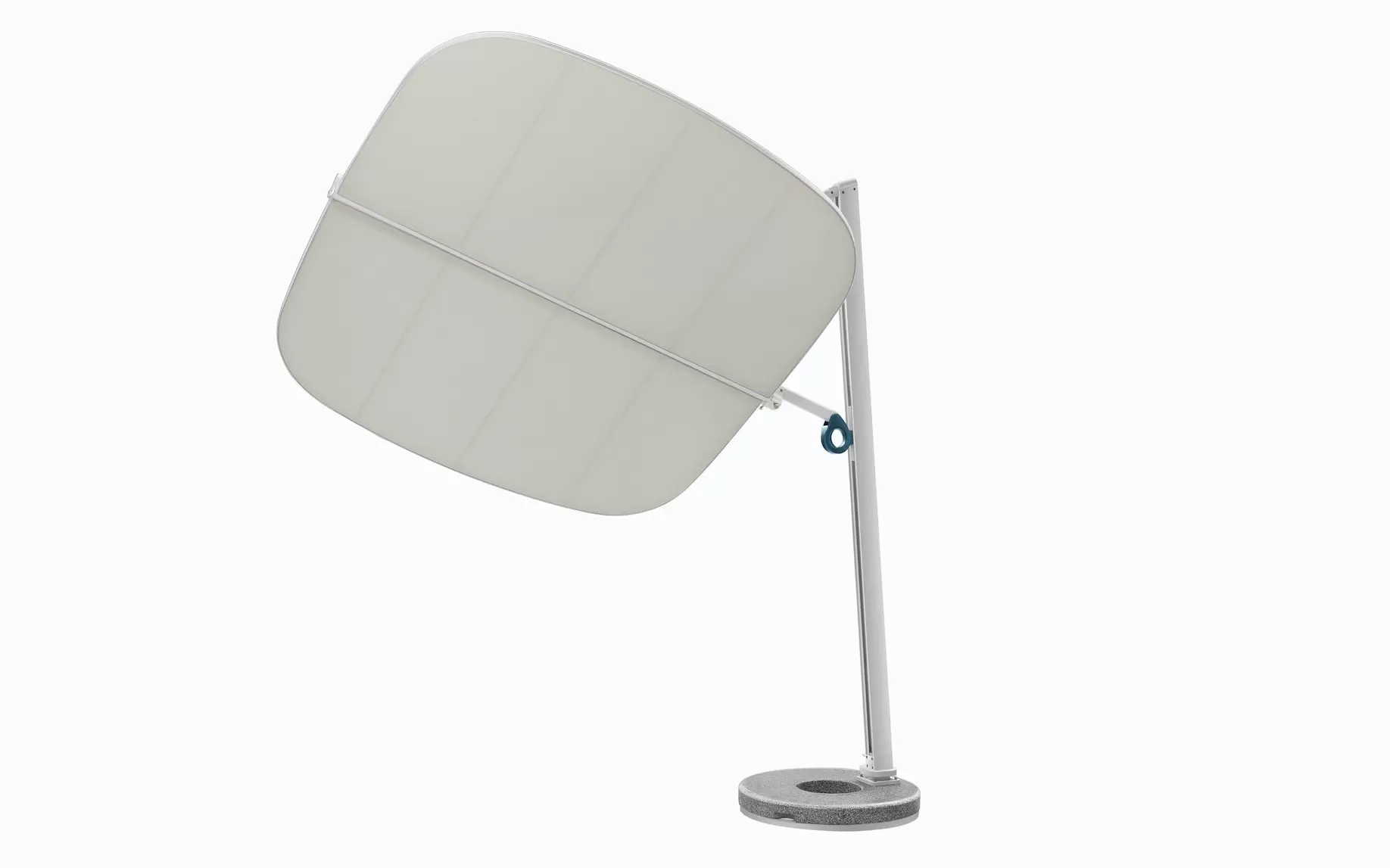 Podwójna czasza umożliwia niezależną regulację kąta po obu stronach, co pozwala precyzyjnie dostosować zacienienie do aktualnego położenia słońca. Ergonomiczne uchwyty zapewniają intuicyjną obsługę, a stabilna, minimalistyczna podstawa nadaje całości elegancki, architektoniczny charakter.