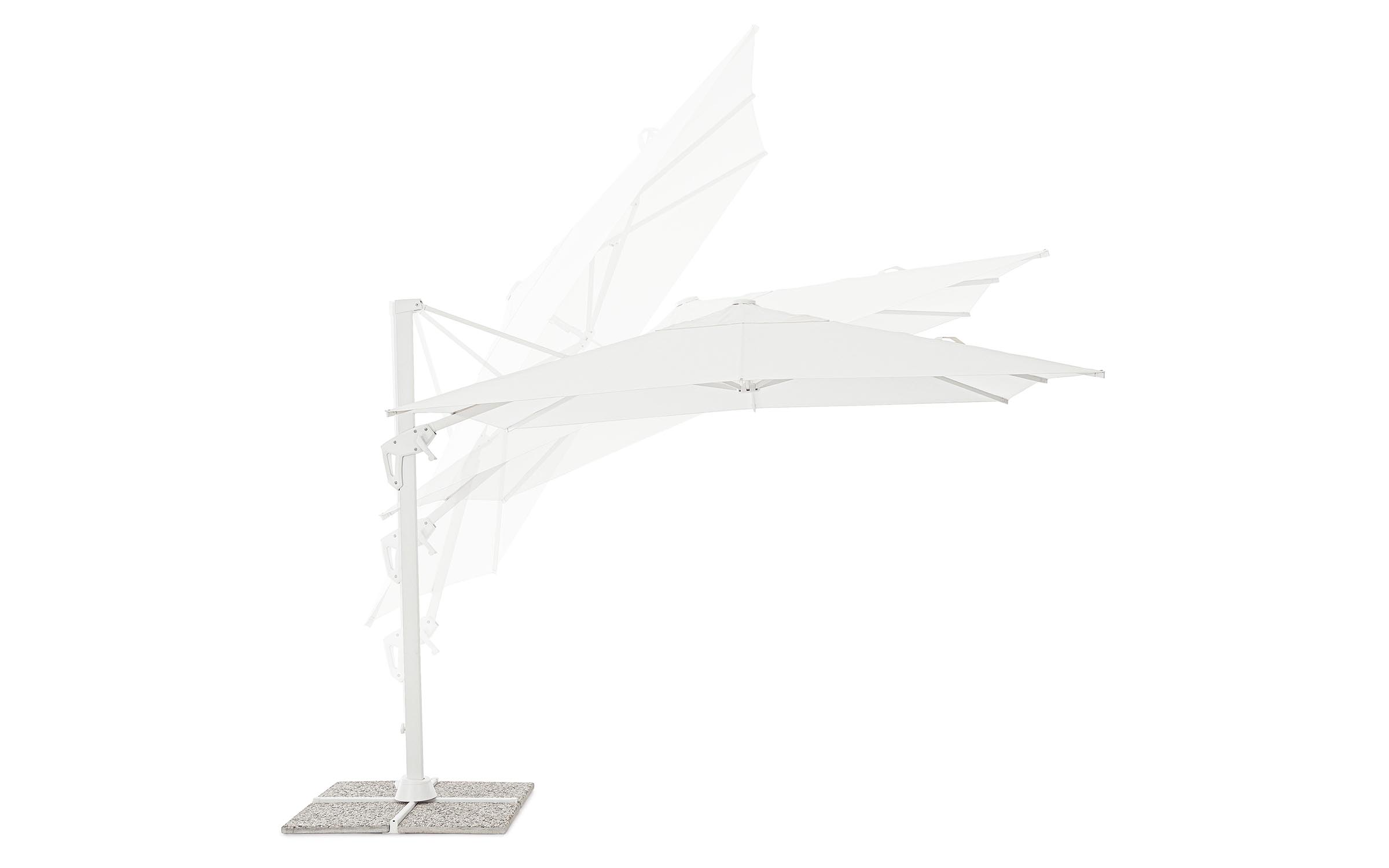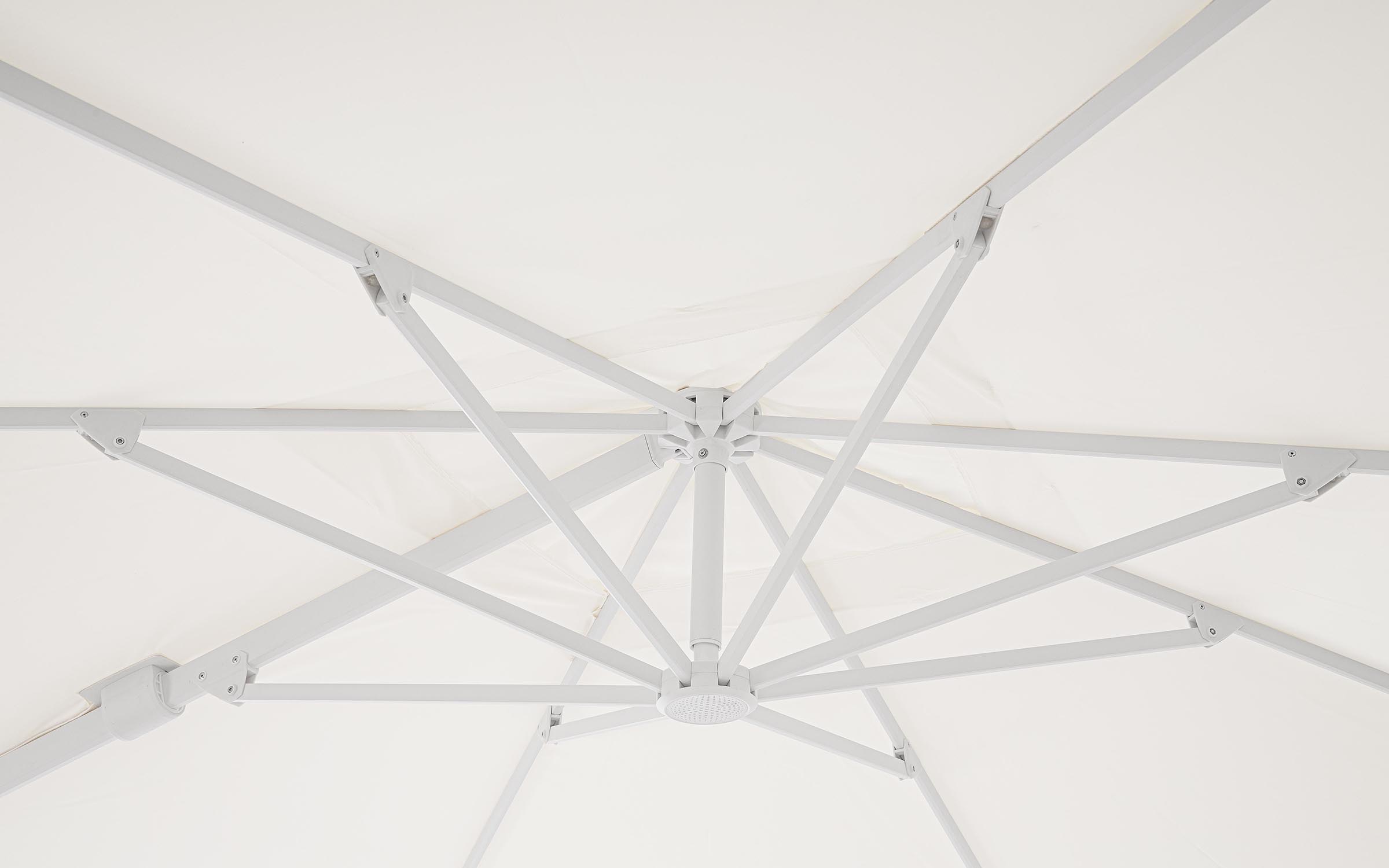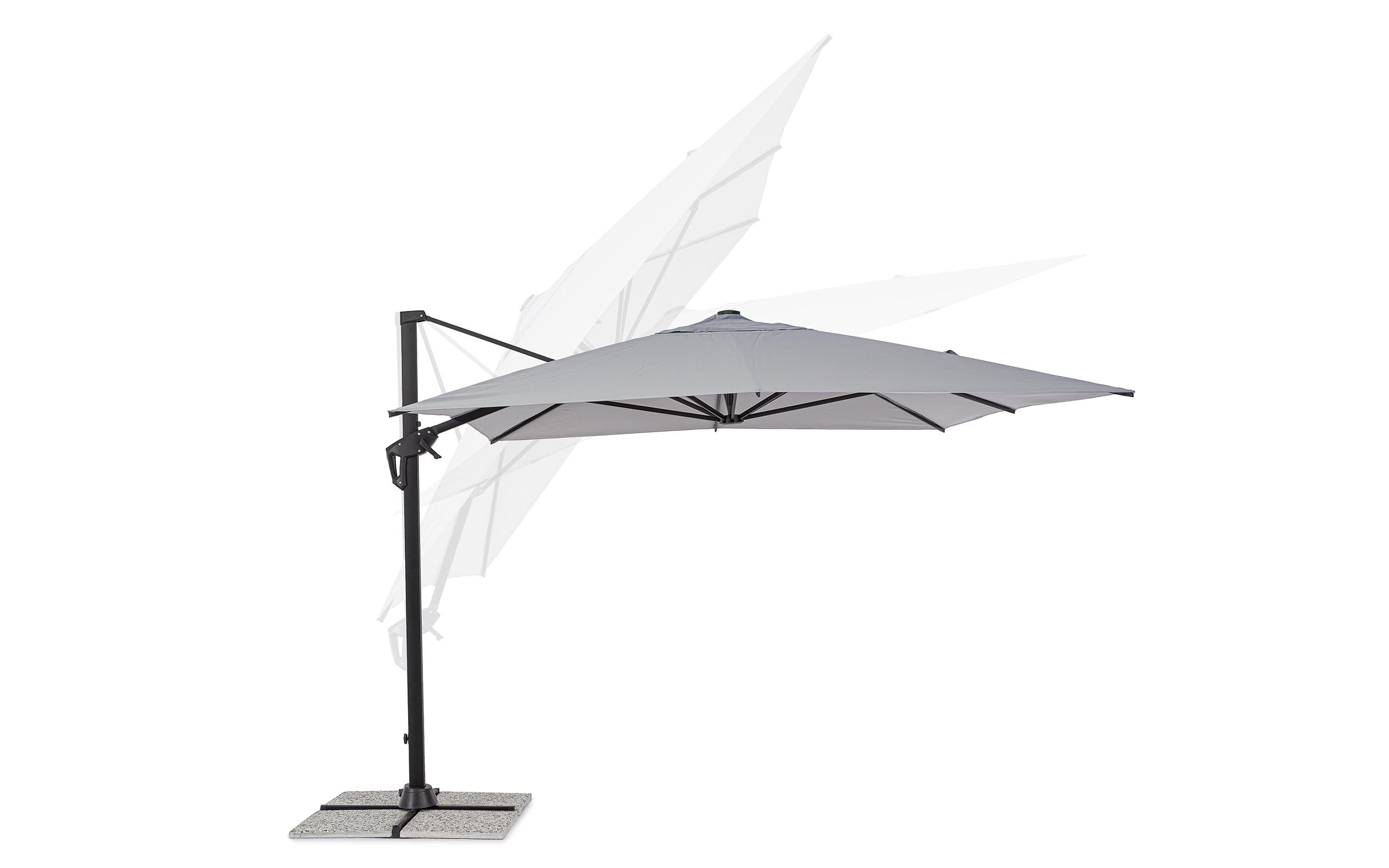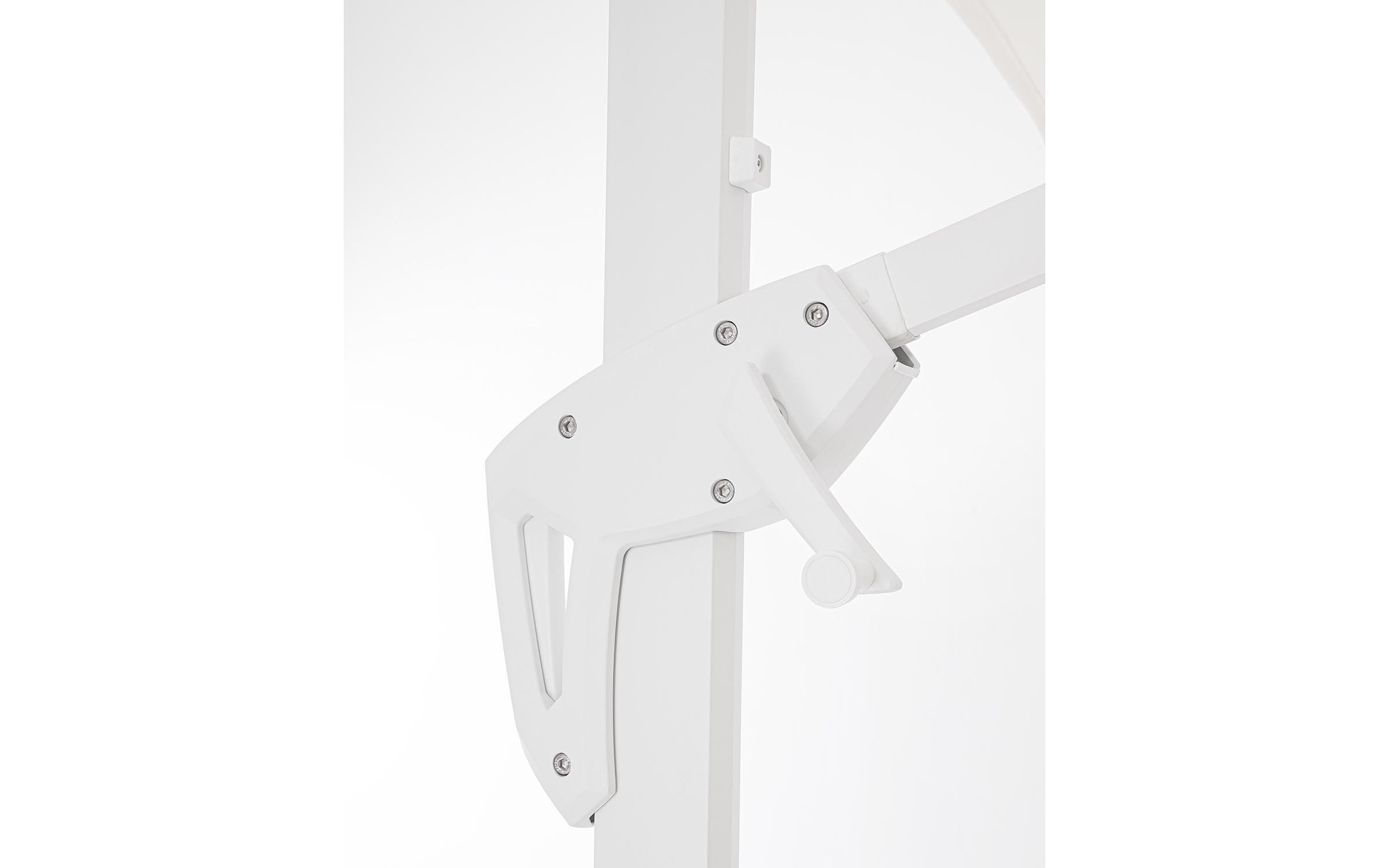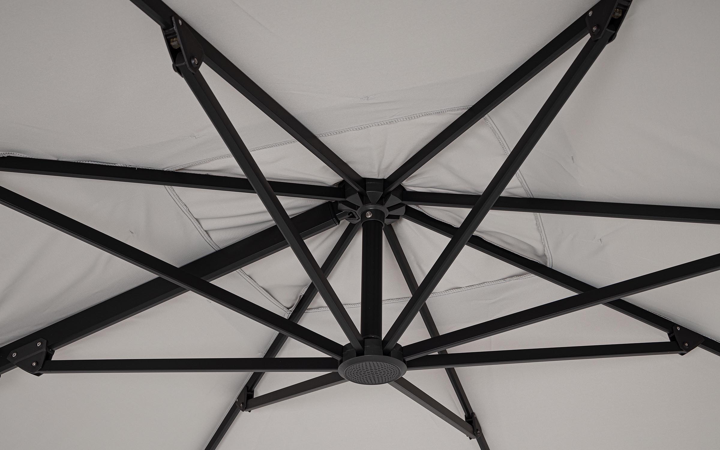 Parasol Vega 3x3 to doskonała opcja zarówno do ogrodu, jak i na taras. Posiada on ramę wykonaną z aluminium i poszycie poliestrowe o gęstości 250 g/m2 rozpiętą na ramionach. Czasza parasola może być obrócona o 360° za pomocą pedału lub zmienić kąt nachylenia na jeden z 5 dostępnych pozycji za pomocą uchwytu przy nodze.