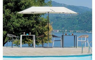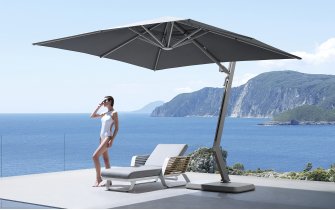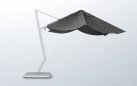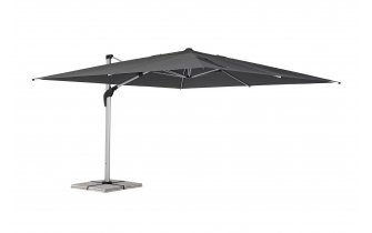 Ekskluzywny parasol z granitową podstawą z kółkami obrotowy i pochylany w 2 płaszczyznach (góra/dół i na boki). Szare poszycie z materiału Sunbrella.