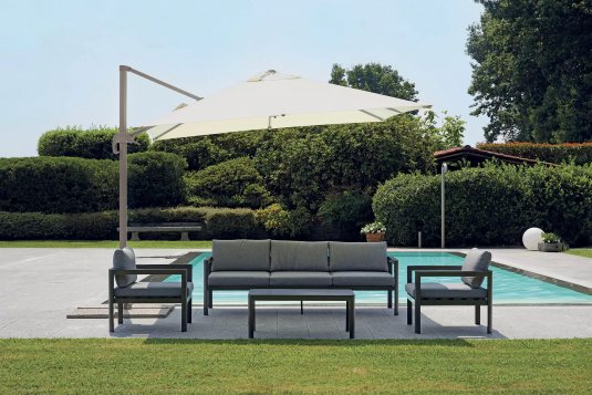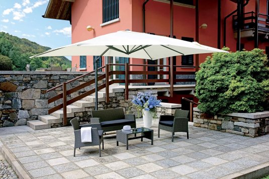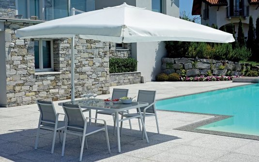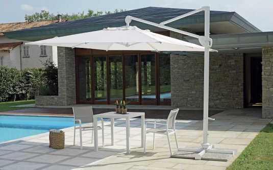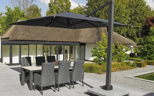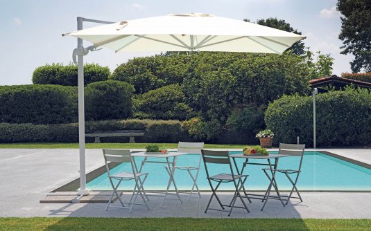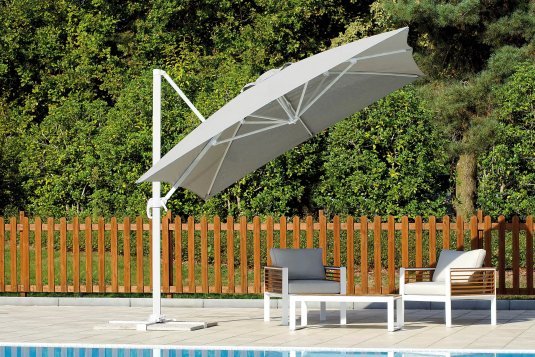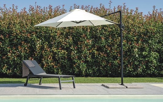 Parasol z pochylaną czaszą z dwoma płaszczyznami regulacji pozwala na swobodne dostosowanie pochylenia czaszy do kąta padania słońca w danej chwili. Oznacza to, że można pochylić czaszę w jednej płaszczyźnie, aby ochronić się przed promieniowaniem UV, a jednocześnie utrzymać ją równolegle do podłoża w drugiej płaszczyźnie, aby umożliwić swobodny dostęp do stolika i innych mebli ogrodowych.