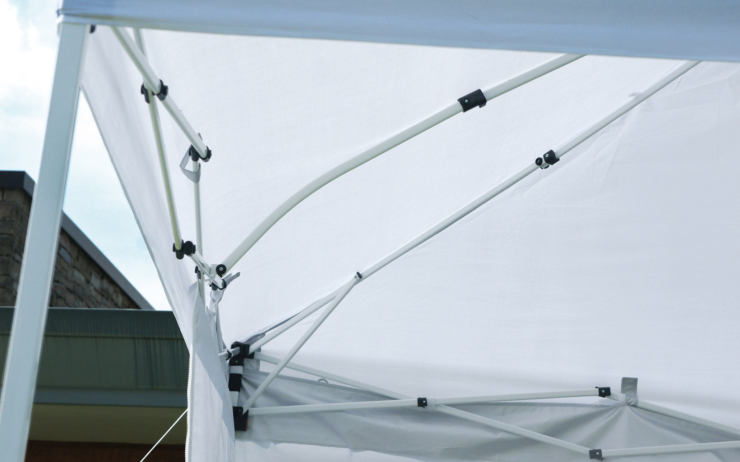 Konstrukcja z stali malowanej proszkowo – nogi teleskopowe 29×29 / 23×23 mm, dachowe kratownice 19×19 / 11×11 mm. Poszycie z poliestrowej tkaniny perlato z powłoką silver – UV reflex, wodoodporna. Wyposażony w komin przeciwwiatrowy, gniazdo na lampę, system anti-pooling.