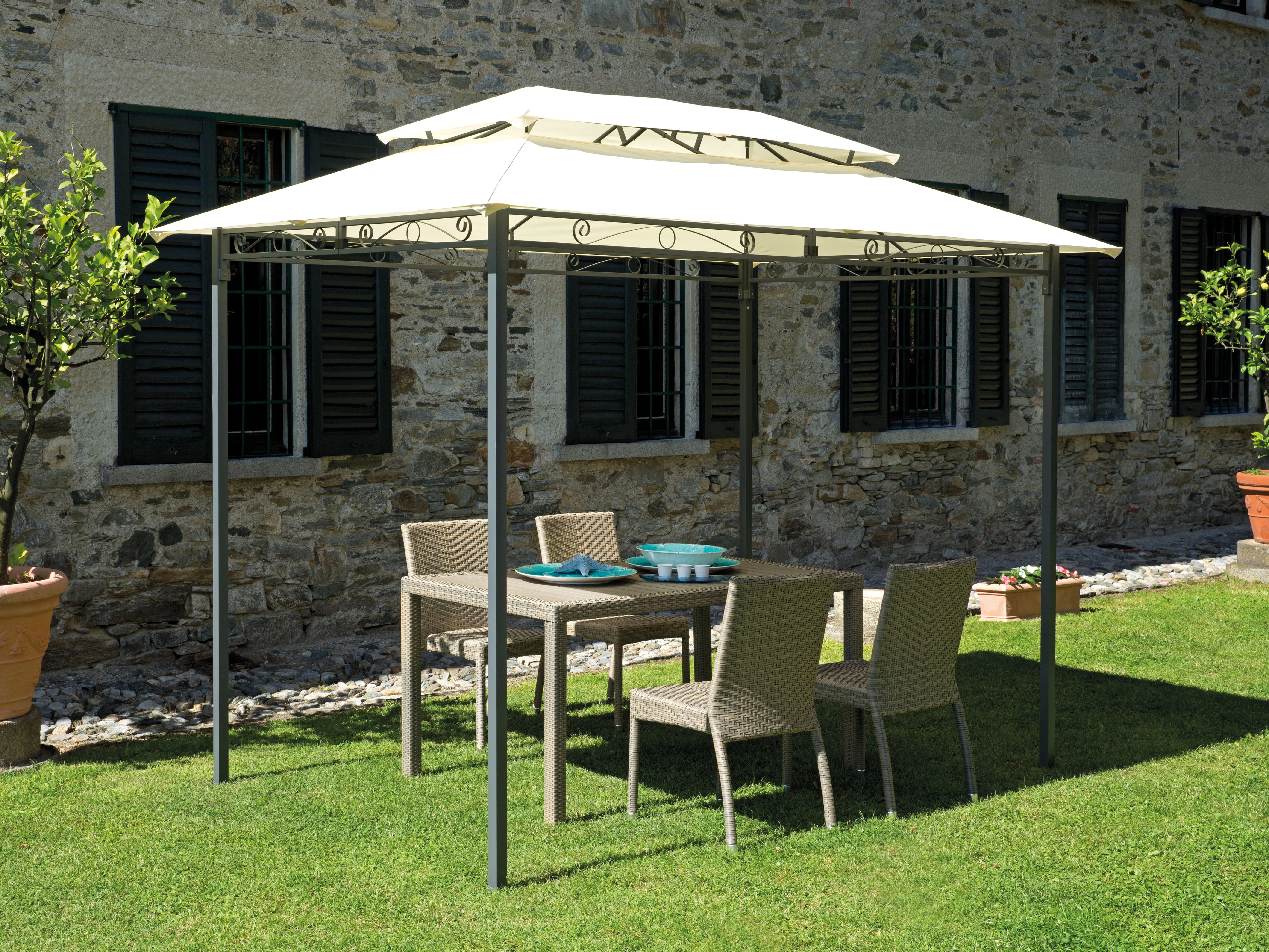 Denis jest piękną altaną wykonaną w minimalistycznym stylu. Konstrukcję wykonaną ze stali pomalowano proszkowo na uniwersalny ciemnoszary kolor. Pokrycie altany zostało wykonane z impregnowanego poliestru 180 g w eleganckim kolorze piaskowym, który doskonale harmonizuje się z każdą przestrzenią. Model występuje bez ścian bocznych.