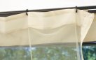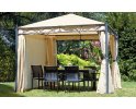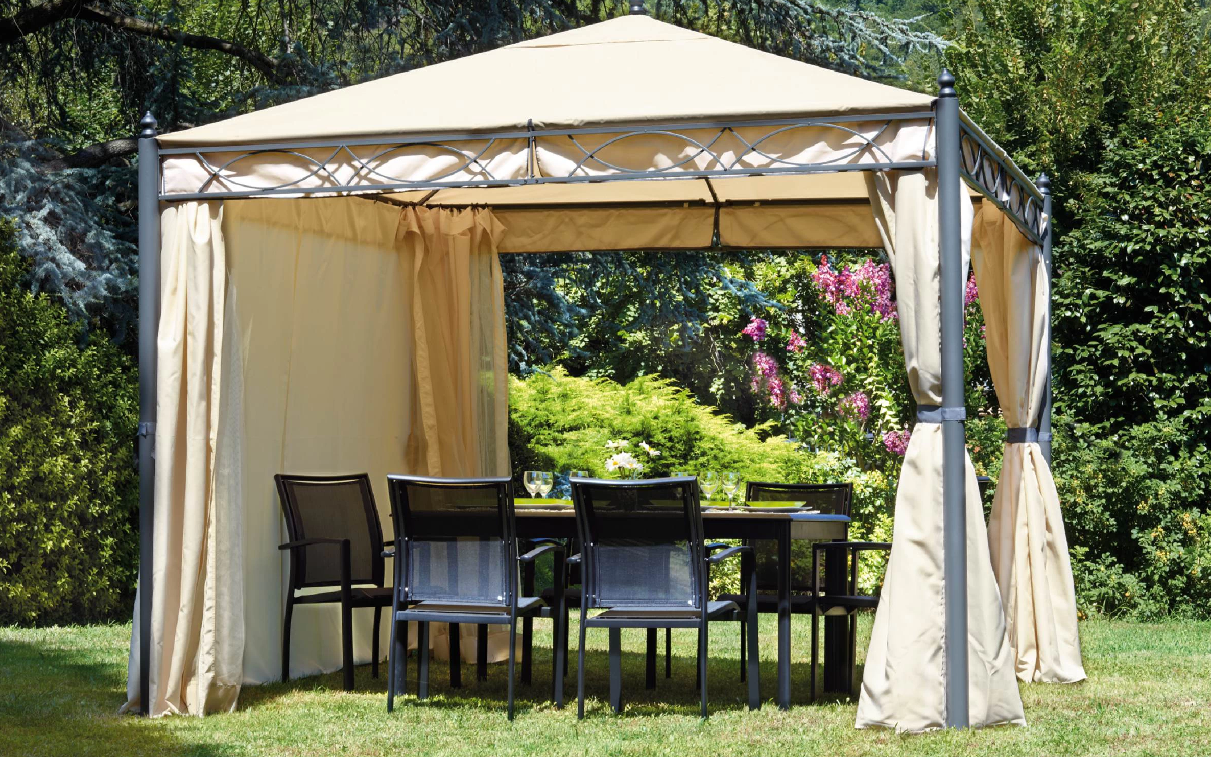 Ekskluzywny pawilon ogrodowy o wymiarach 3×3 m, idealny do ogrodu, na taras lub do strefy relaksu. Konstrukcja wykonana z stali malowanej proszkowo w kolorze antracytowym, z rurami Ø72 mm. Poszycie z tkaniny poliestrowej resinato o gramaturze 210 g/m² w kolorze piaskowym. Wyposażony w system przeciwwiatrowy, zasłony boczne i moskitiery w kolorze ecru.