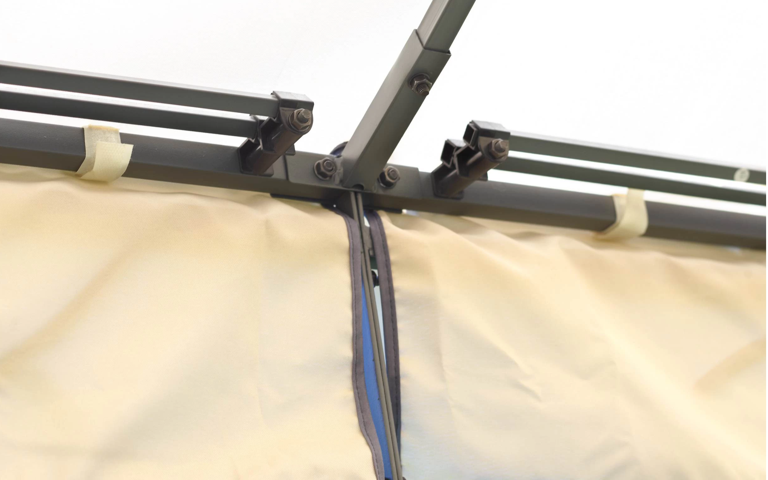 Stelaż z rur stalowych Ø72 mm malowanych proszkowo w kolorze antracytowym. Poszycie z tkaniny poliestrowej resinato 210 g/m² w kolorze piaskowym. Zasłony i moskitiery w kolorze ecru. Konstrukcja wyposażona w system przeciwwiatrowy.