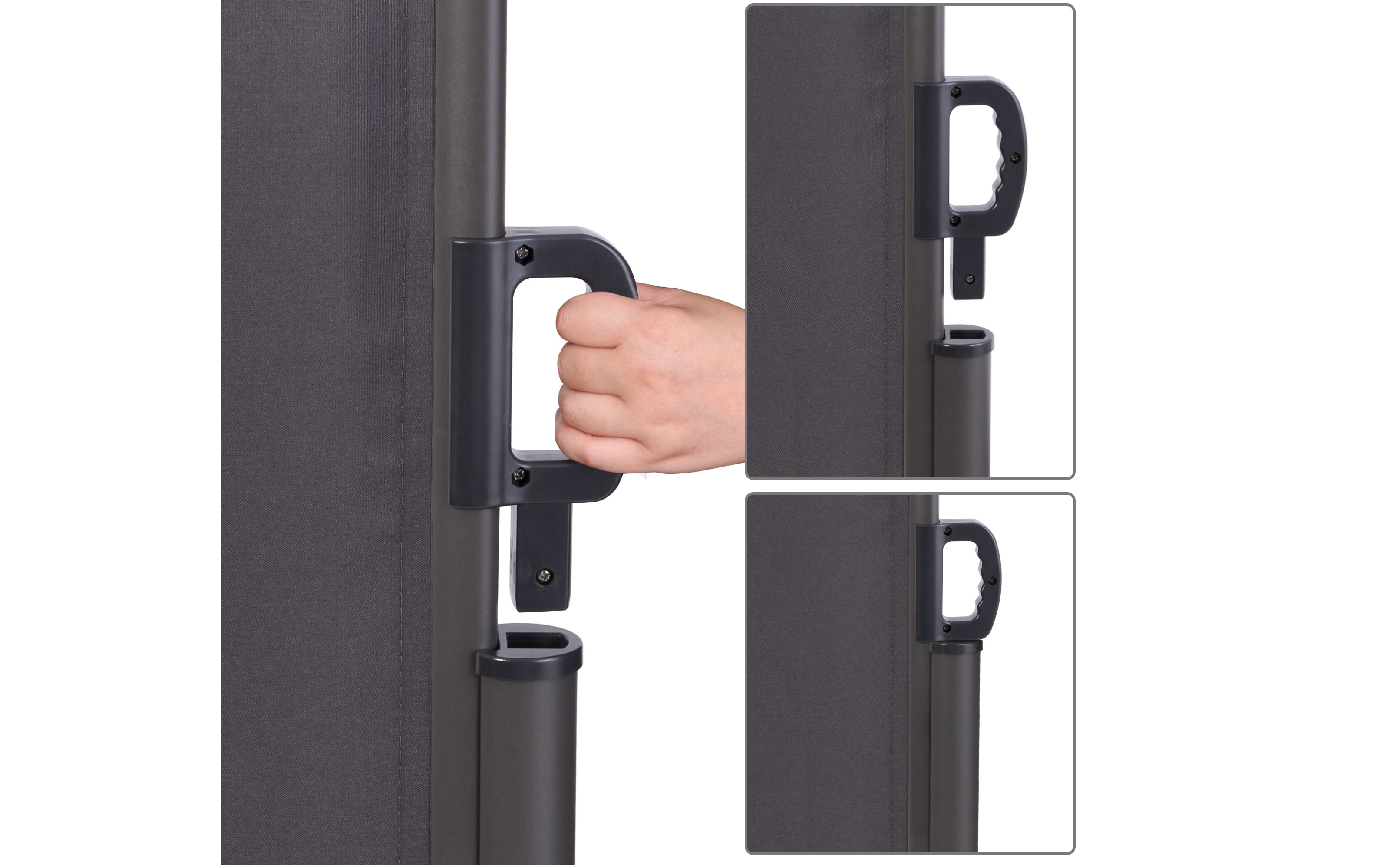 W razie potrzeby można ją szybko i łatwo wysunąć i zwinąć (zalecane przy silnym wietrze, ulewnym deszczu i śniegu). Rozwiniętą tkaninę markizy mocuje się w gnieĹşdzie słupka mocowanego do podłoża. Blokada zabezpieczająca przed dziećmi na uchwycie zmniejsza ryzyko niezamierzonego złożenie i zapewnia bezpieczeństwo.