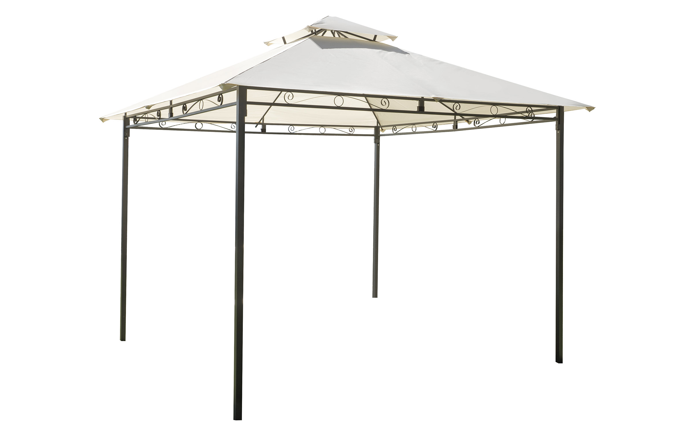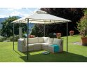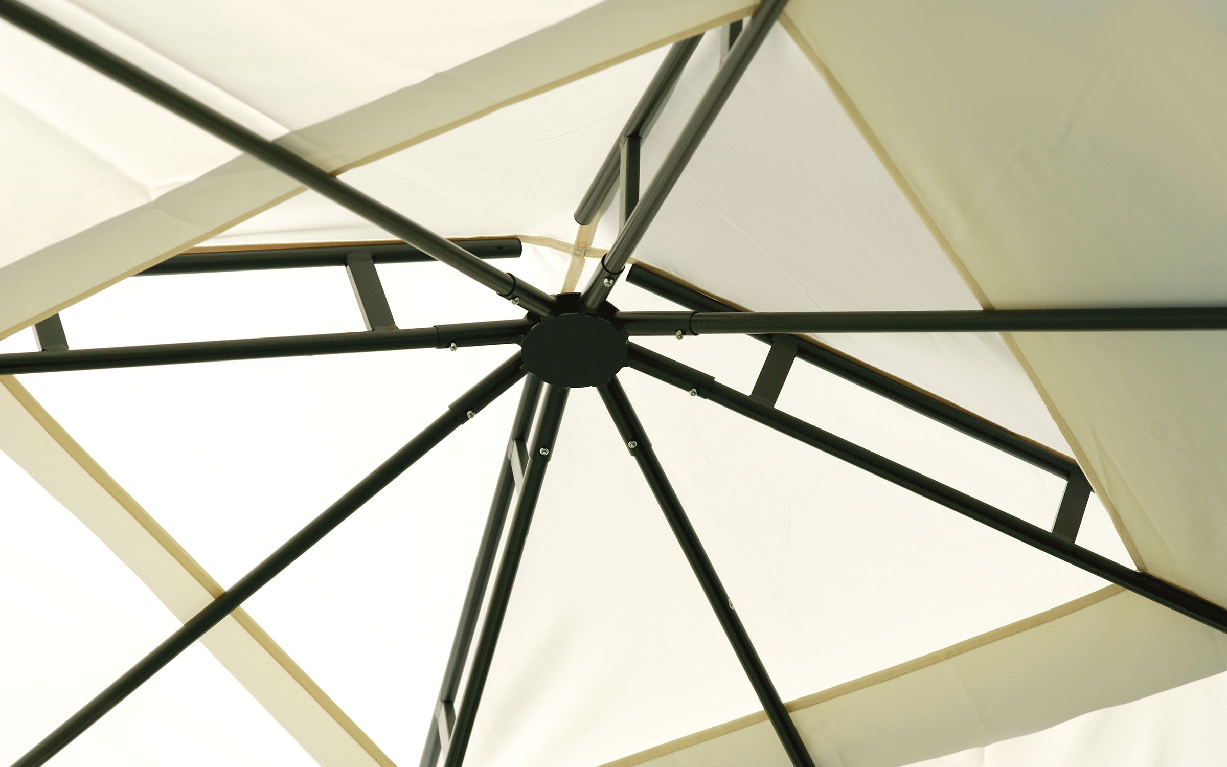 Stylowy namiot ogrodowy o wymiarach 3×3 m, idealny na taras, balkon lub do ogrodu. Konstrukcja wykonana z stali malowanej proszkowo w kolorze antracytowym. Poszycie z tkaniny poliestrowej ecru o wysokiej odporności na warunki atmosferyczne.