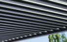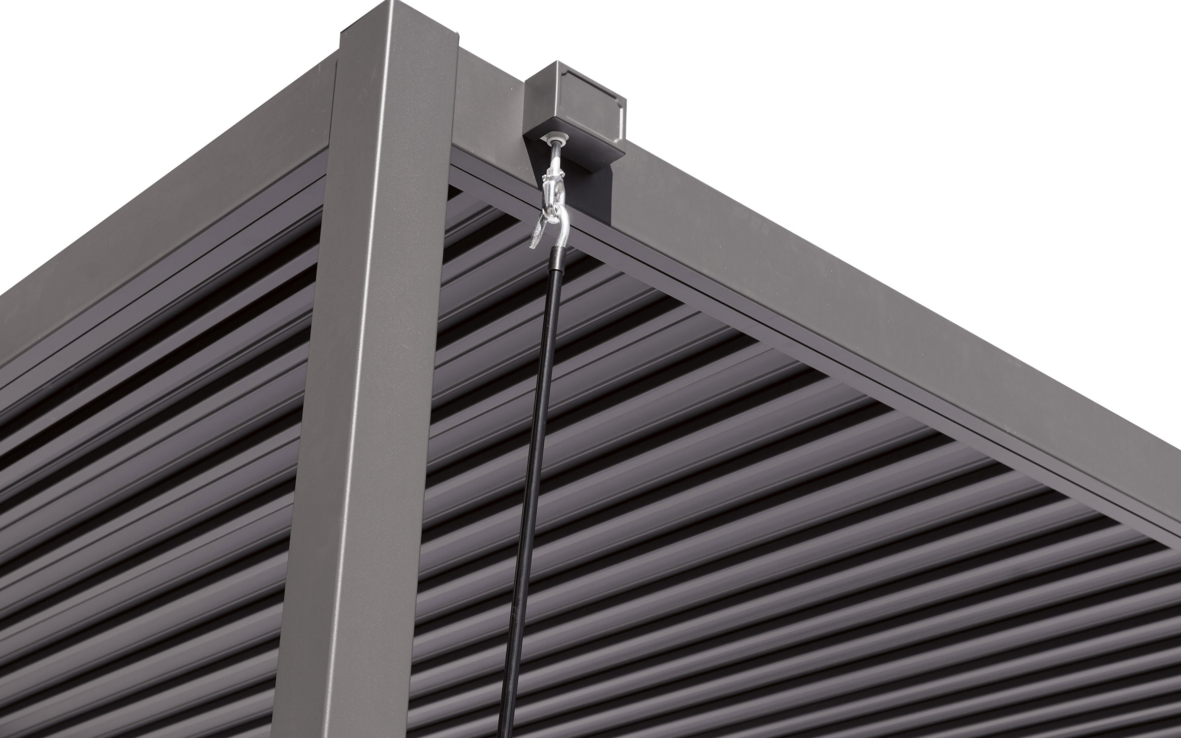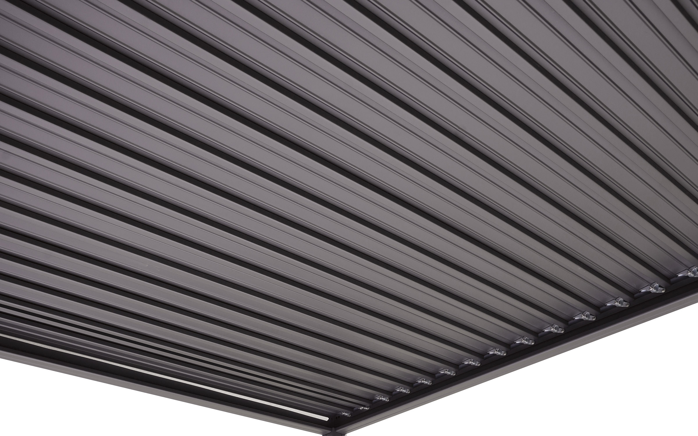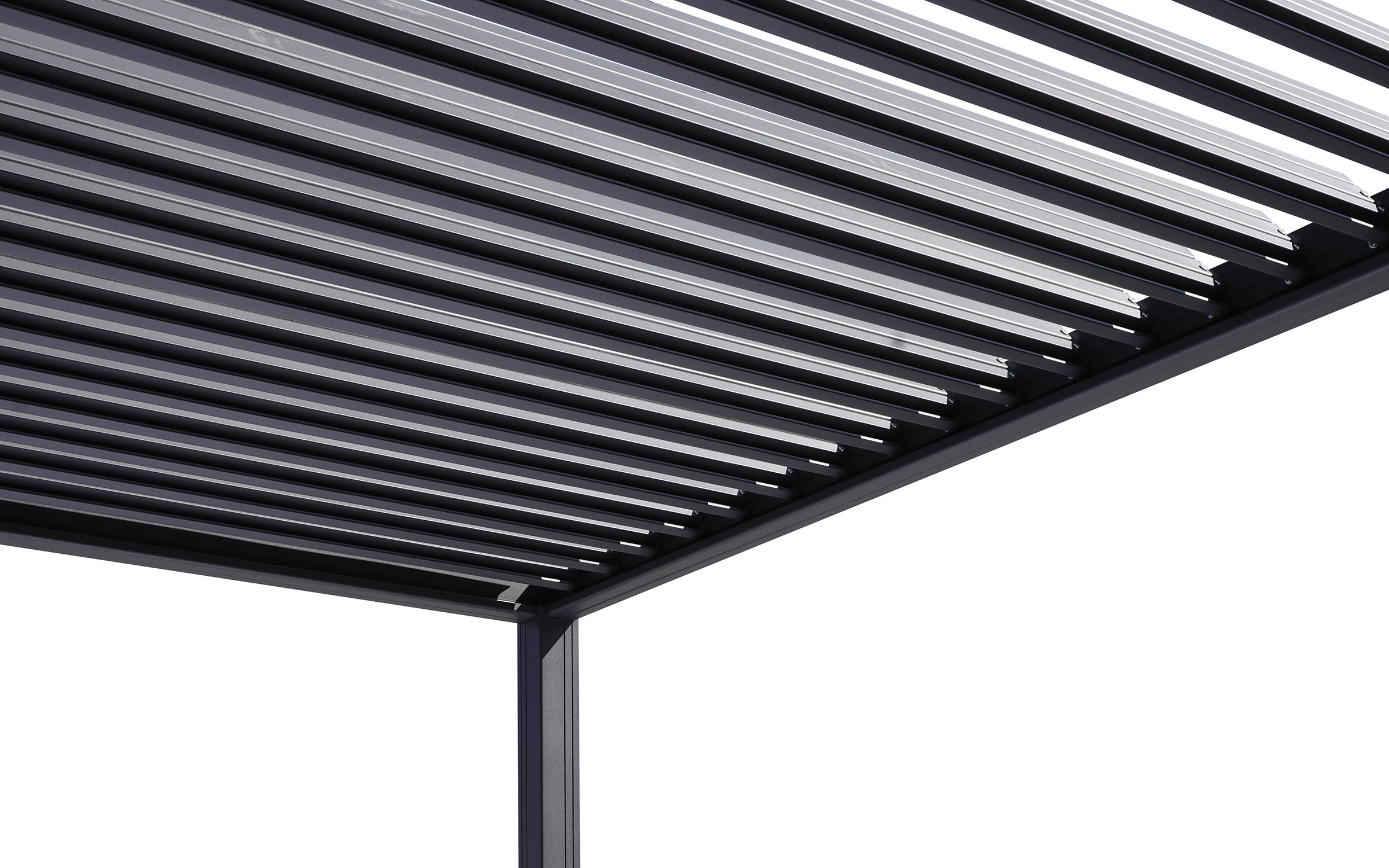 Konstrukcja z aluminium i stali malowanej proszkowo w kolorze antracytowym. Słupy nośne 90×90 mm z aluminium. Belki dachowe 120×30 mm i 147×30 mm. Dach z lameli aluminiowych regulowanych za pomocą korby stalowej. System odprowadzania wody zintegrowany wewnątrz słupów.