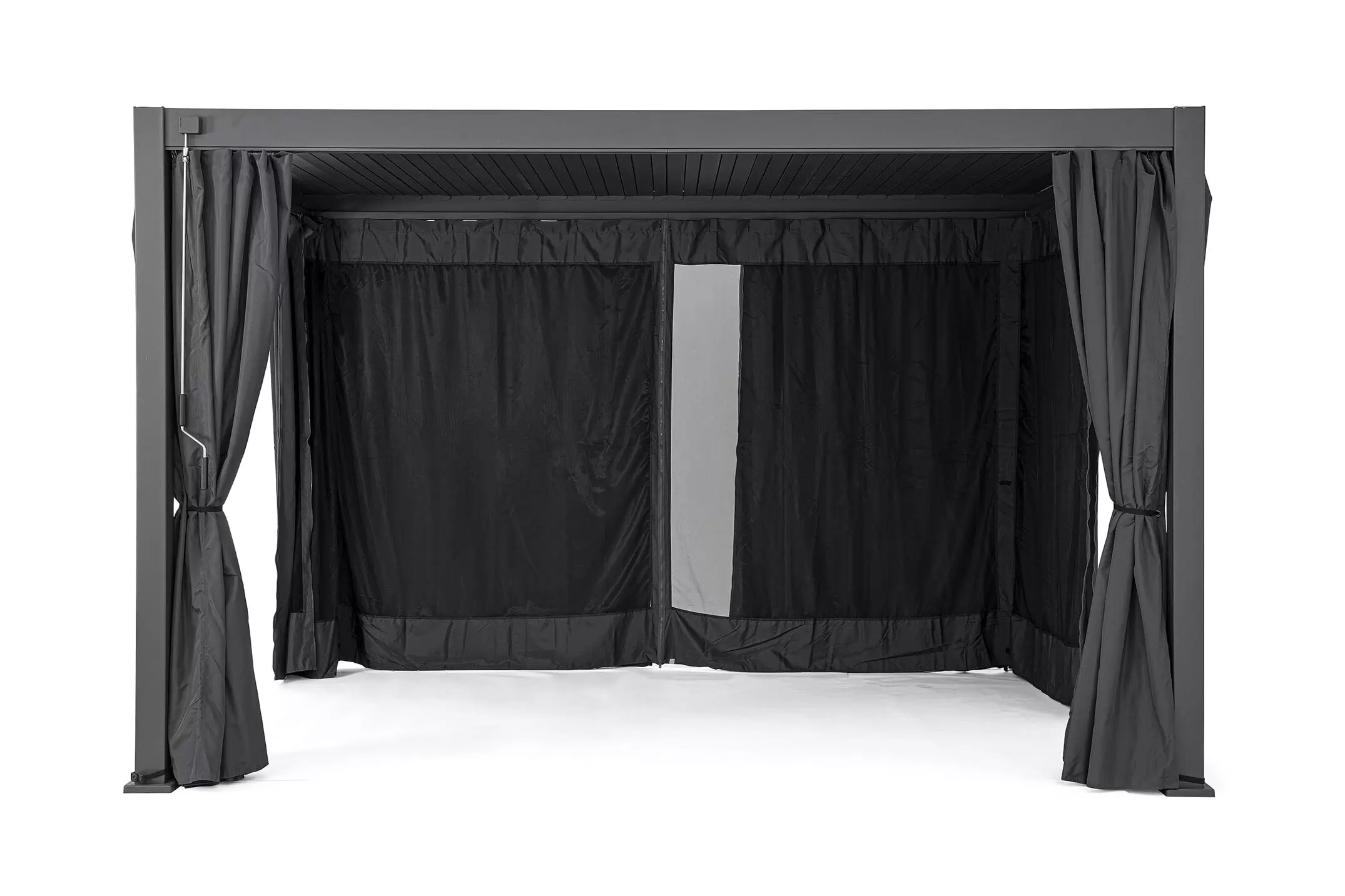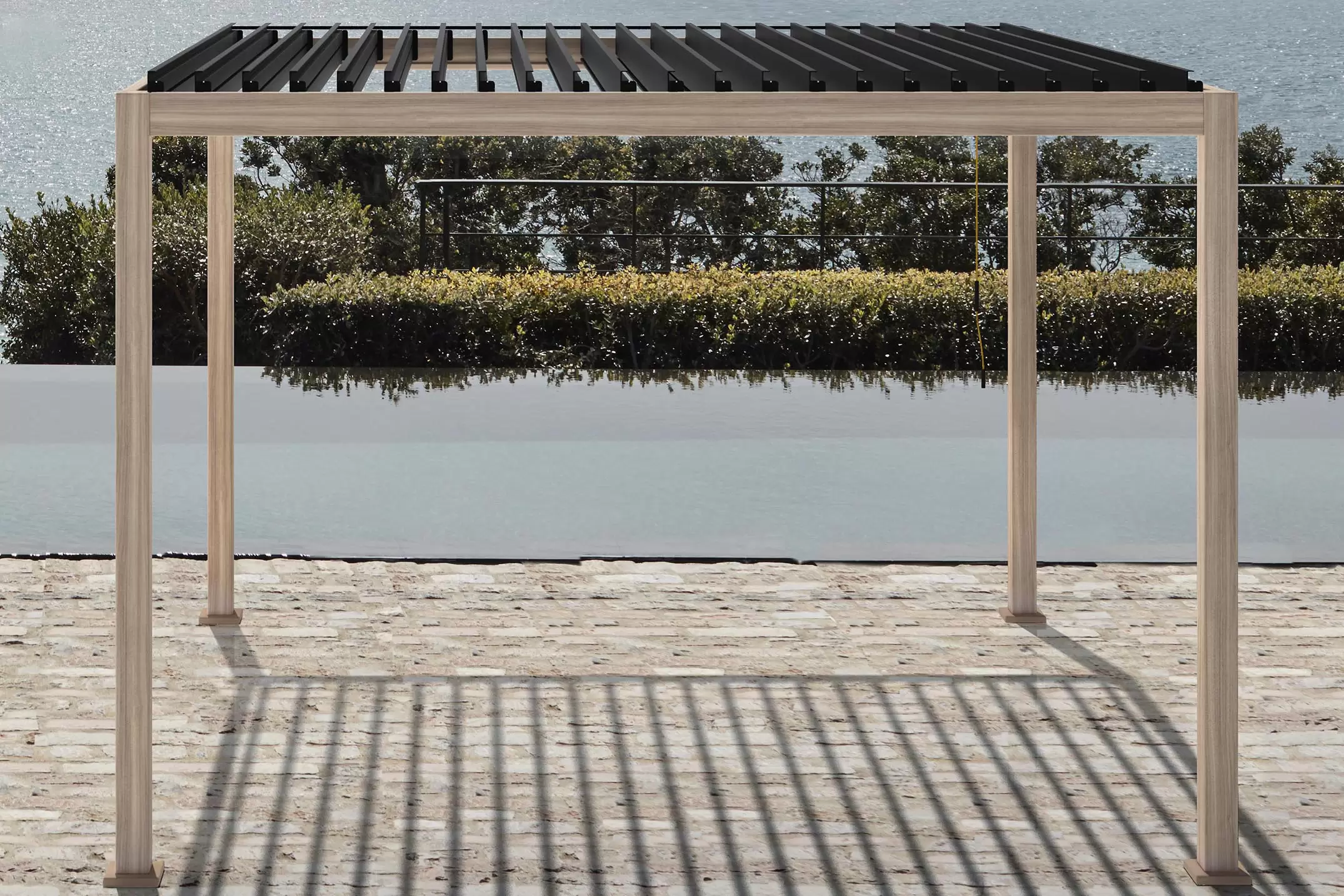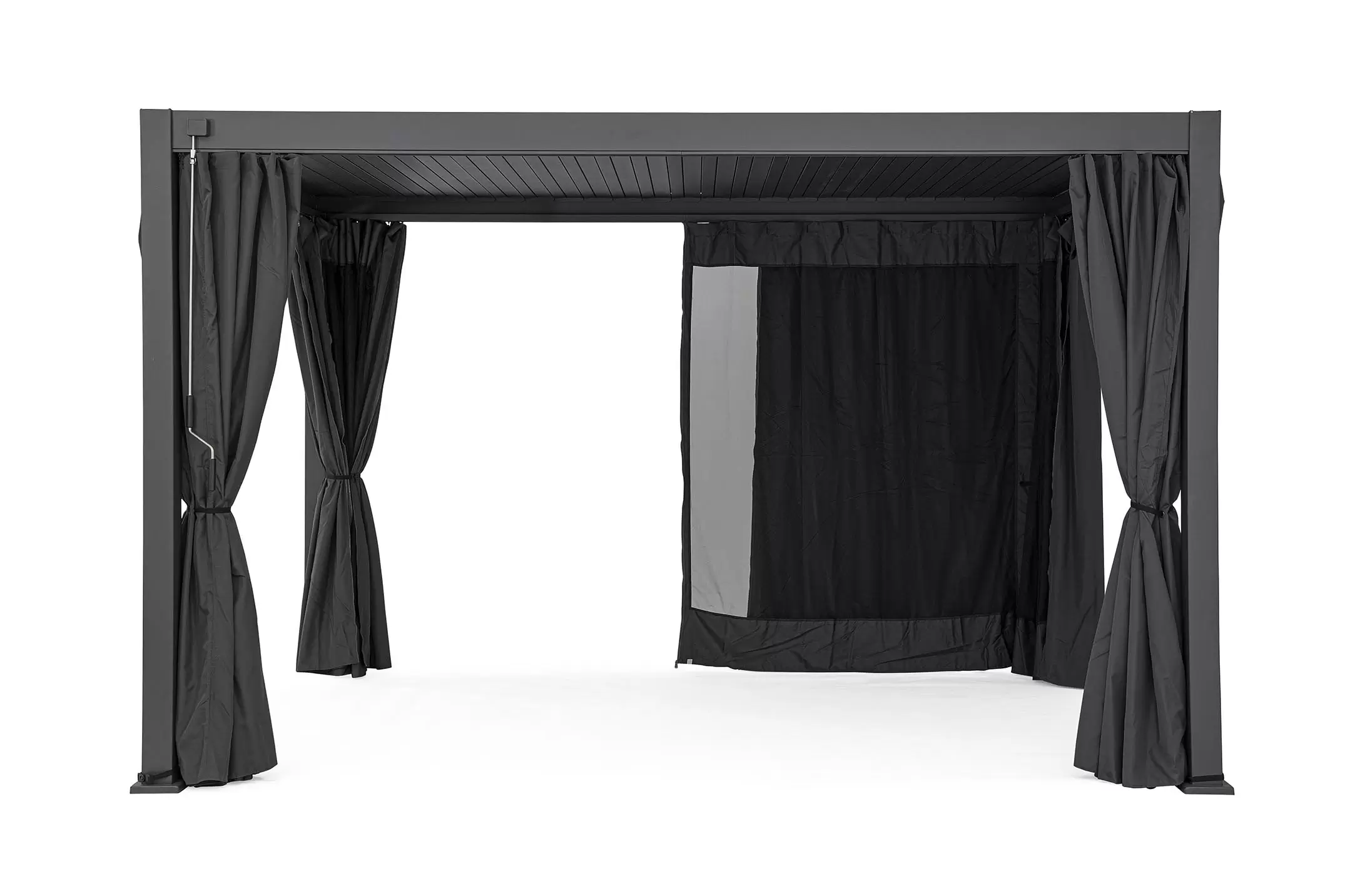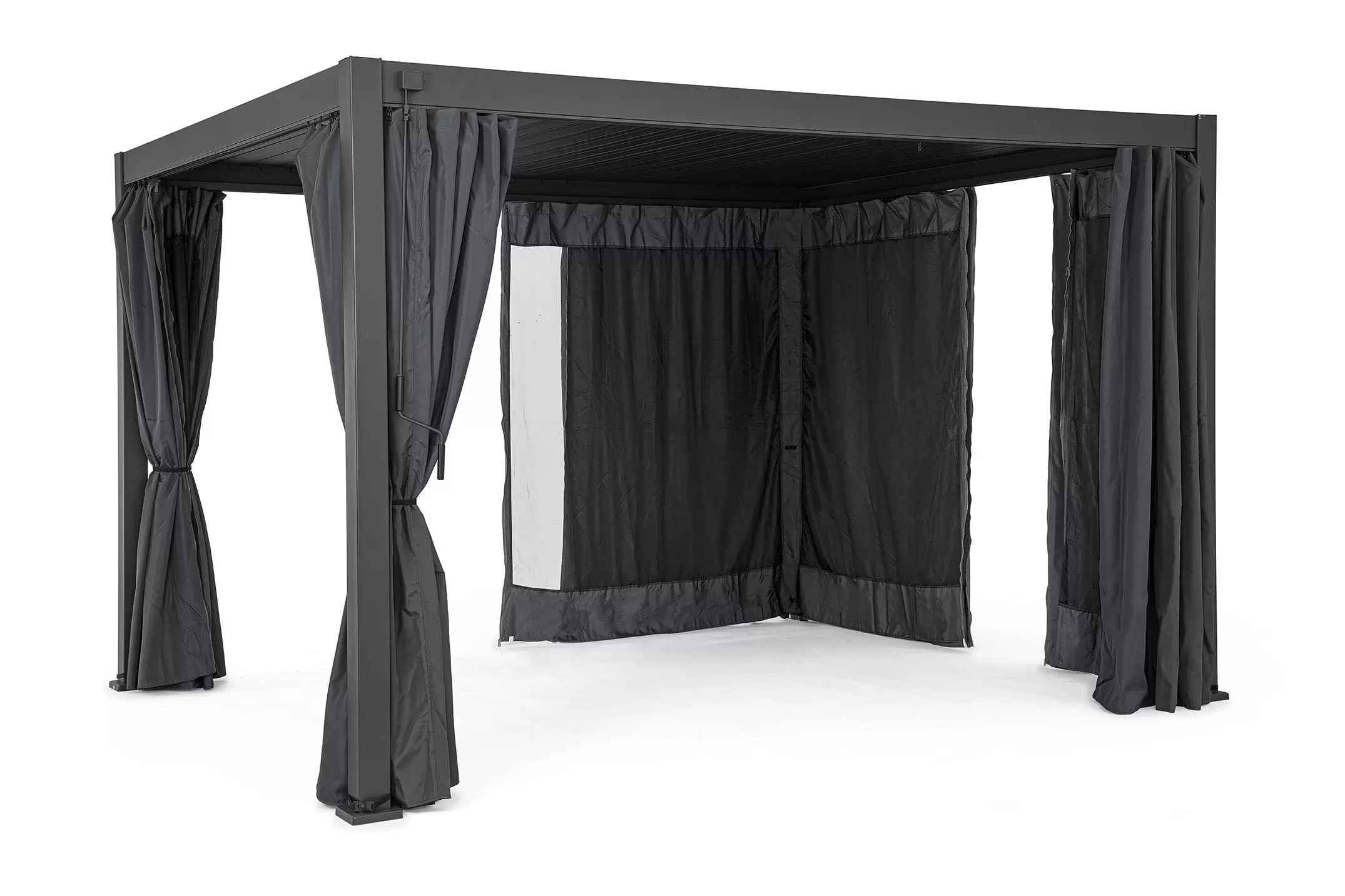 Pawilon ogrodowy aluminiowy do zadaszenia tarasu z dachem z obracanymi lamelami pozwalającymi całkowicie chronić przed słońcem i deszczem.