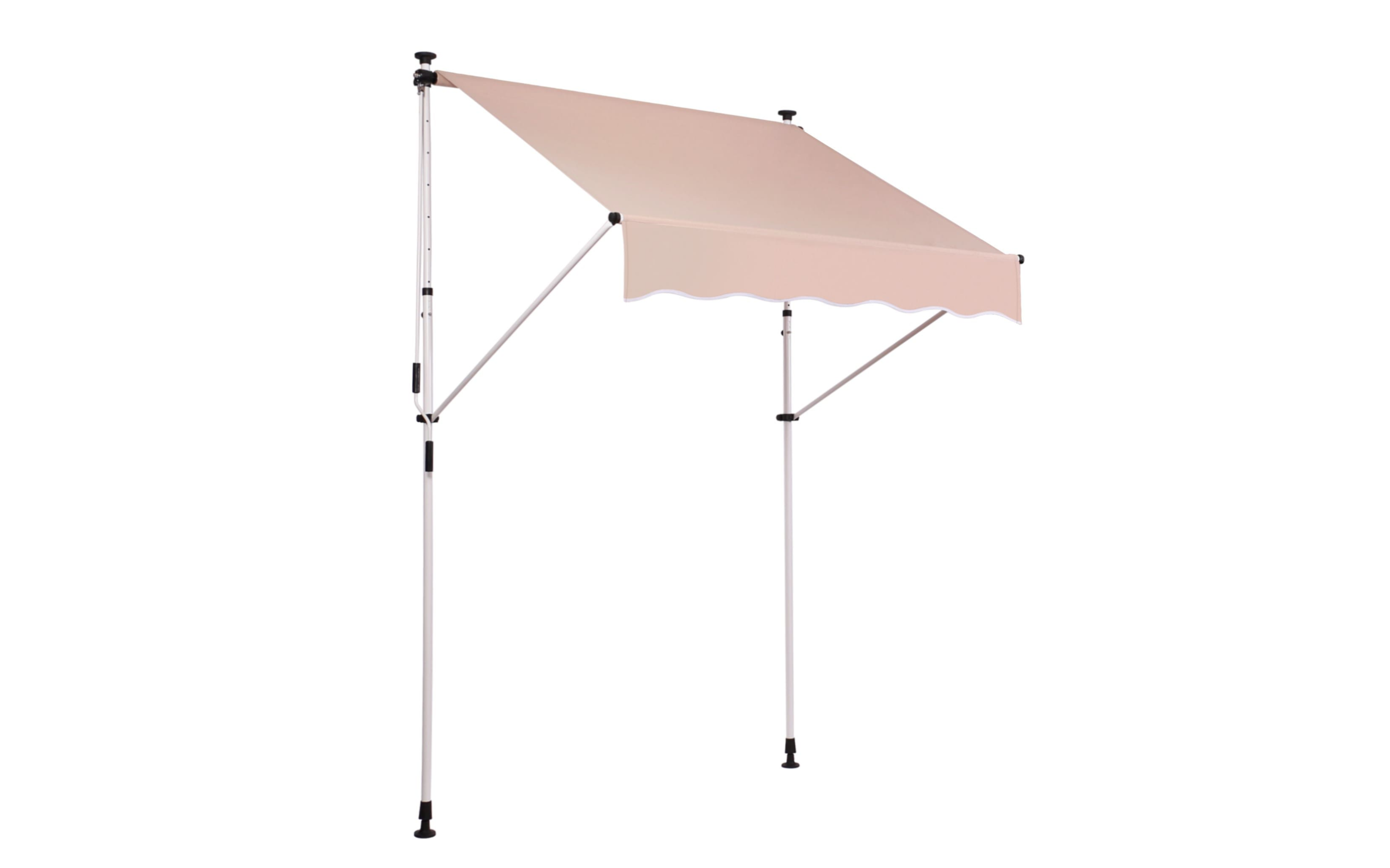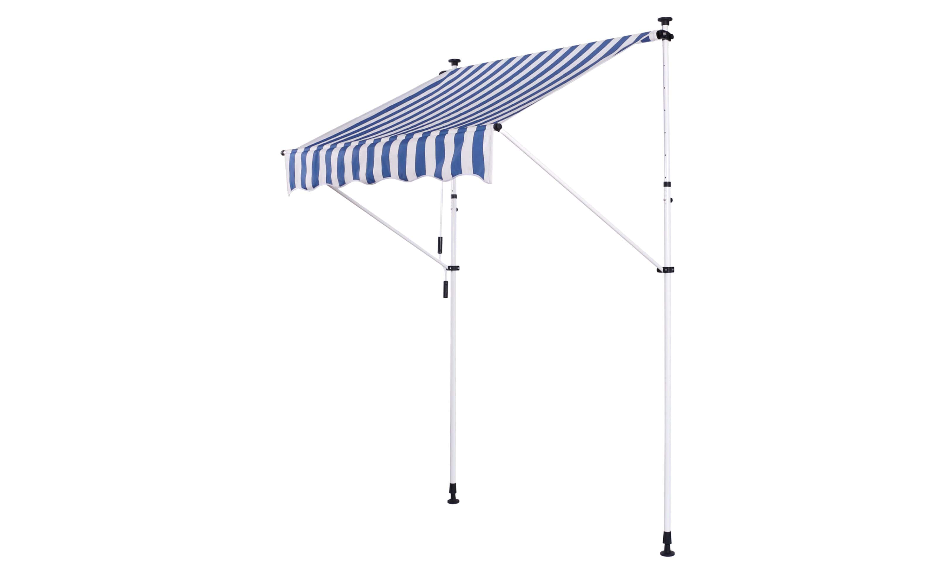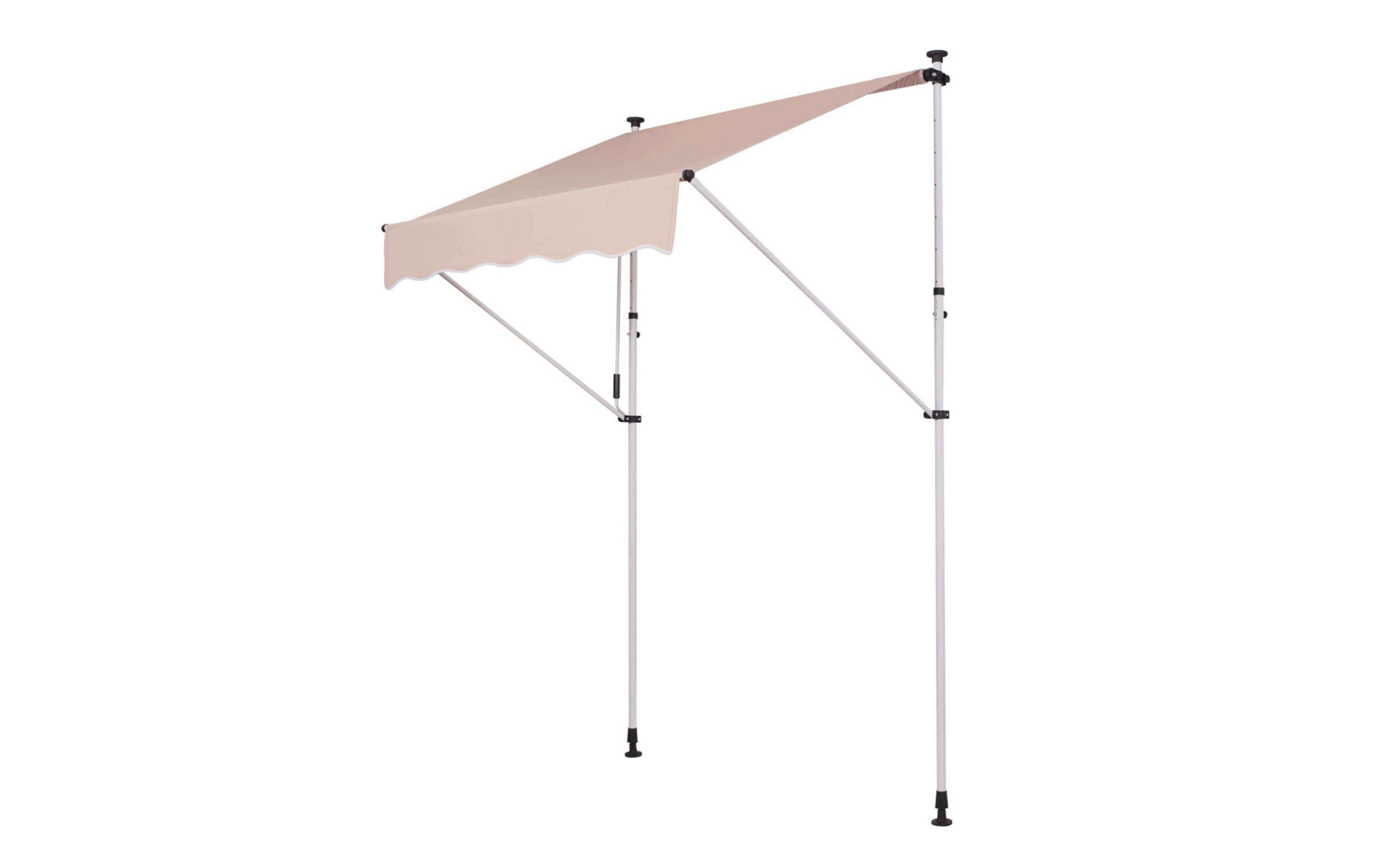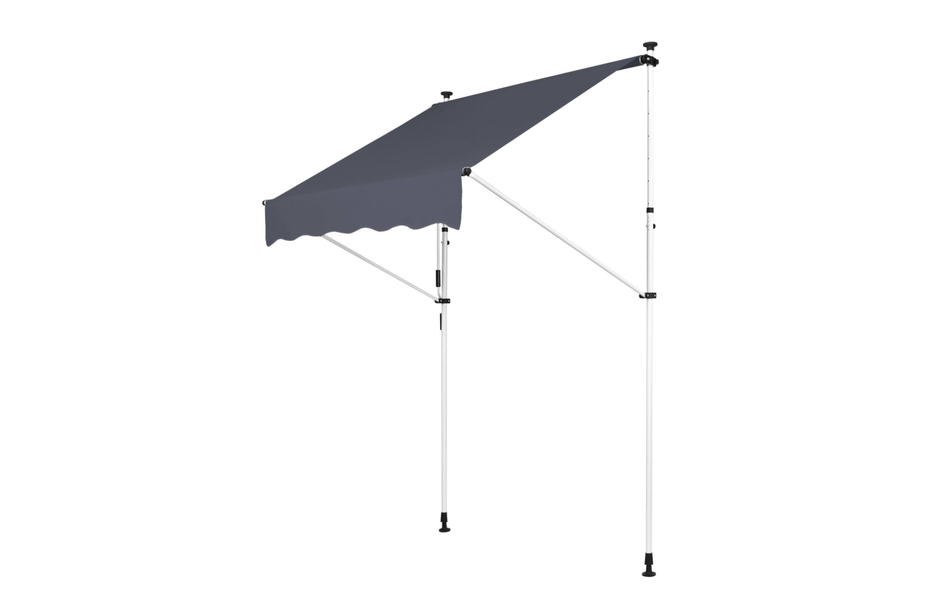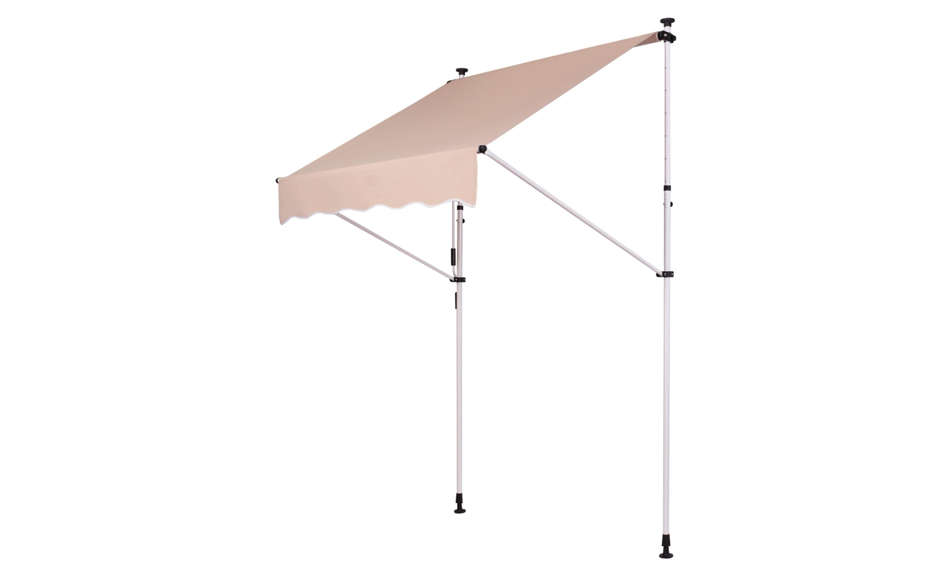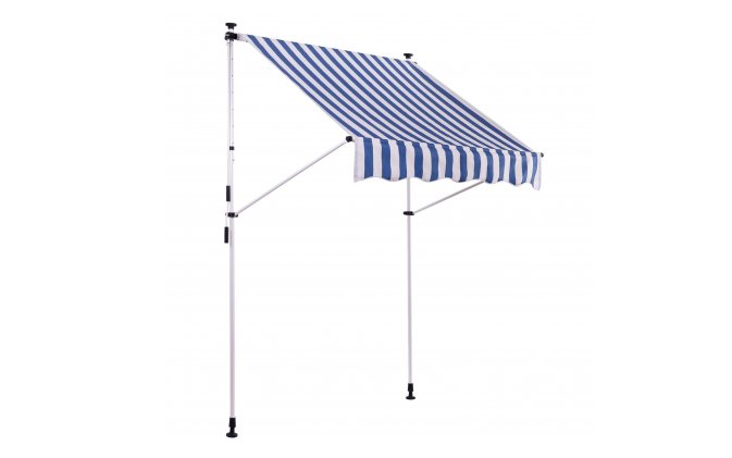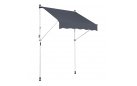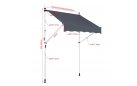 Do montażu potrzebny jest tylko mały występ na suficie, w którym można umieścić górny element rozporowy. wysokość występu od 200 do 300 cm. Aby rama mogła być odporna na lekkie podmuchy wiatru, jest wykonana z wytrzymałej i nierdzewnej stali. Maksymalnie markizę zasłania do 120 cm - regulacja za pomocą ręcznej korbki. Długość zadaszenia 150 cm. Kąt nachylenia markizy można regulować w pewnym zakresie.