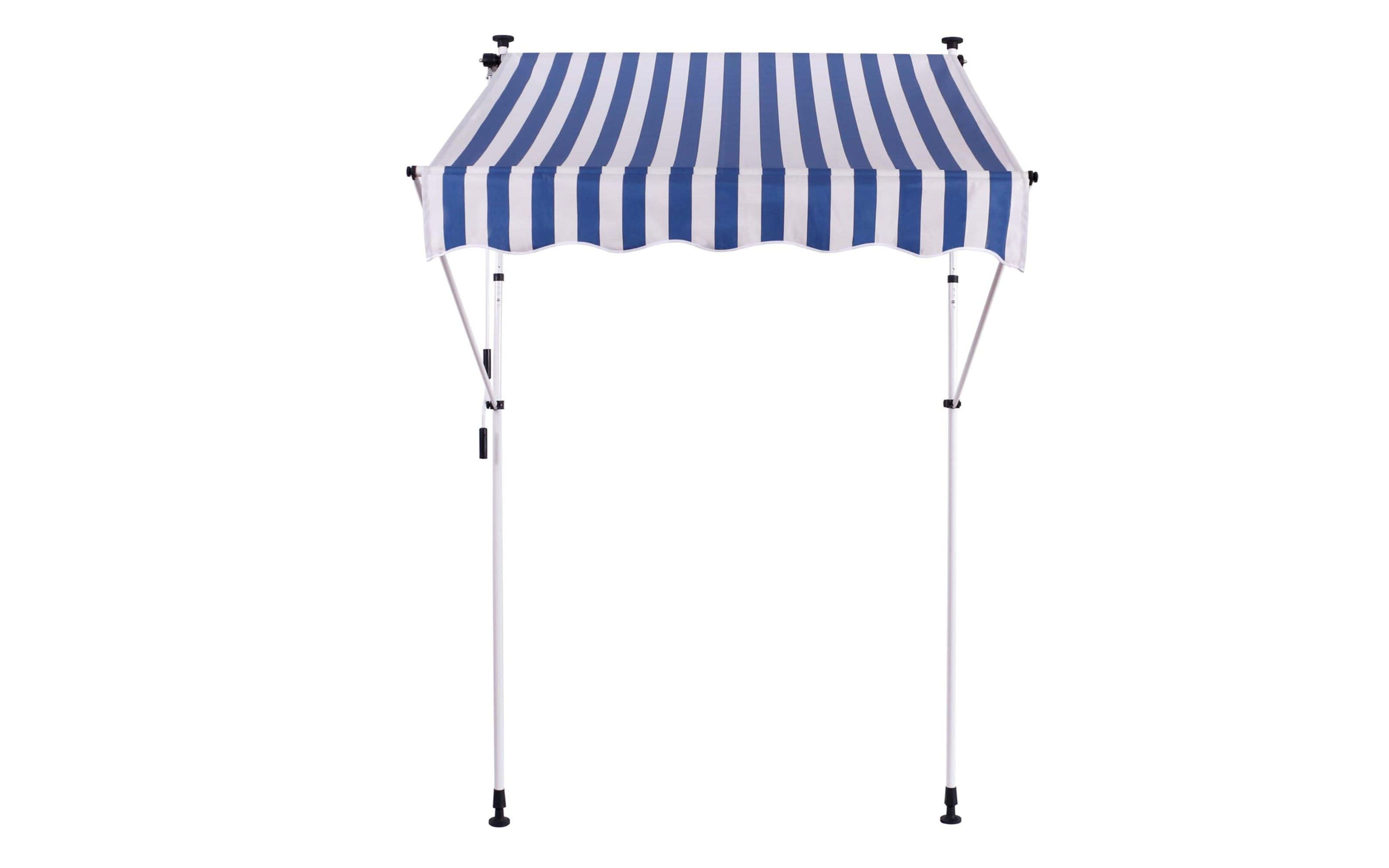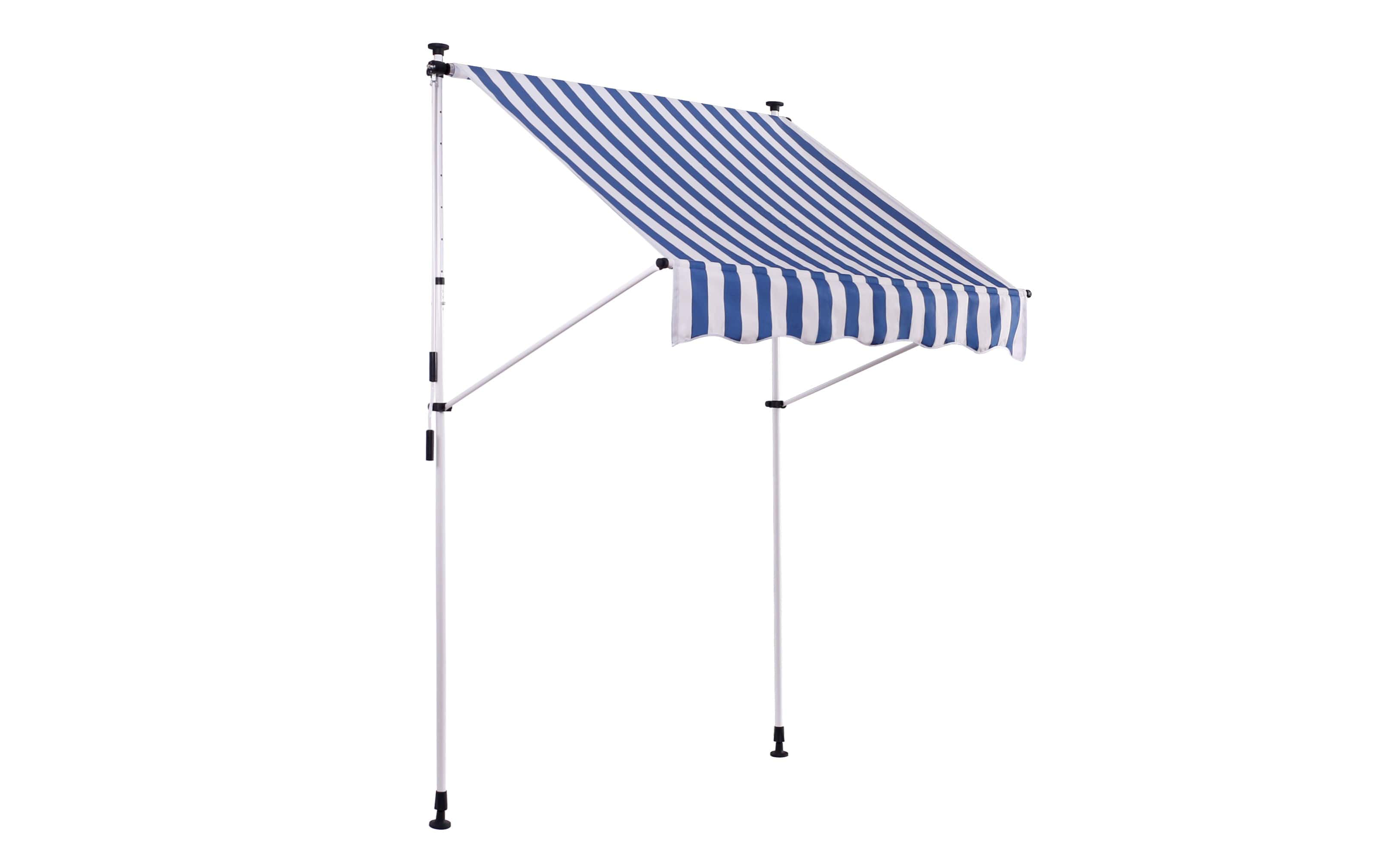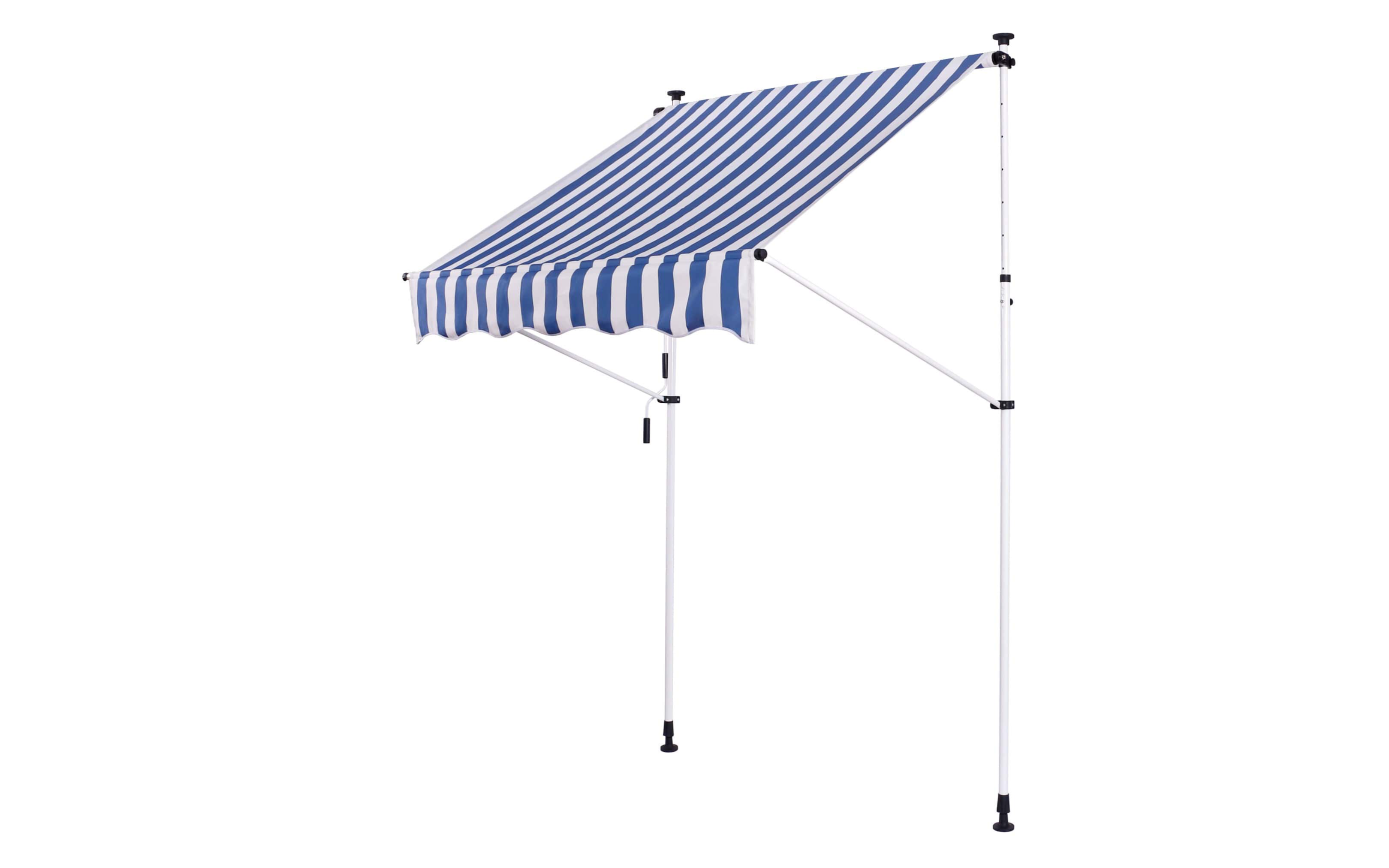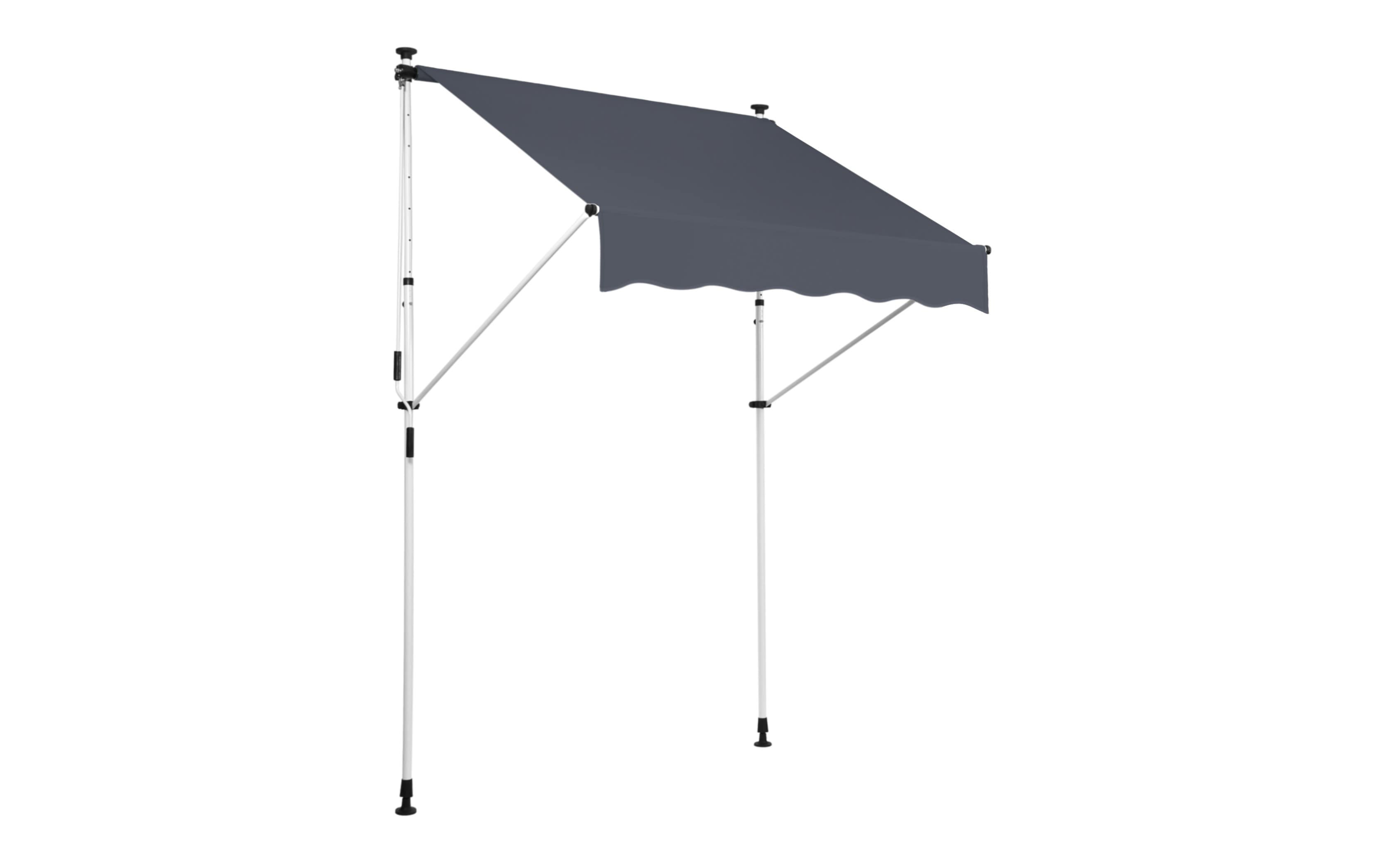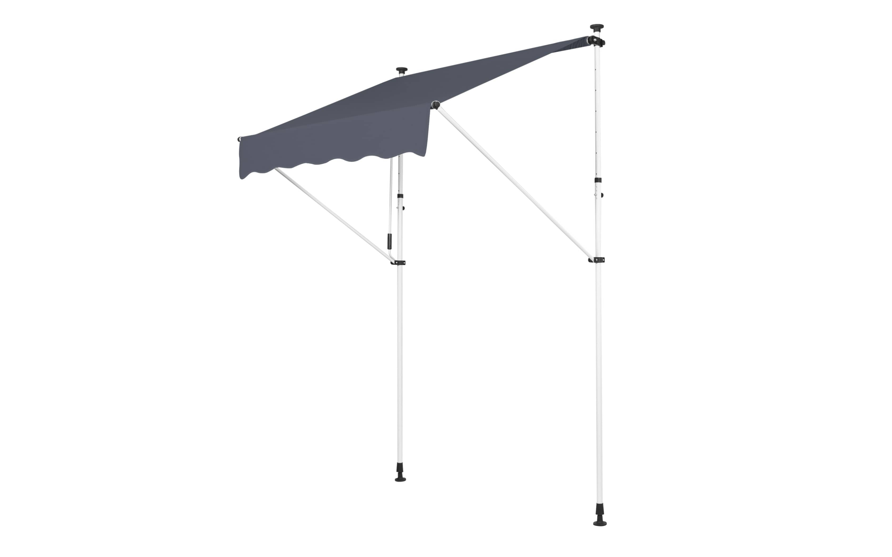 Do montażu potrzebny jest tylko mały występ na suficie, w którym można umieścić górny element rozporowy. wysokość występu od 200 do 300 cm. Aby rama mogła być odporna na lekkie podmuchy wiatru, jest wykonana z wytrzymałej i nierdzewnej stali. Maksymalnie markizę zasłania do 120 cm - regulacja za pomocą ręcznej korbki. Długość zadaszenia 150 cm. Kąt nachylenia markizy można regulować w pewnym zakresie.
