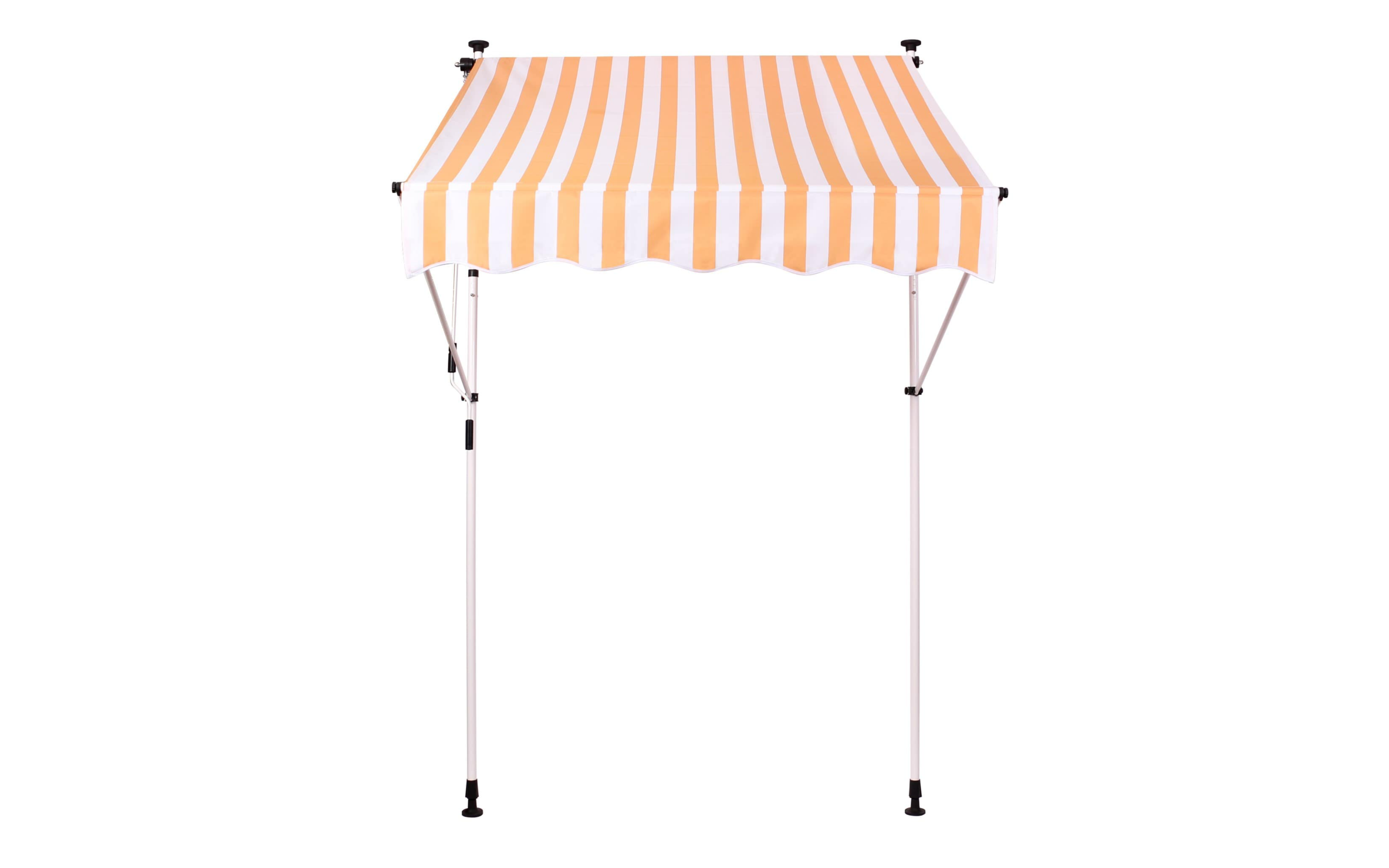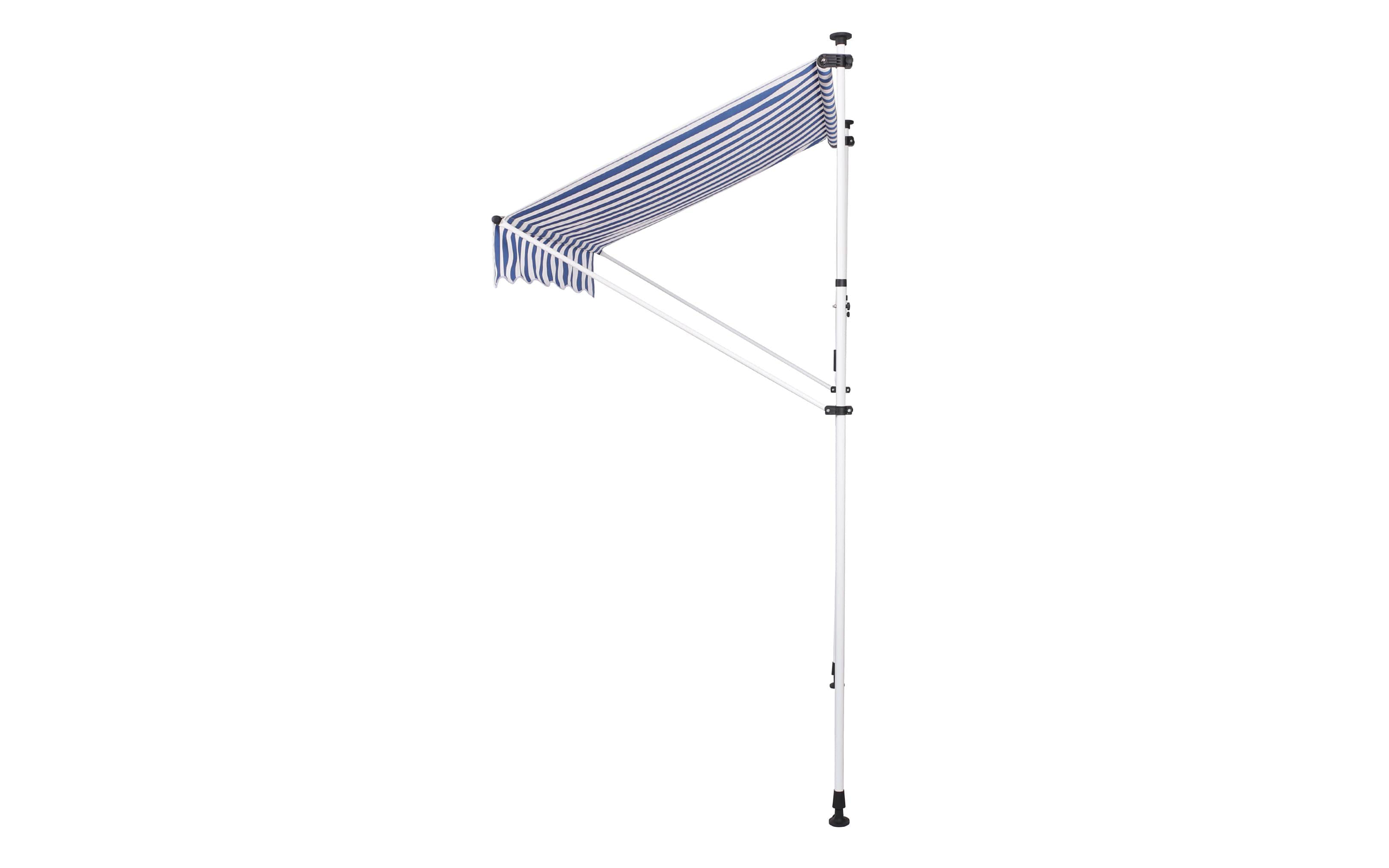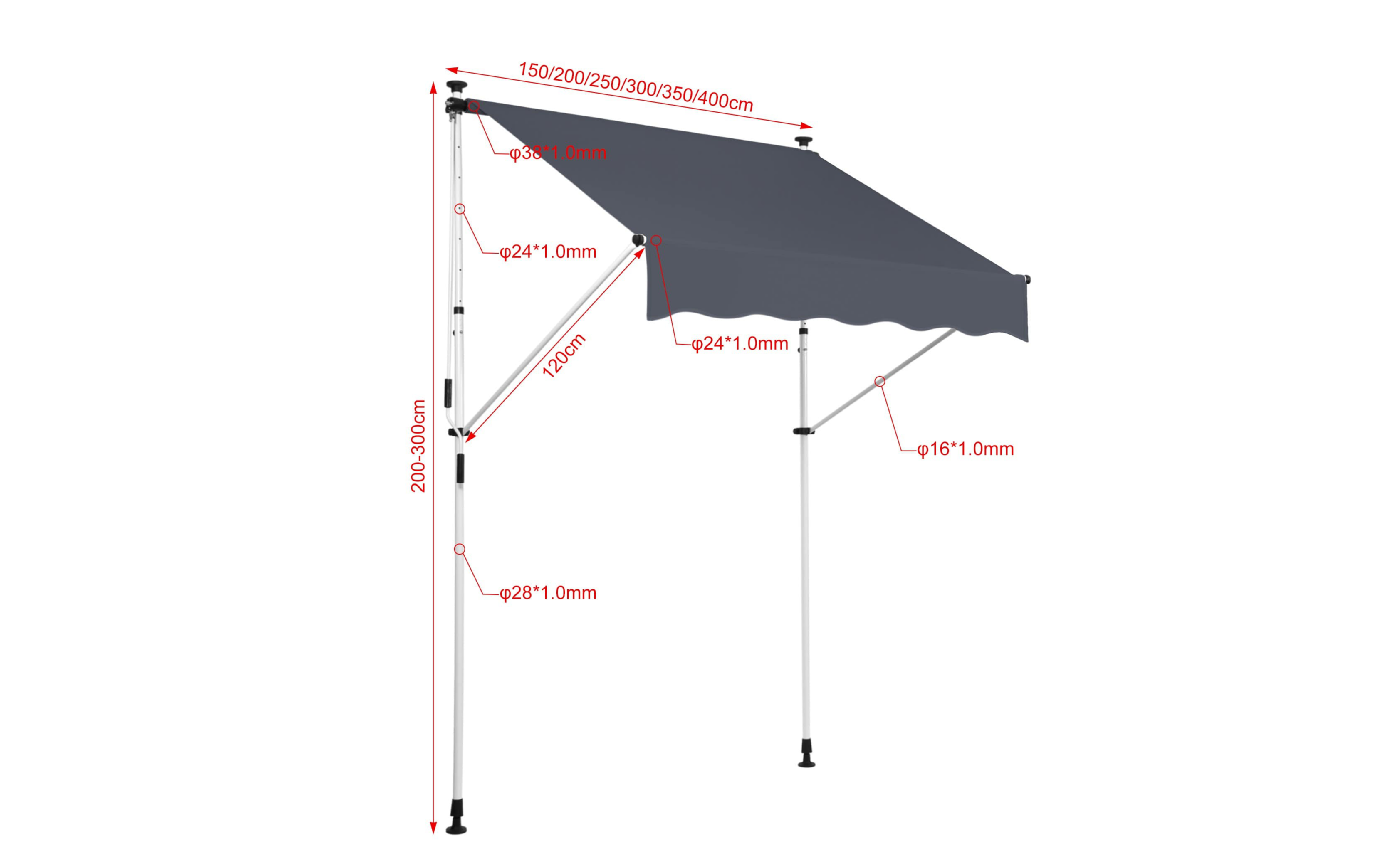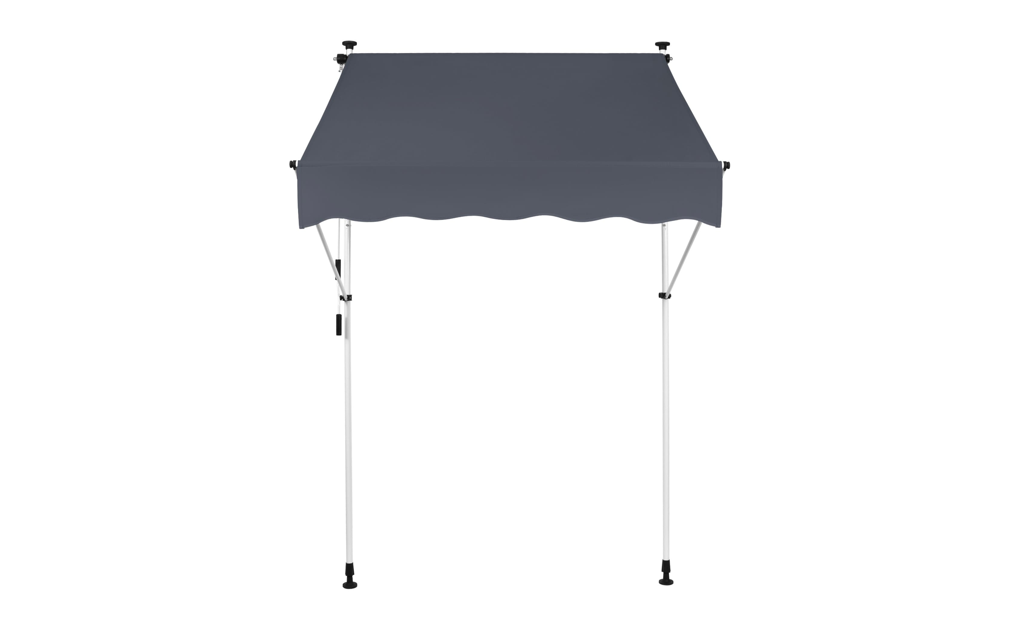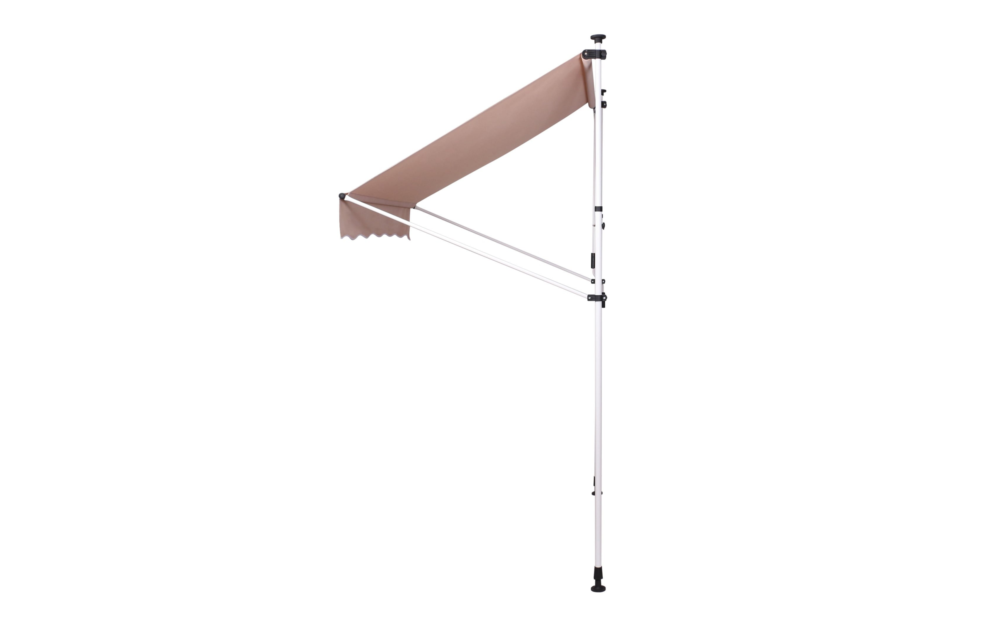 Do montażu potrzebny jest tylko mały występ na suficie, w którym można umieścić górny element rozporowy. wysokość występu od 200 do 300 cm. Aby rama mogła być odporna na lekkie podmuchy wiatru, jest wykonana z wytrzymałej i nierdzewnej stali. Maksymalnie markizę zasłania do 120 cm - regulacja za pomocą ręcznej korbki. Długość zadaszenia 150 cm. Kąt nachylenia markizy można regulować w pewnym zakresie.