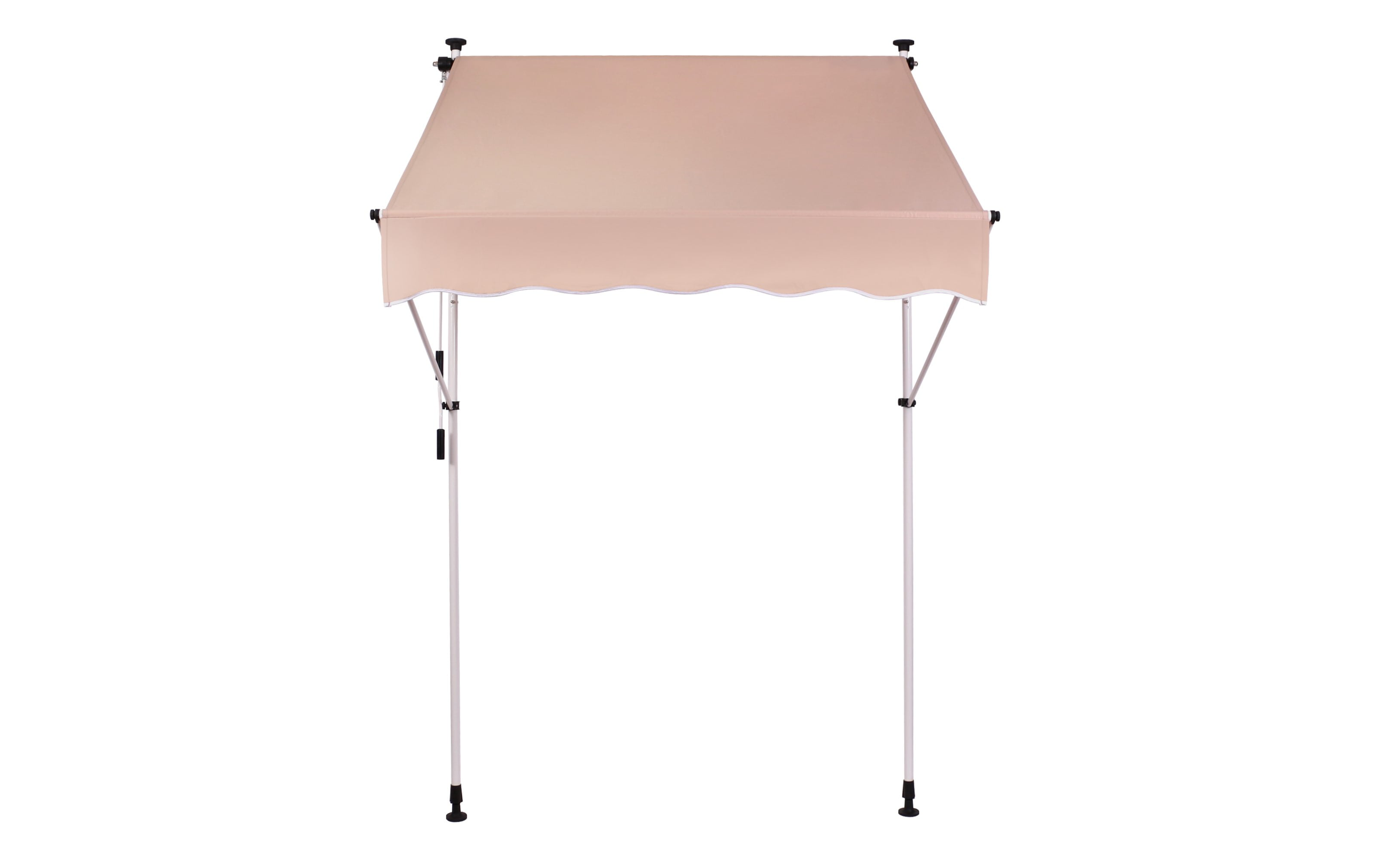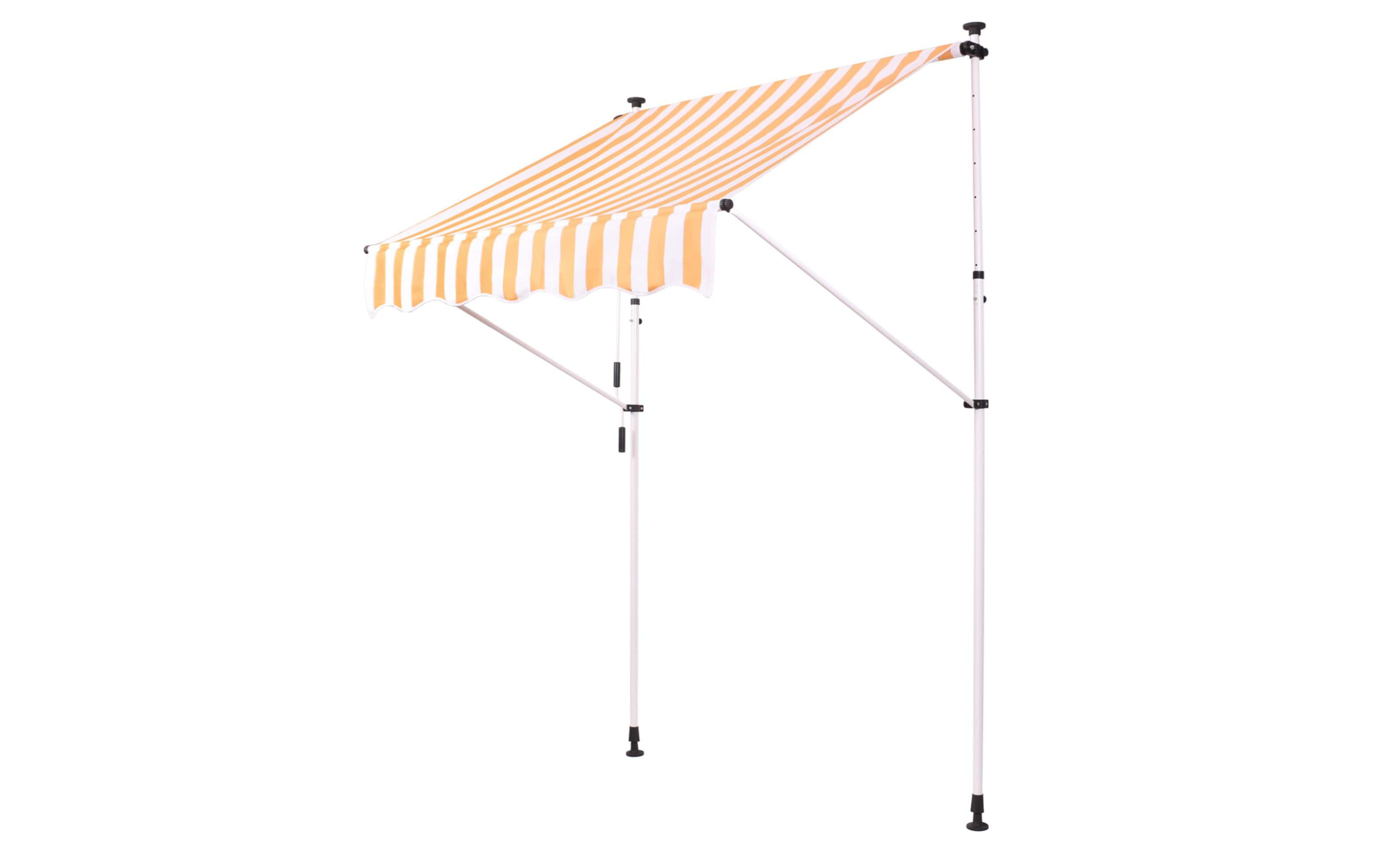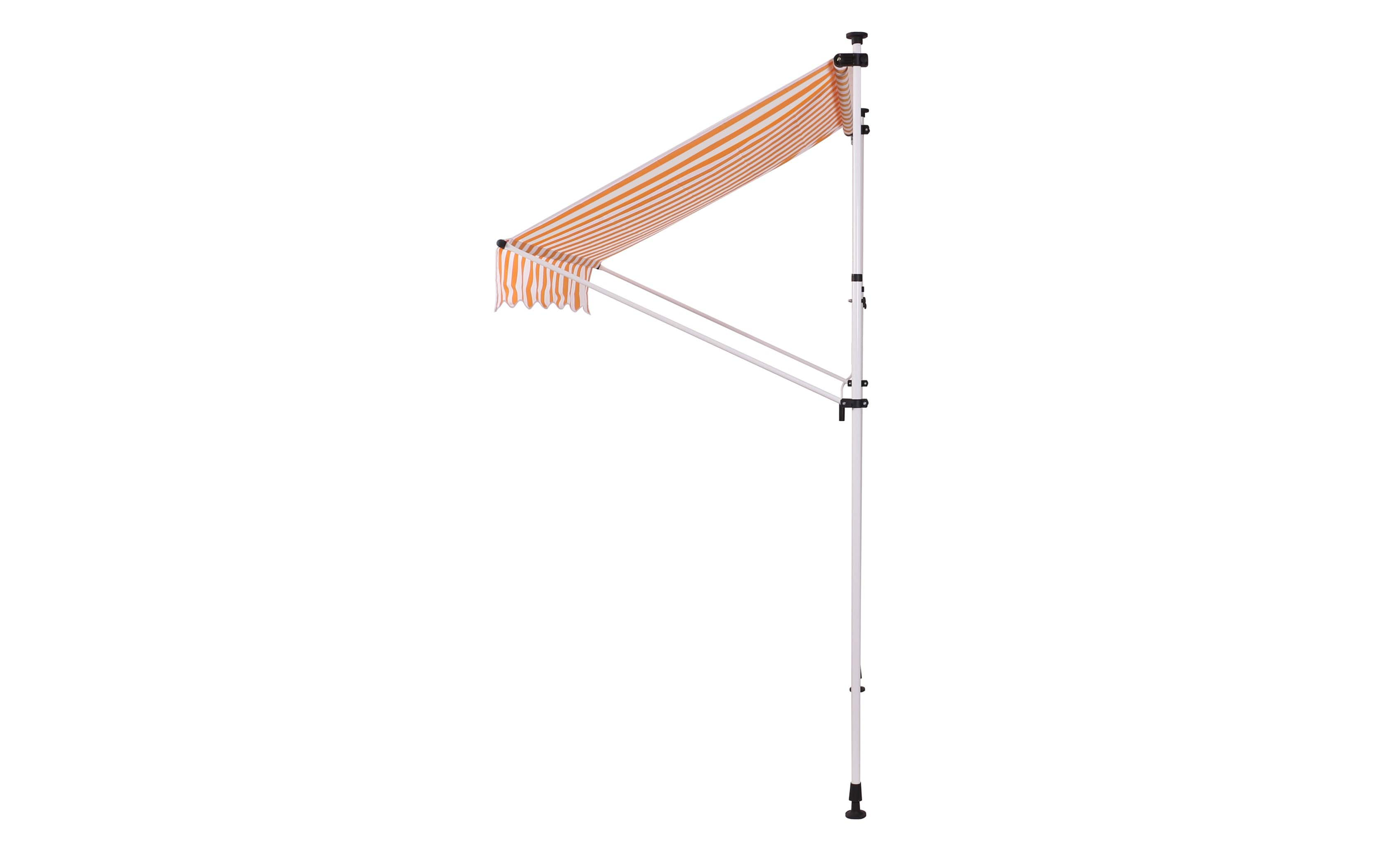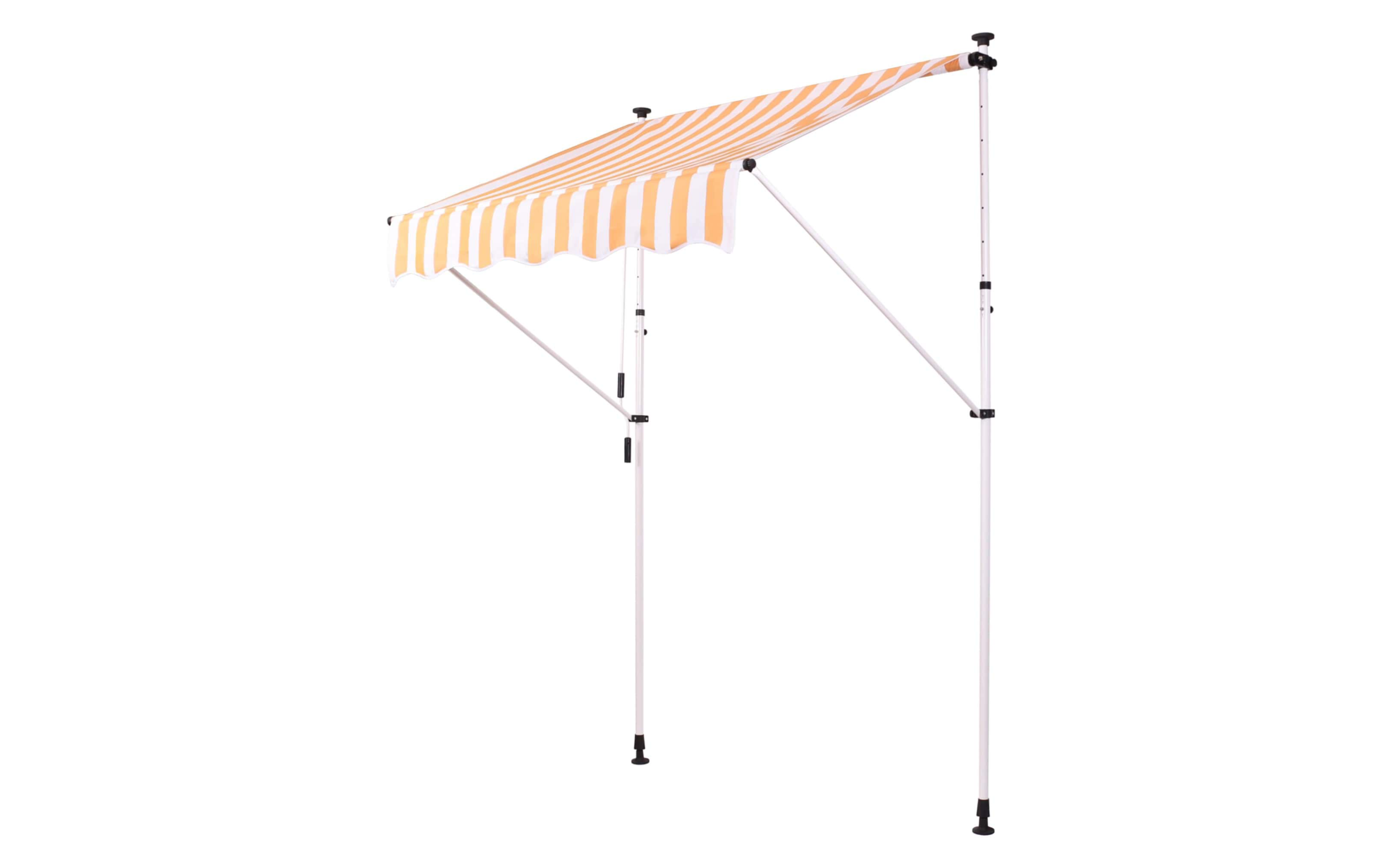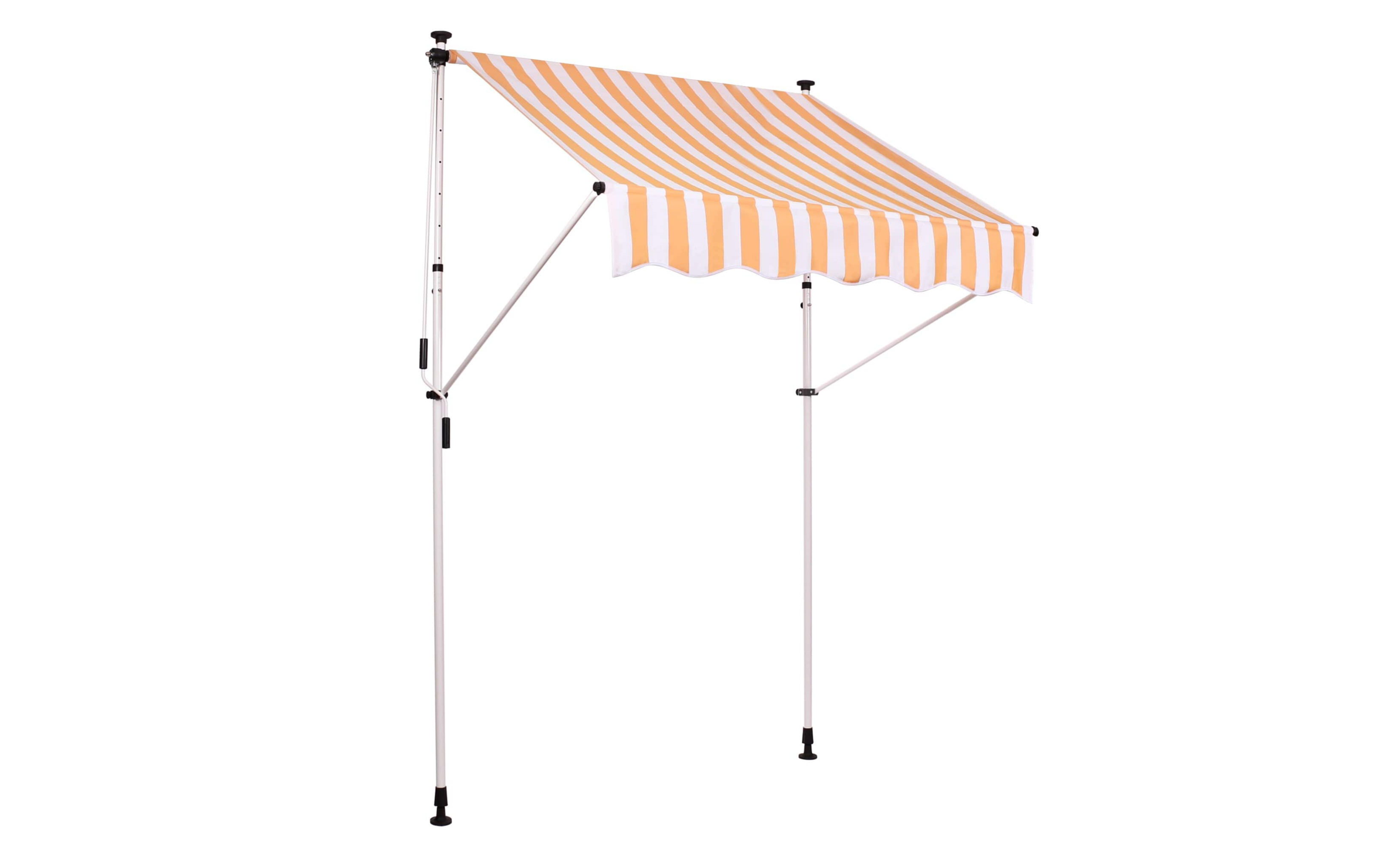 Do montażu potrzebny jest tylko mały występ na suficie, w którym można umieścić górny element rozporowy. wysokość występu od 200 do 300 cm. Aby rama mogła być odporna na lekkie podmuchy wiatru, jest wykonana z wytrzymałej i nierdzewnej stali. Maksymalnie markizę zasłania do 120 cm - regulacja za pomocą ręcznej korbki. Długość zadaszenia 150 cm. Kąt nachylenia markizy można regulować w pewnym zakresie.