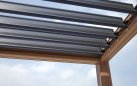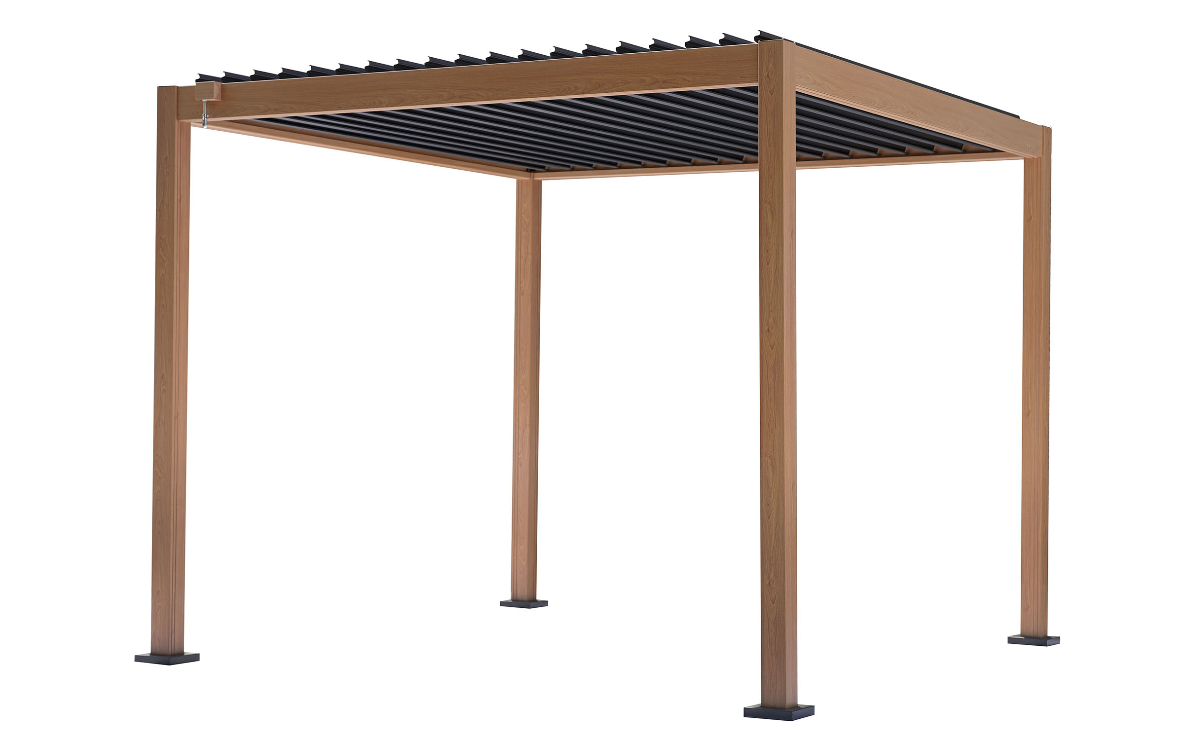 Konstrukcja z aluminium 105×105×1,3 mm z wykończeniem drewnopodobnym. Belki dachowe 145×80×1,3 mm. Lamele dachowe 162×27×1,2 mm. Dach regulowany korbą. System odprowadzania wody zintegrowany wewnątrz słupów.