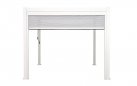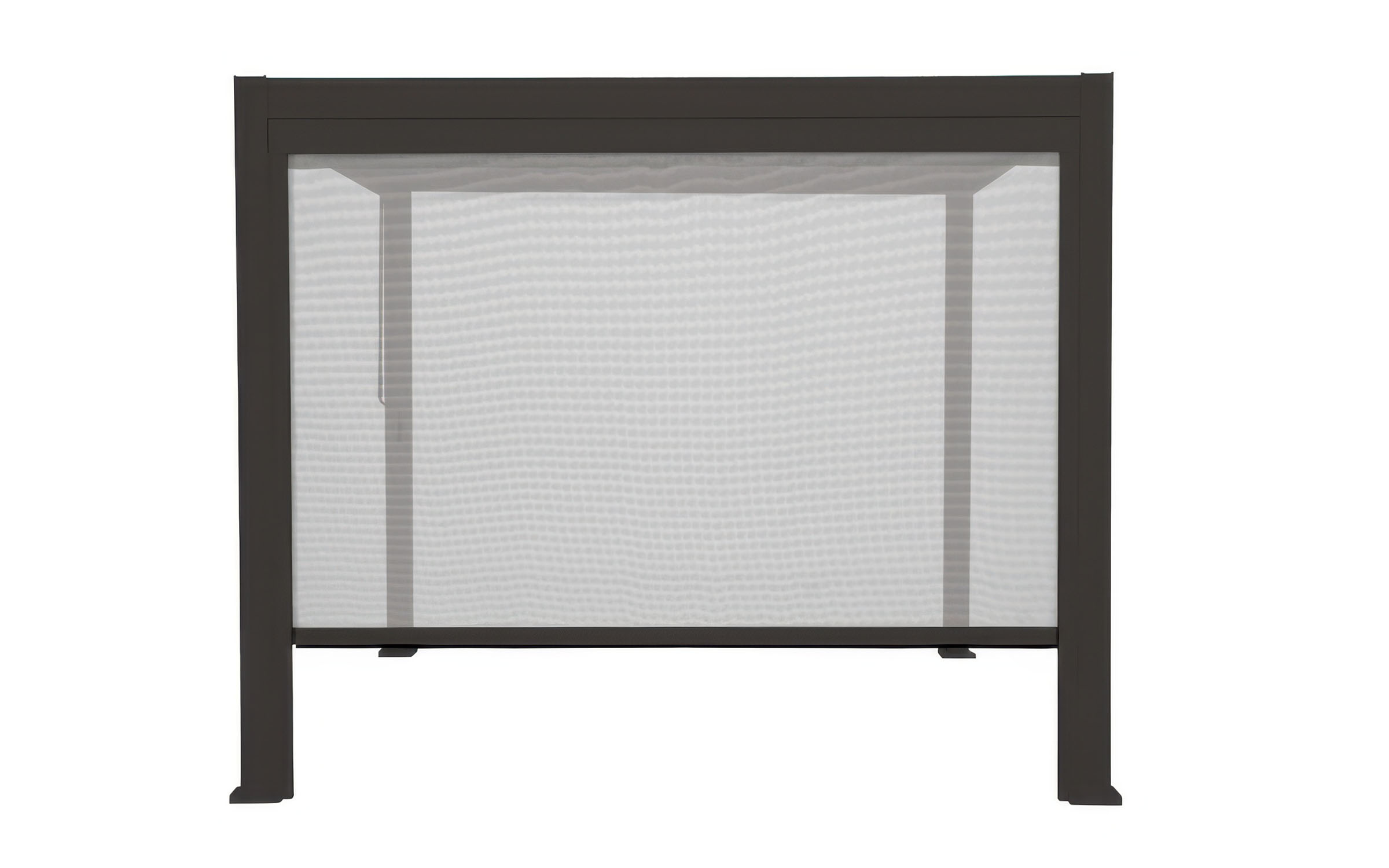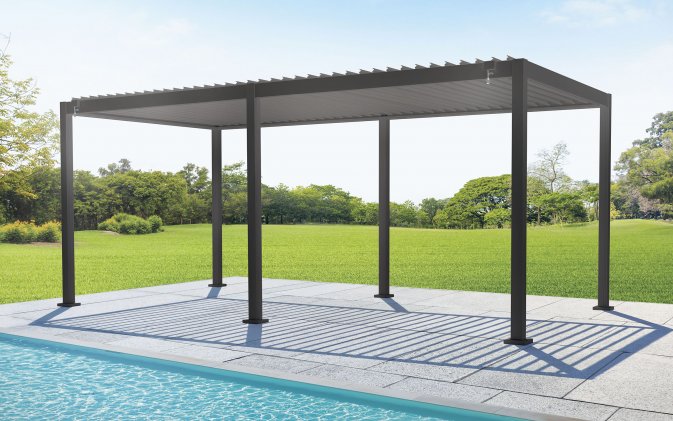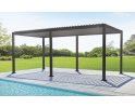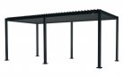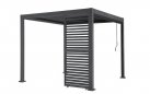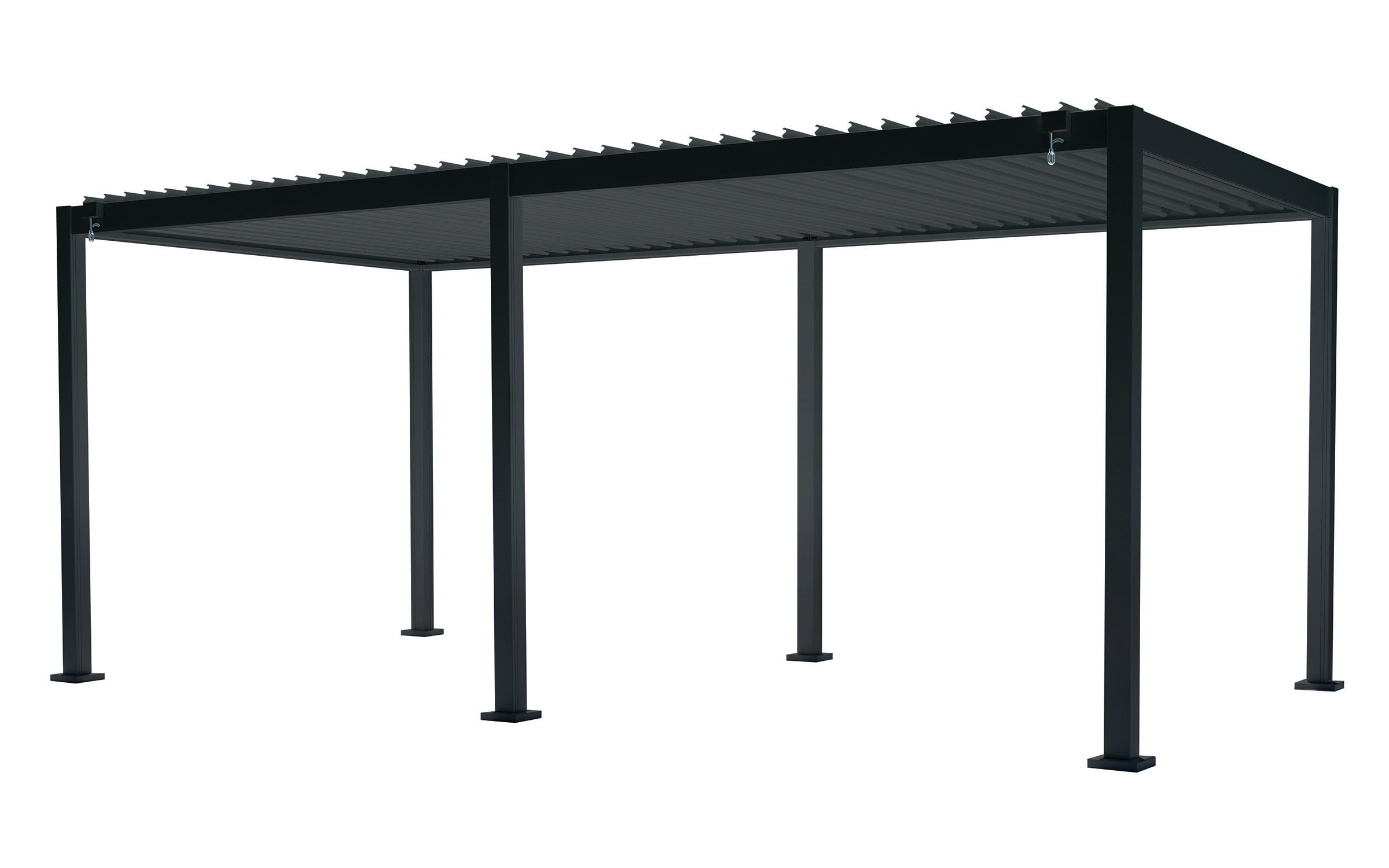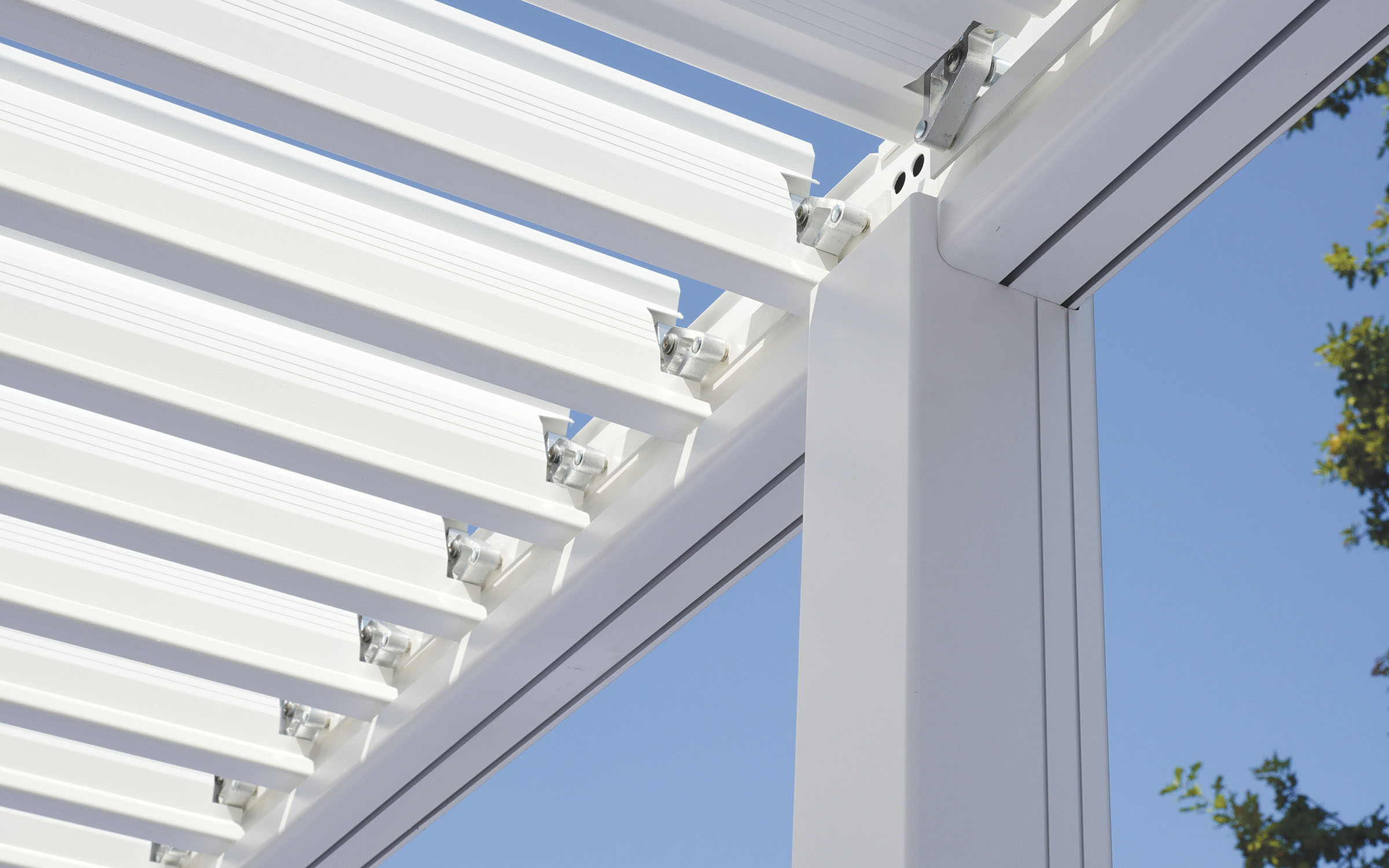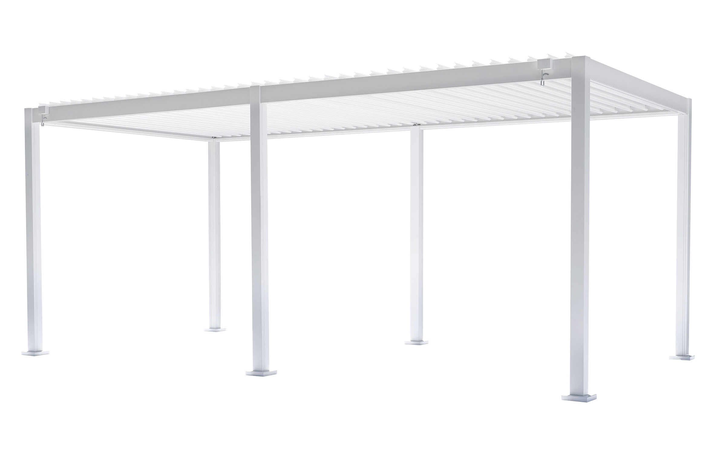 Konstrukcja z aluminium 105×105×1,3 mm malowanego proszkowo. Belki dachowe 145×80×1,3 mm. Lamele dachowe 162×27×1,2 mm. Dach regulowany korbą. System odprowadzania wody zintegrowany wewnątrz słupów. Kolor do wyboru: biały lub antracyt.