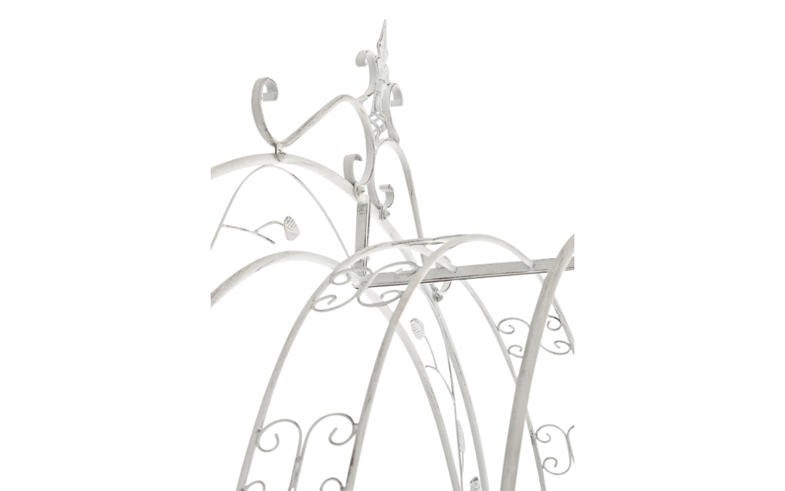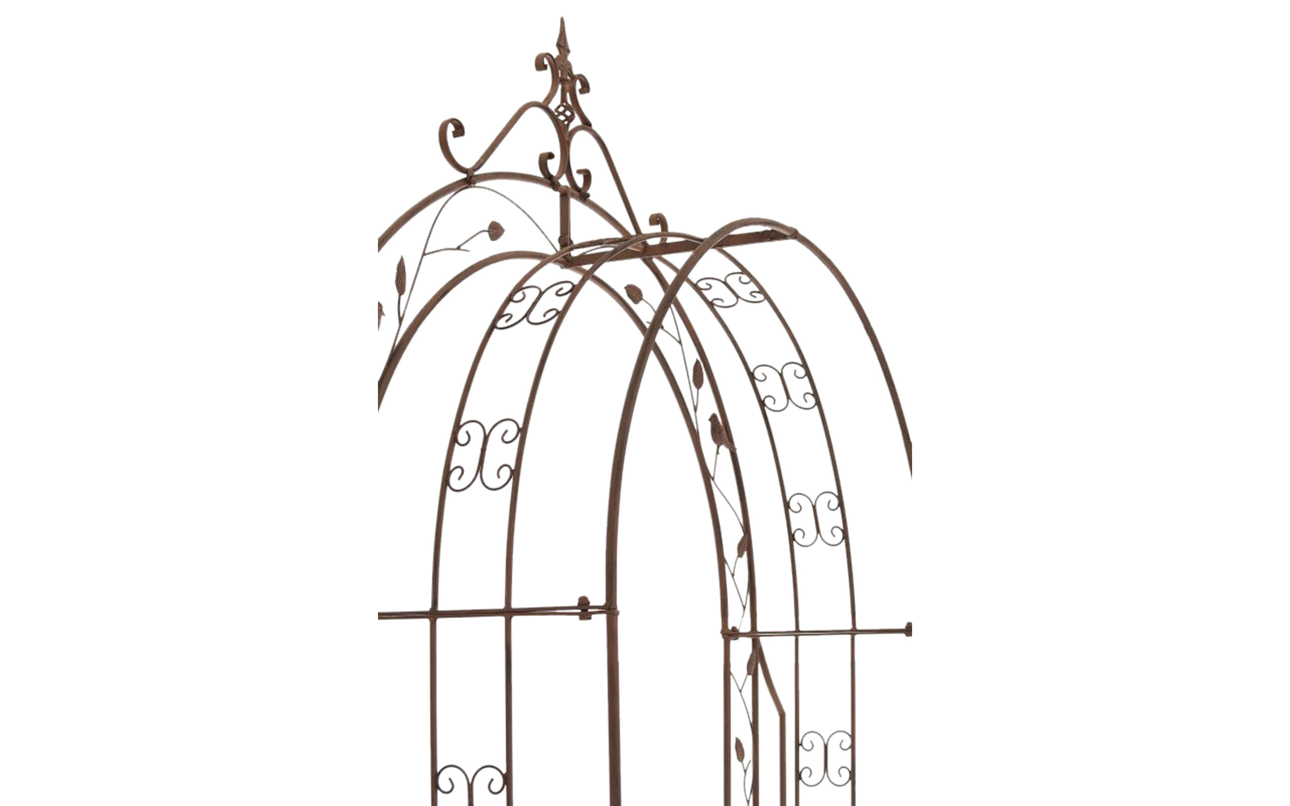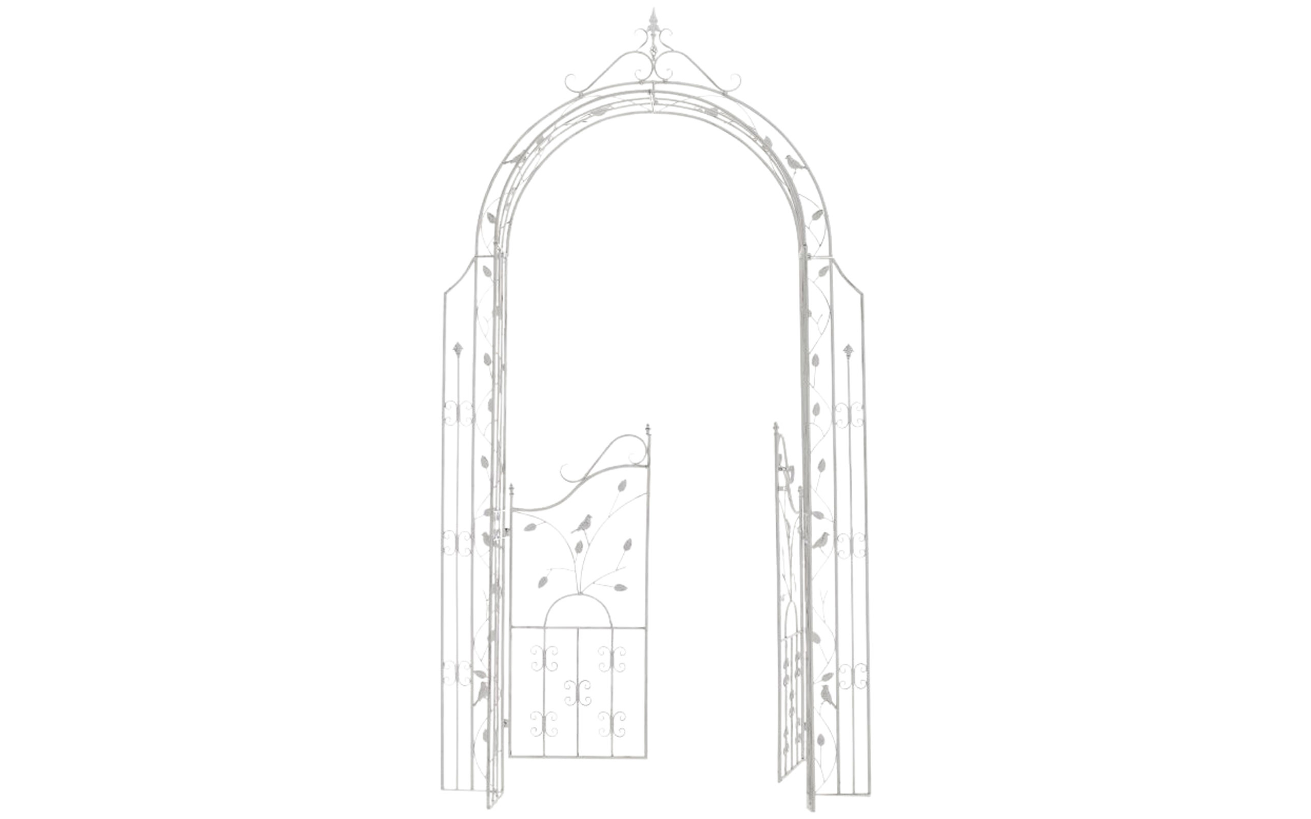 GRENADA to dekoracyjny łuk ogrodowy z bramką, wykonany z metalu i zdobiony licznymi detalami. Stanowi efektowną podporę dla roślin pnących, takich jak róże, powojniki czy bluszcz, a jednocześnie pełni funkcję ozdobnego wejścia do ogrodu.