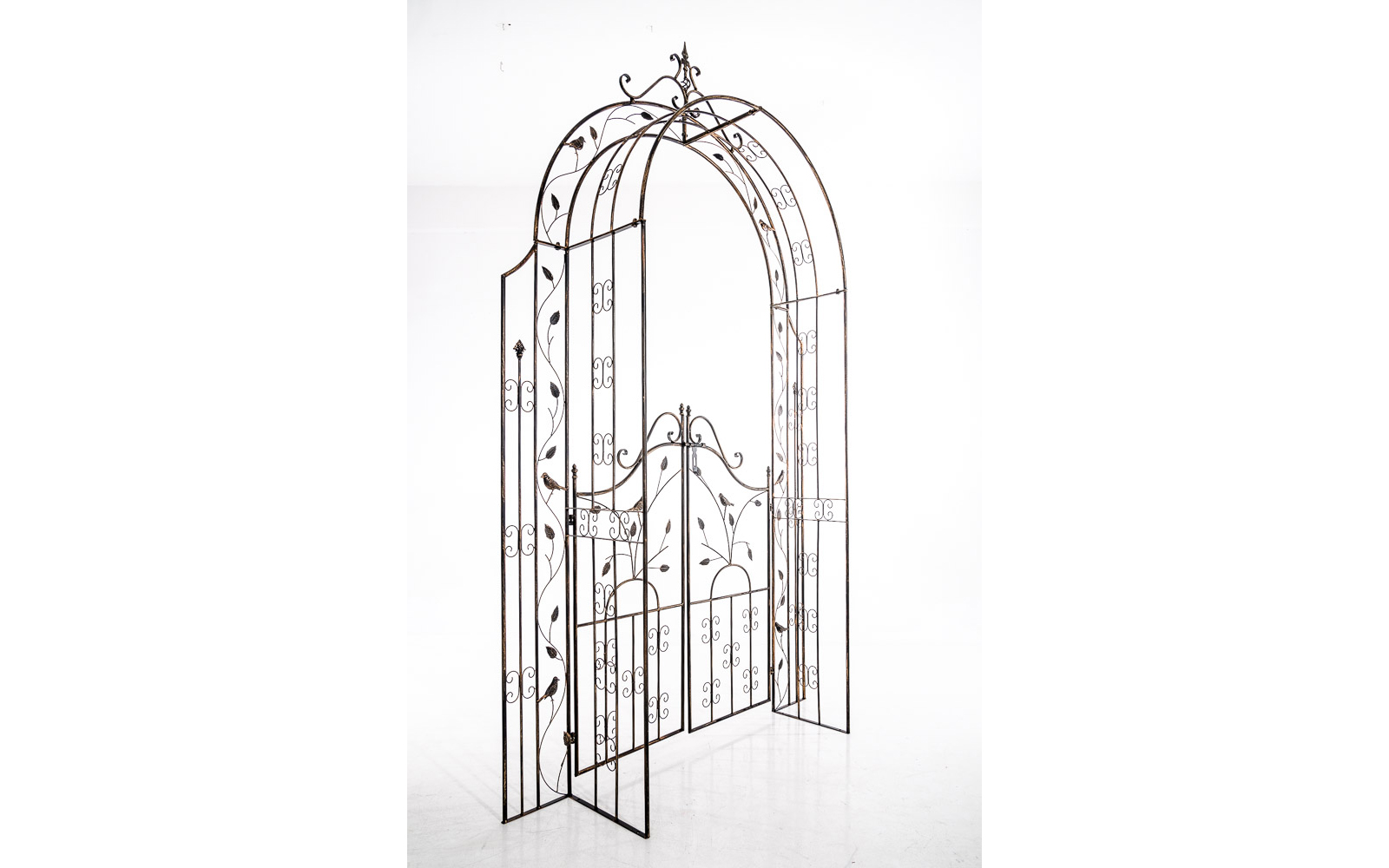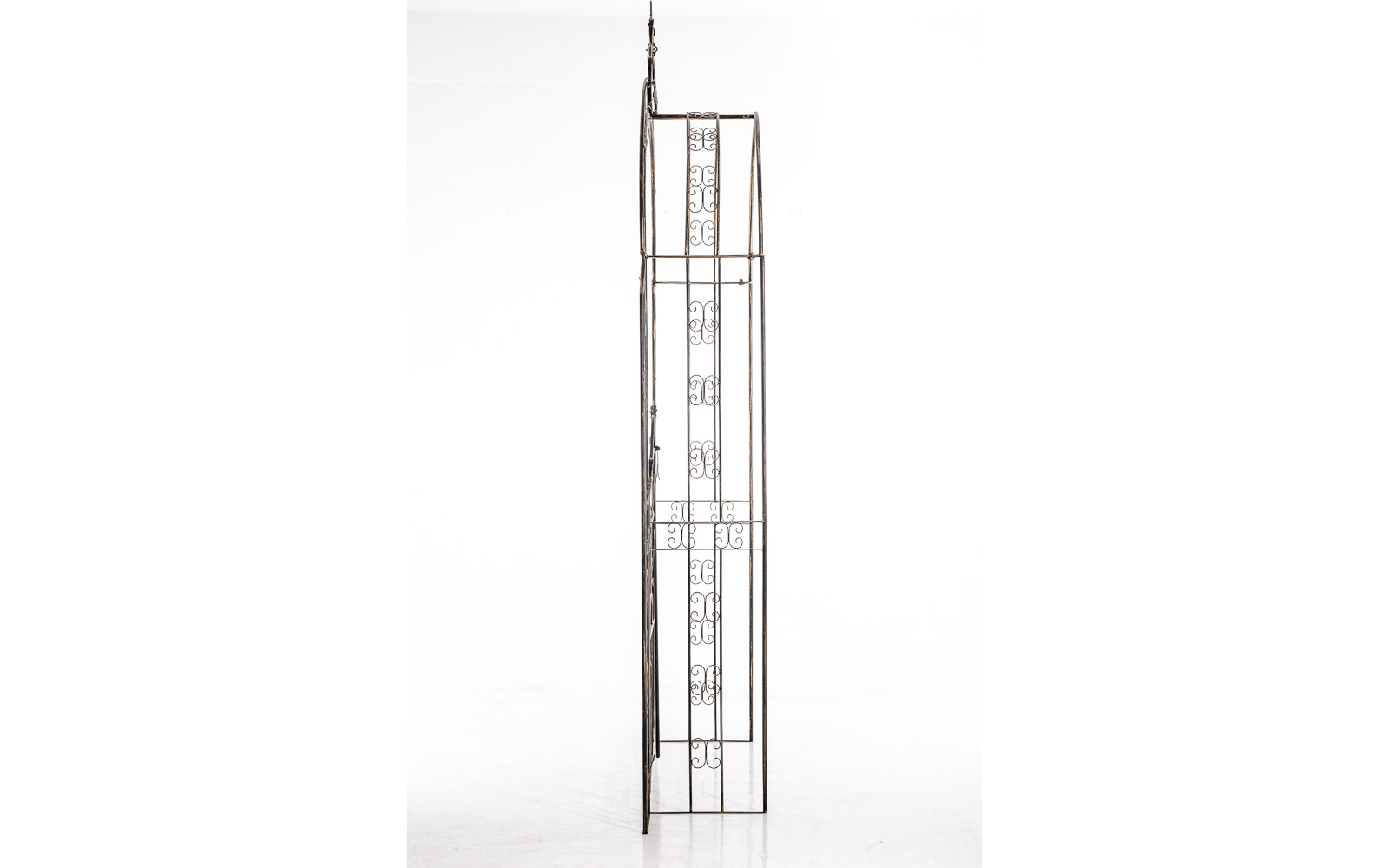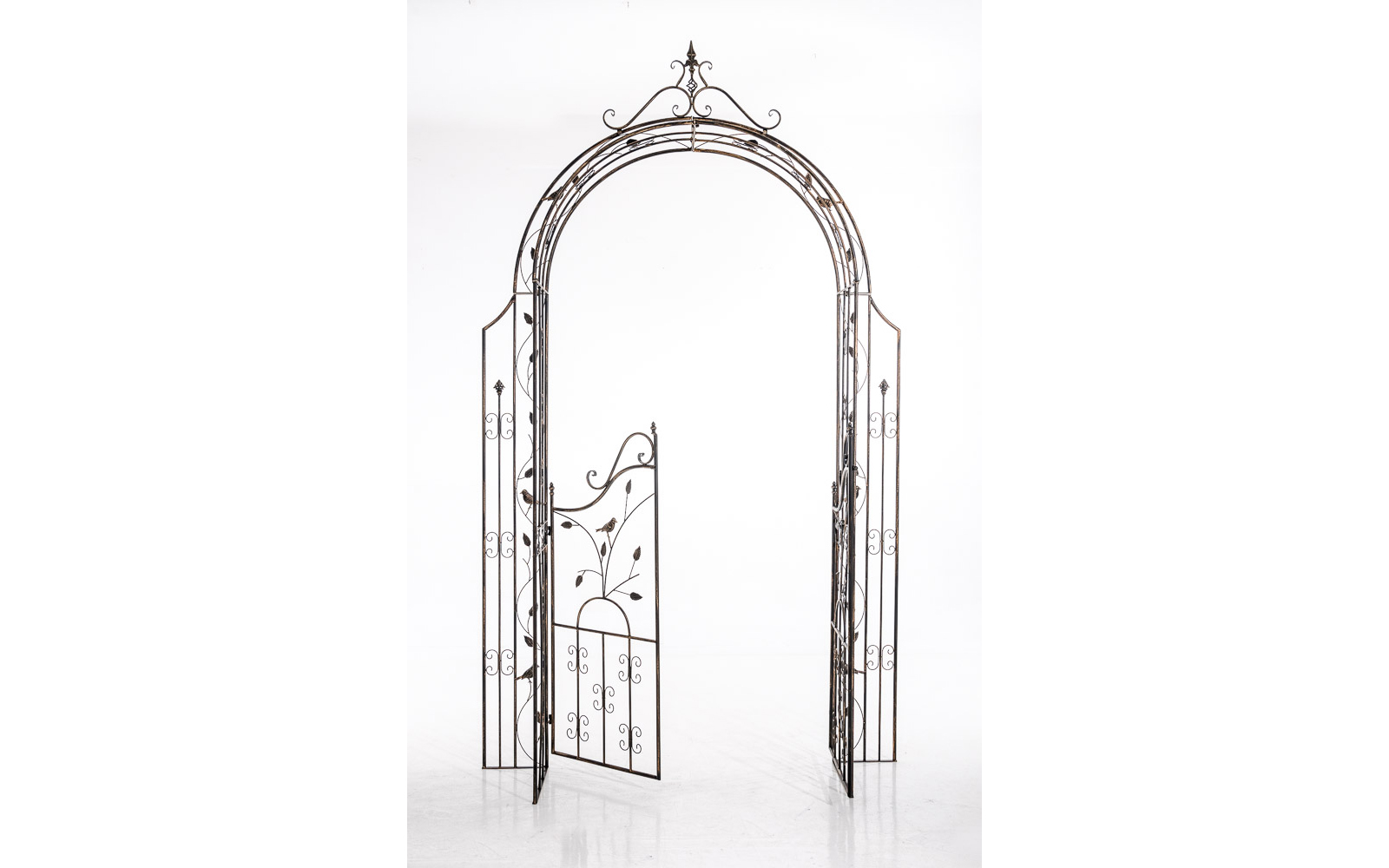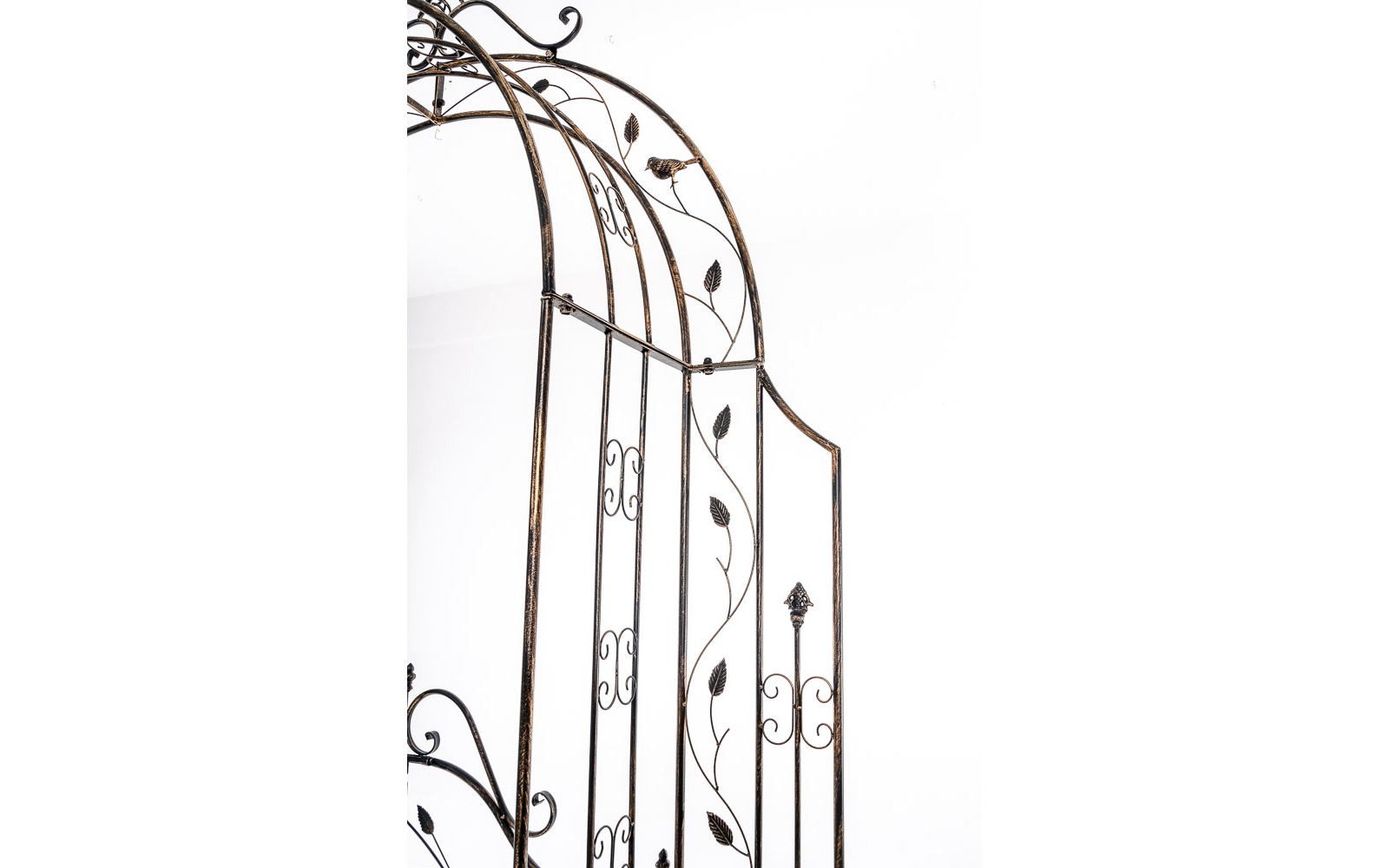 GRENADA to dekoracyjny łuk ogrodowy z bramką, wykonany z metalu i zdobiony licznymi detalami. Stanowi efektowną podporę dla roślin pnących, takich jak róże, powojniki czy bluszcz, a jednocześnie pełni funkcję ozdobnego wejścia do ogrodu.