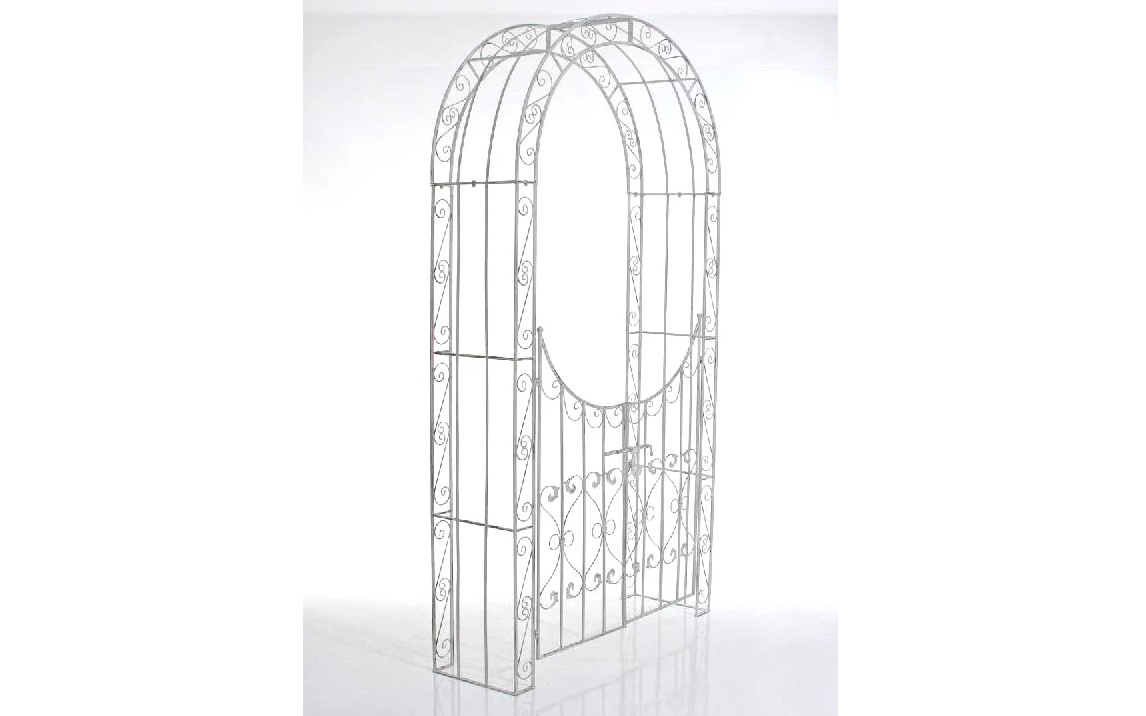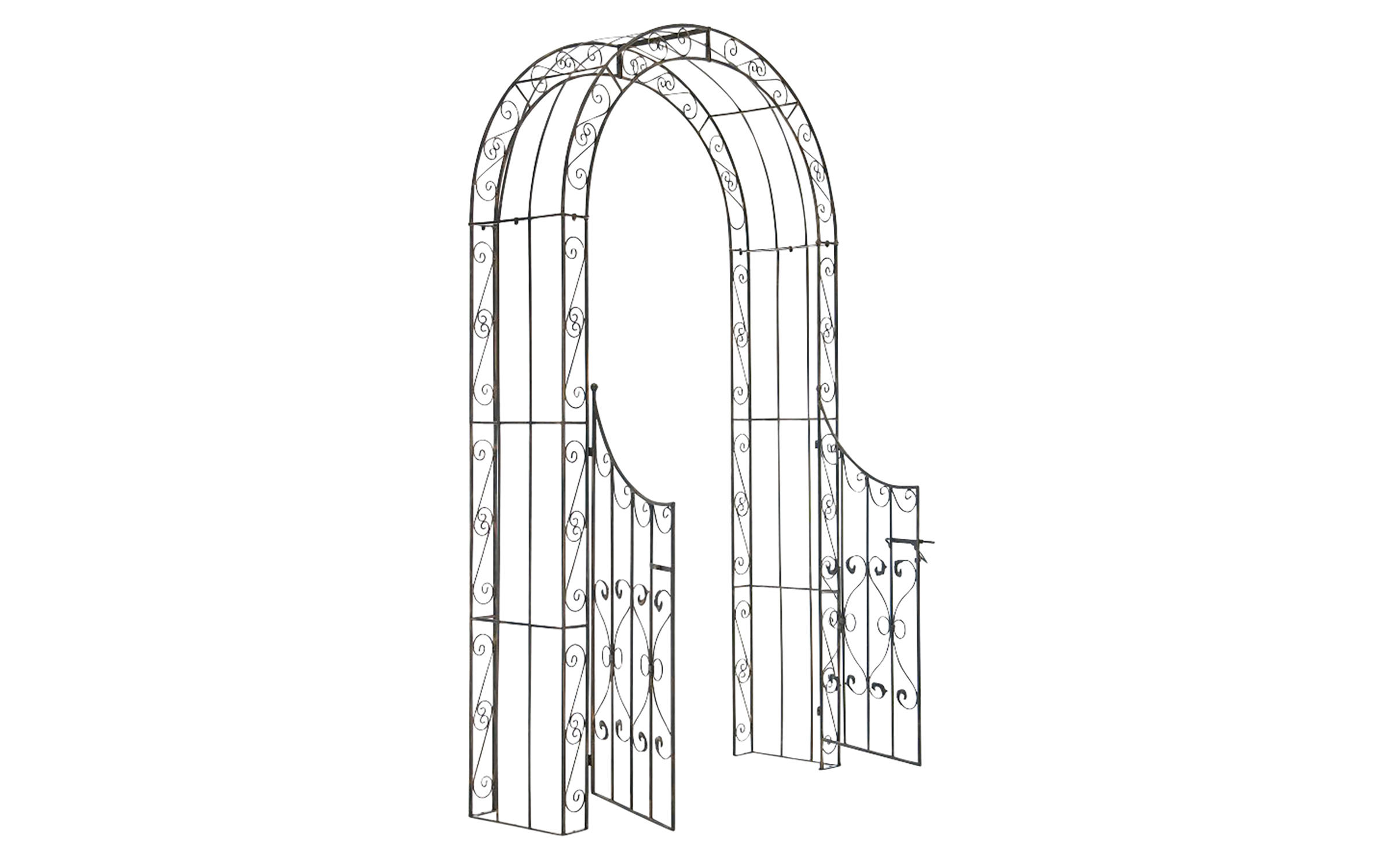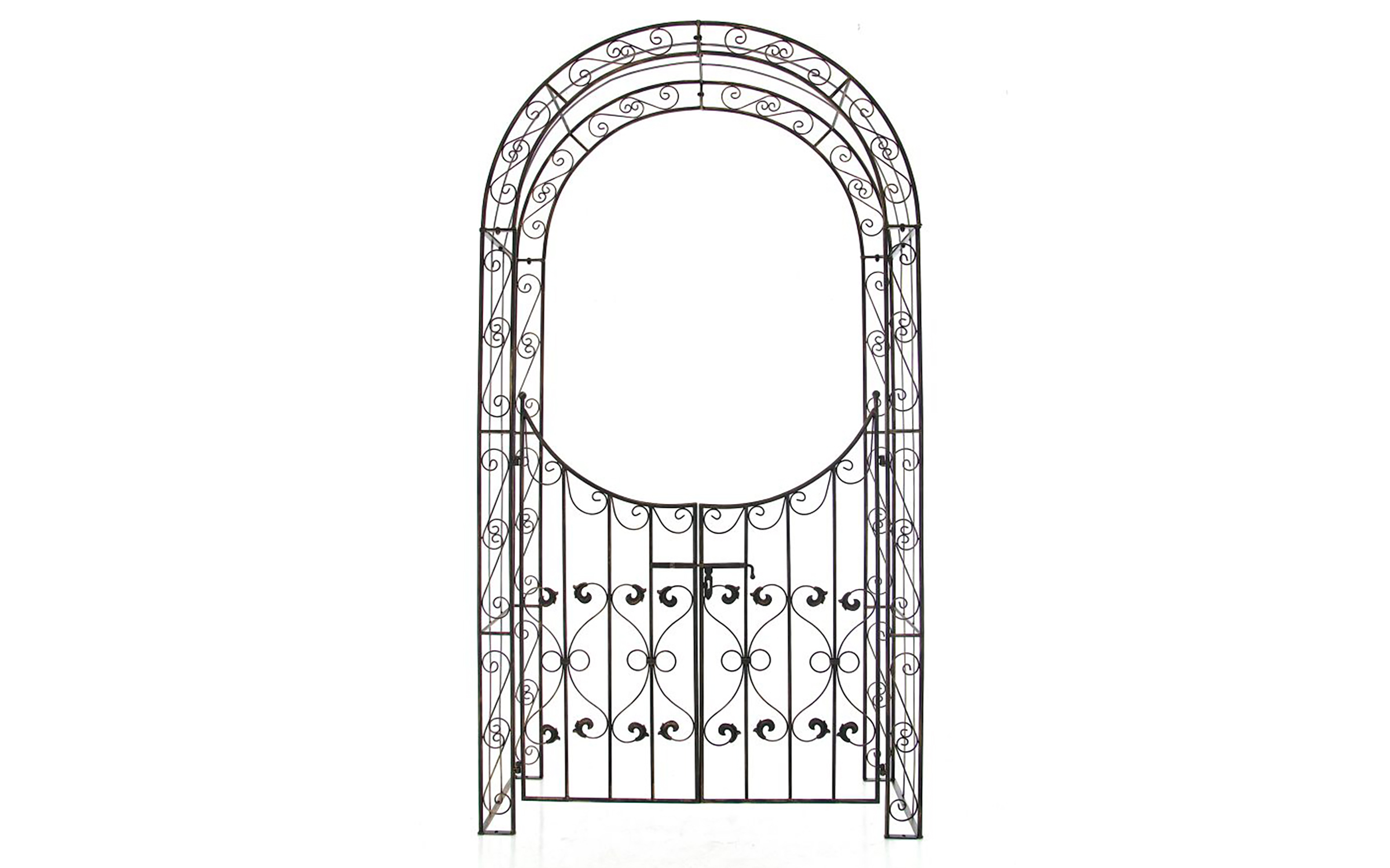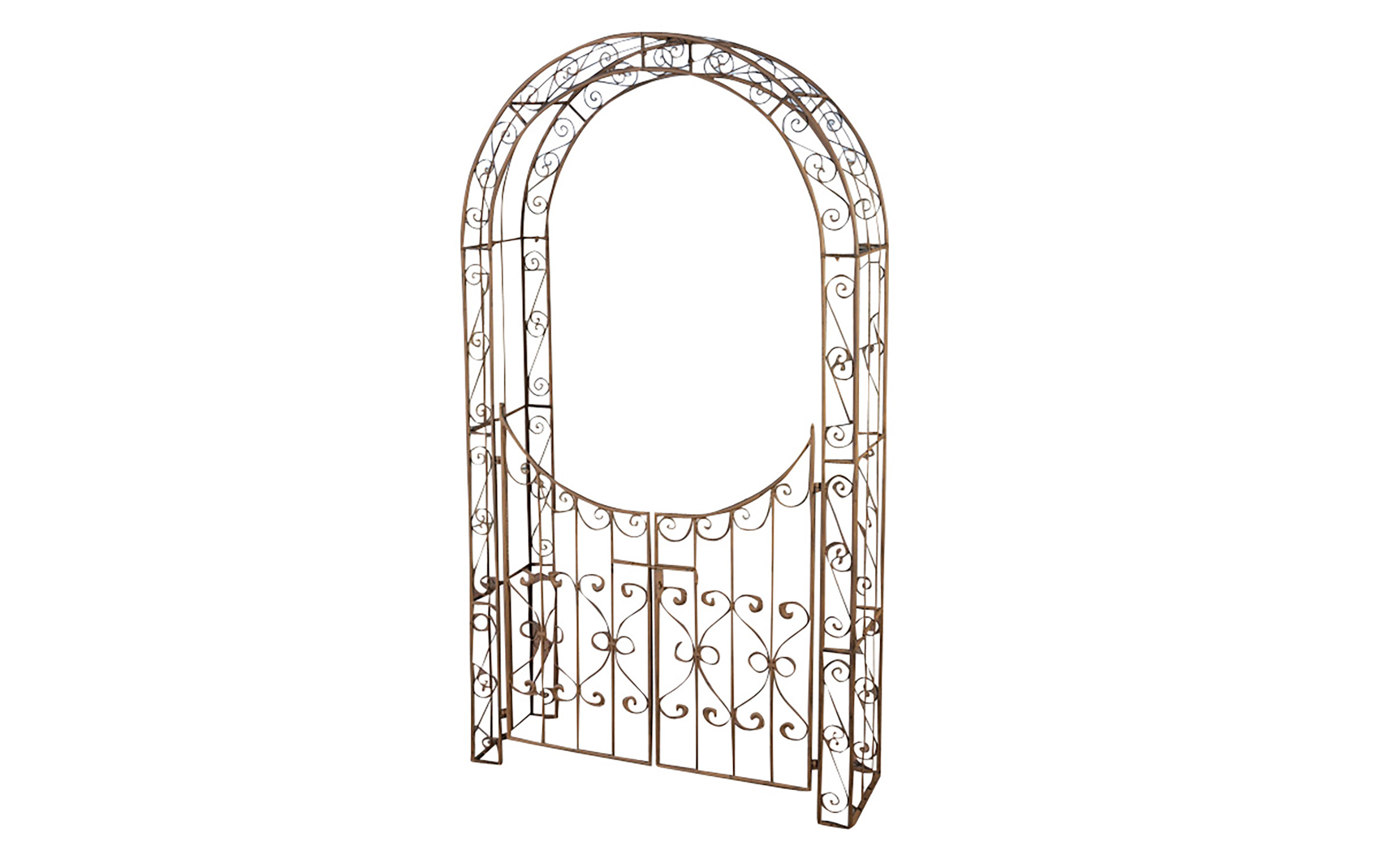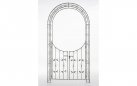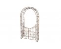 Brama ogrodowa różana z półokrągłym sklepieniem. Konstrukcja bramy zwieńczona giętymi elementami.