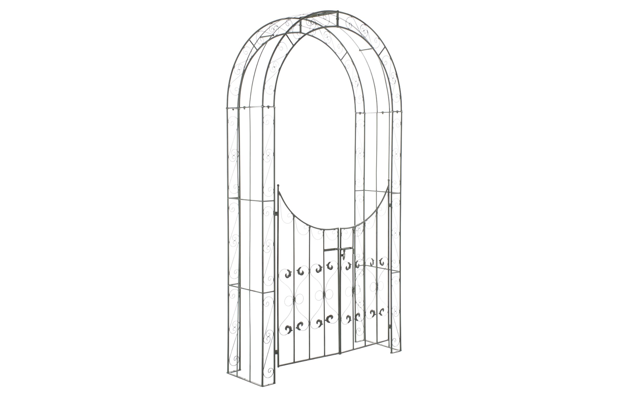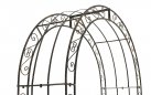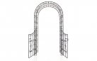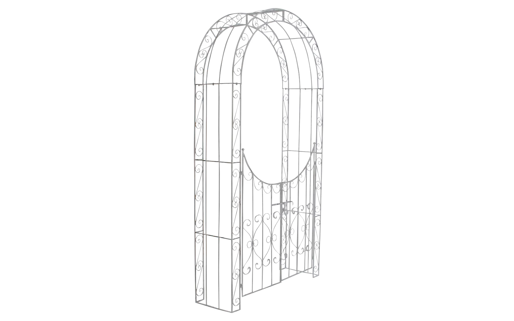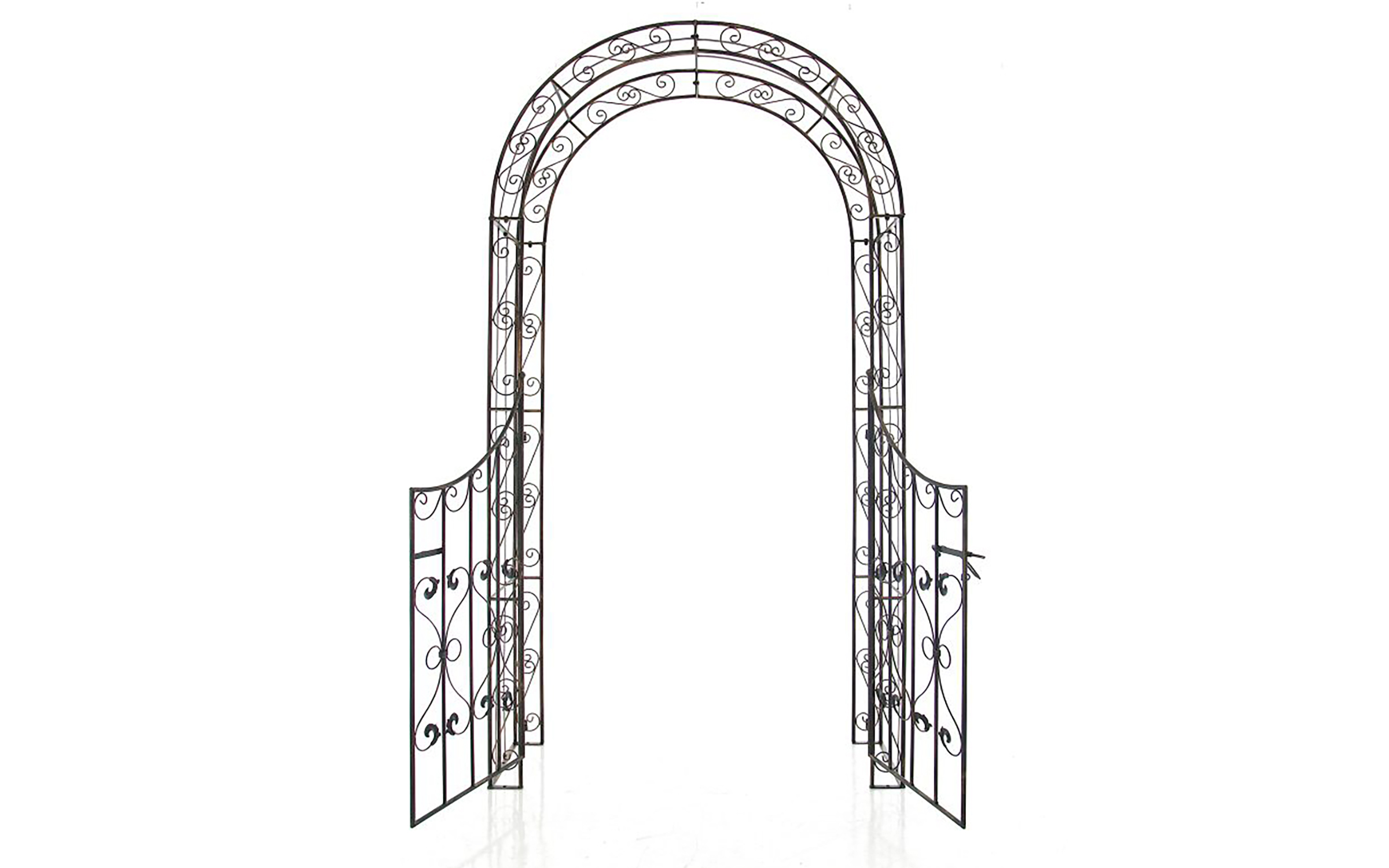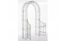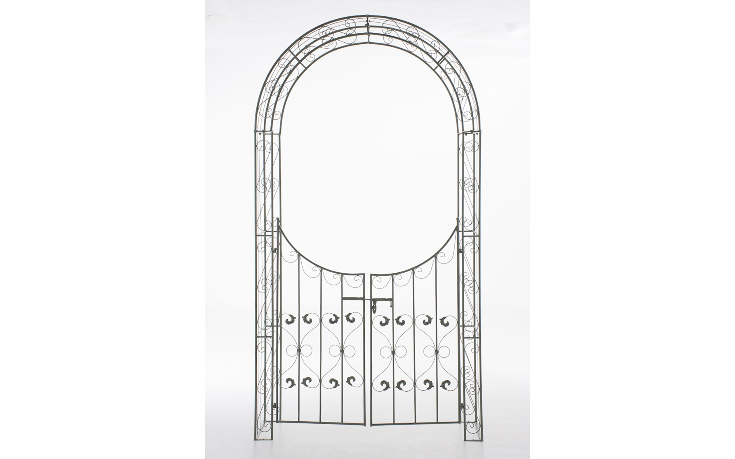 Brama ogrodowa różana z półokrągłym sklepieniem. Konstrukcja bramy zwieńczona giętymi elementami.