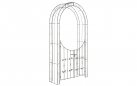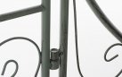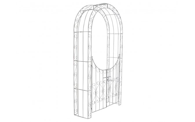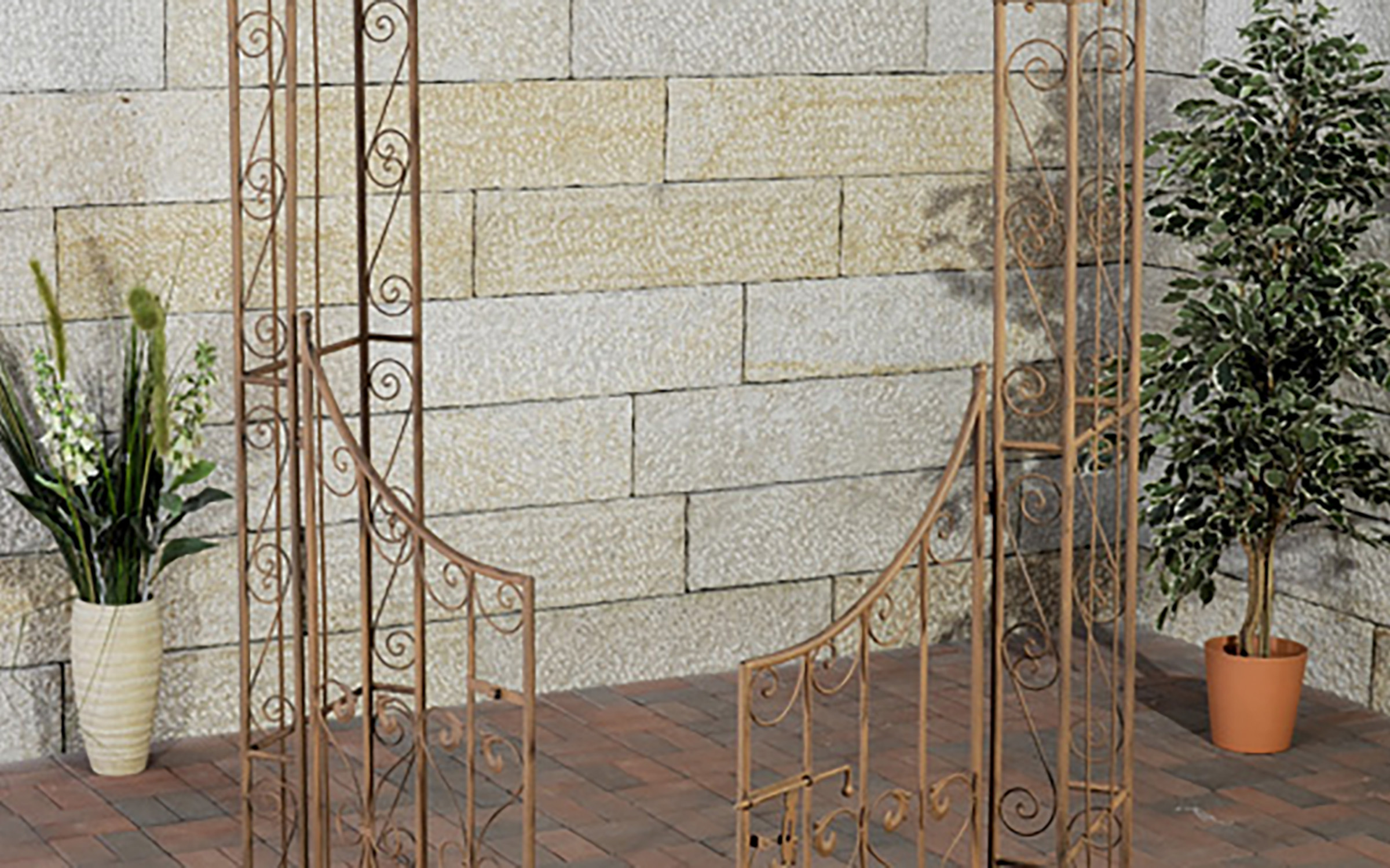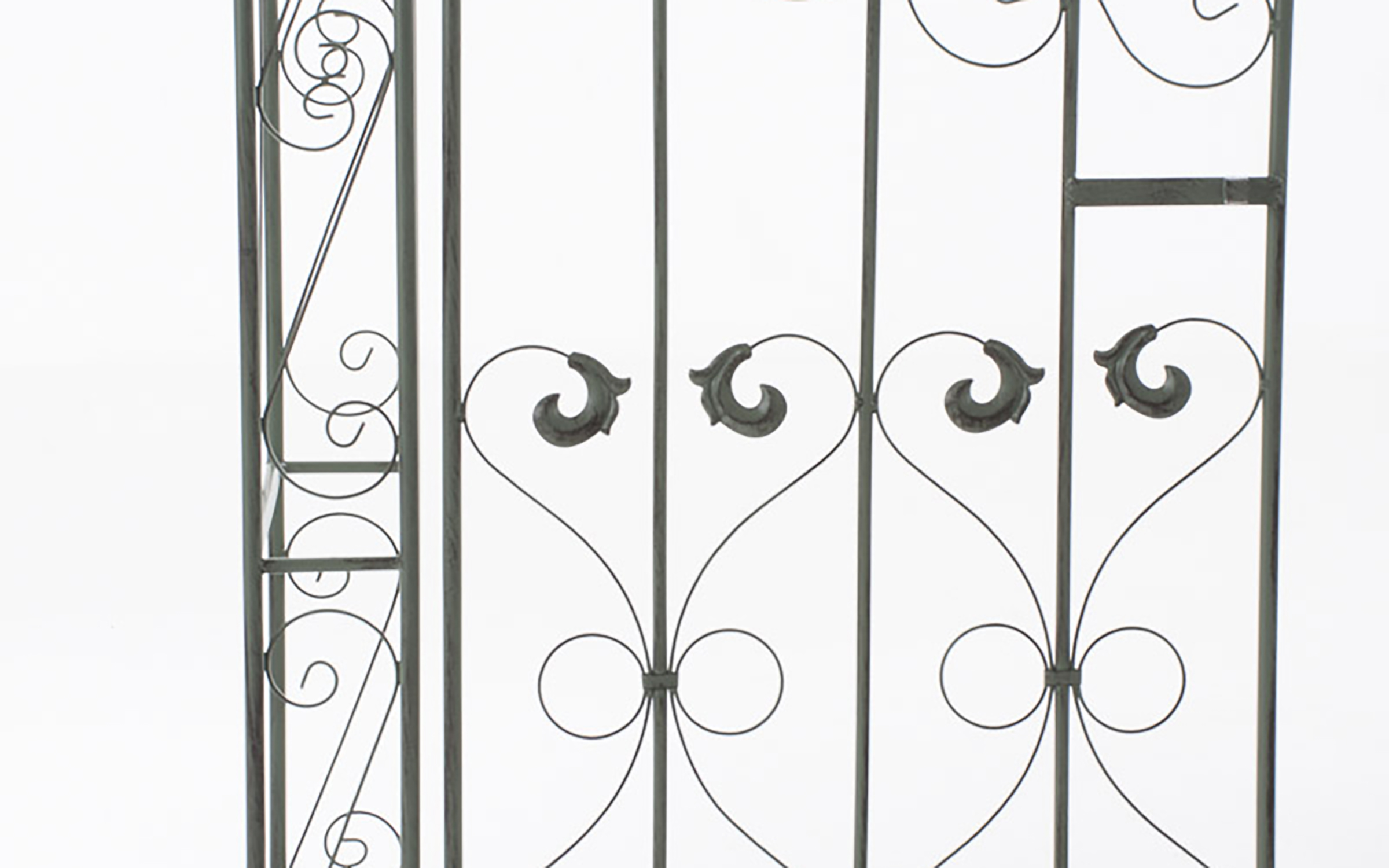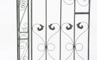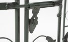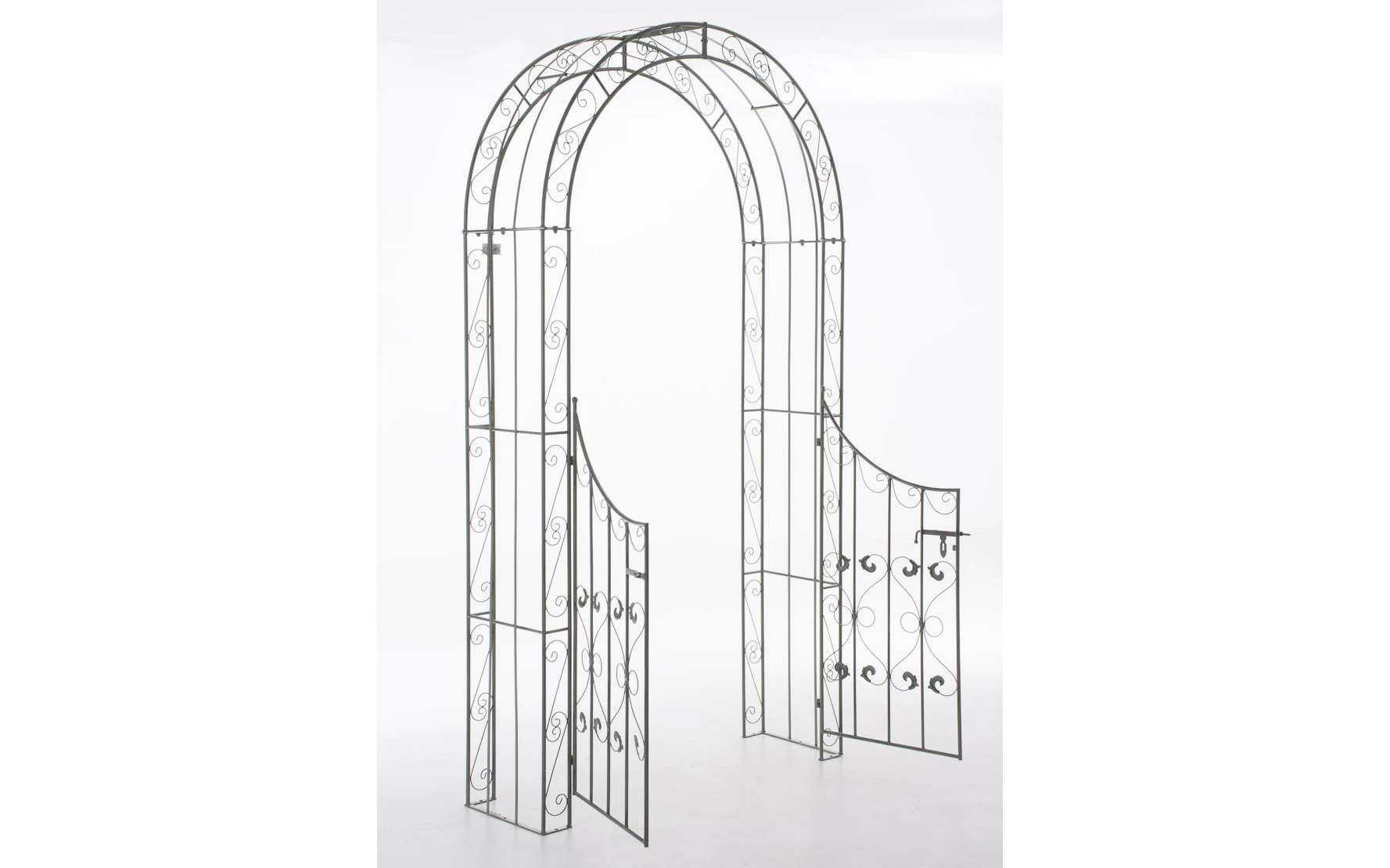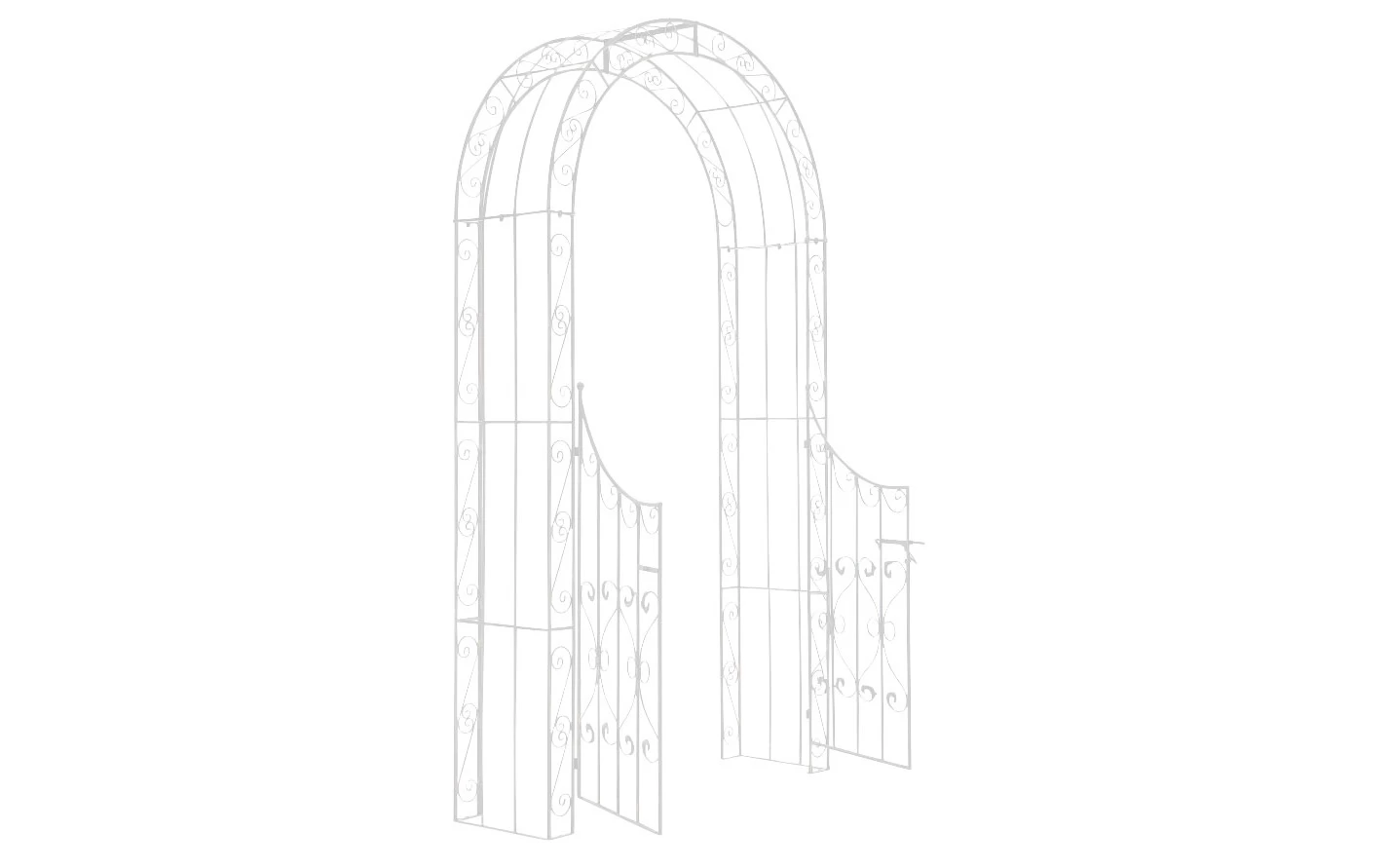 Brama ogrodowa różana z półokrągłym sklepieniem. Konstrukcja bramy zwieńczona giętymi elementami.