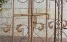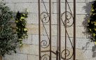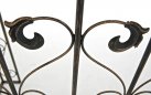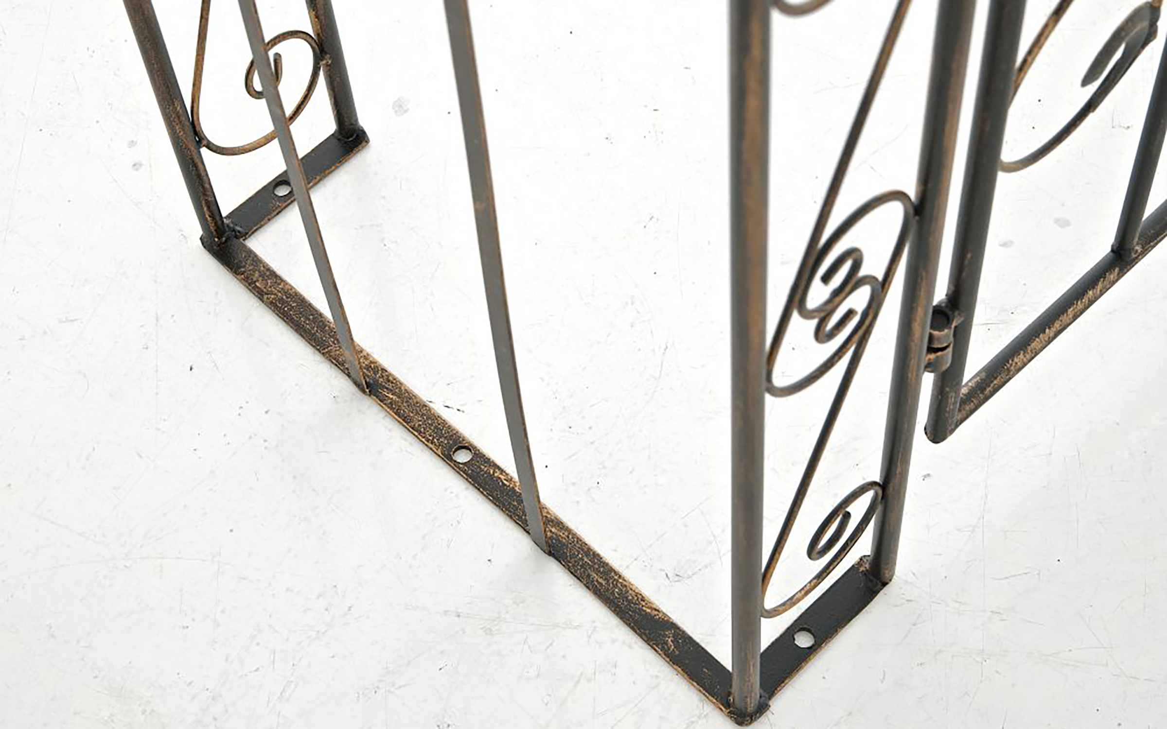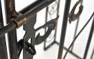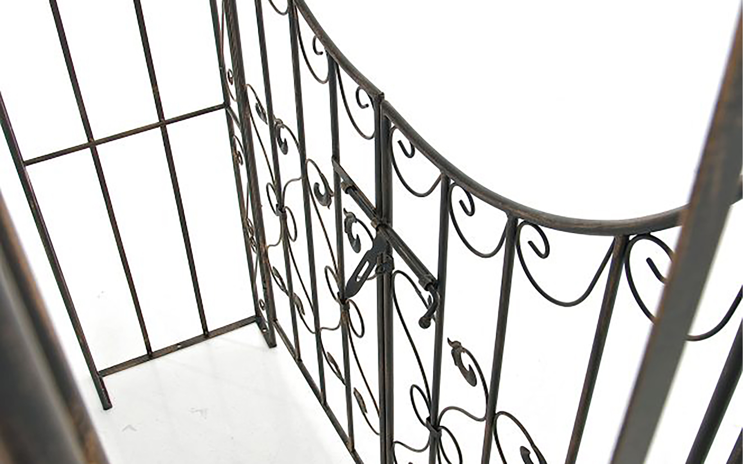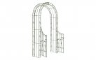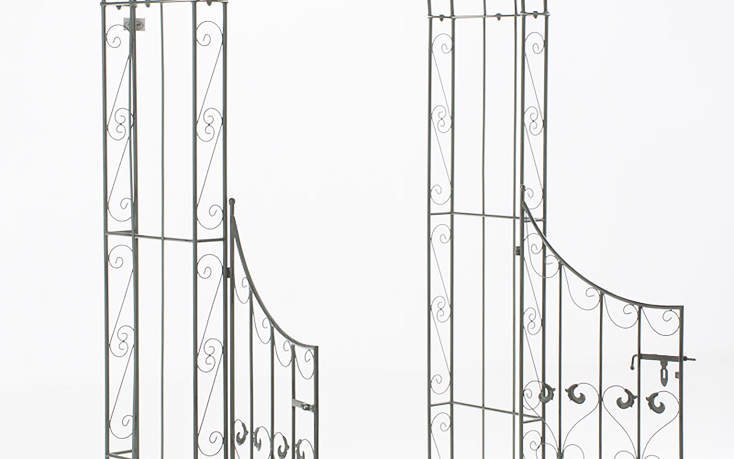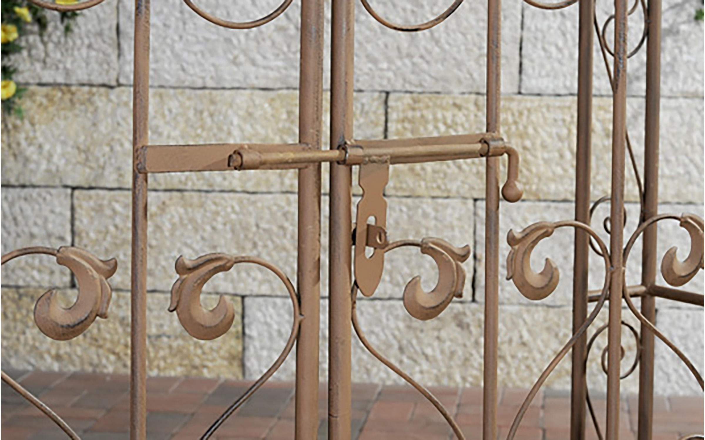 Brama ogrodowa różana z półokrągłym sklepieniem. Konstrukcja bramy zwieńczona giętymi elementami.