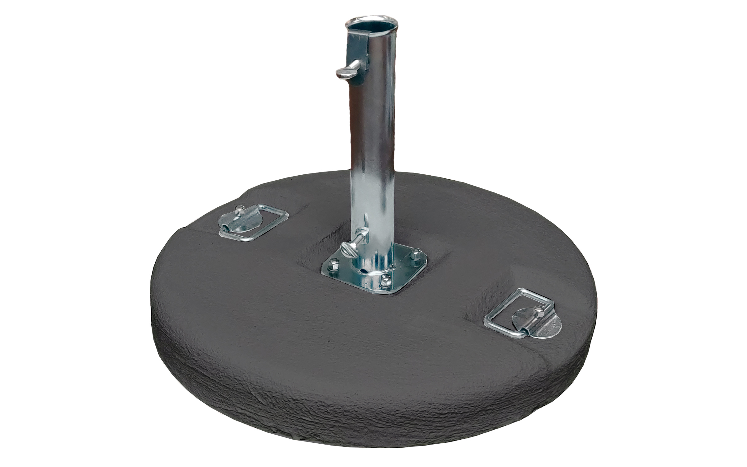 Solidna podstawa cementowa o średnicy Ø54 cm i wadze 50 kg, przeznaczona do parasoli ogrodowych z rurą o średnicy do Ø55 mm. Wyposażona w stalowe uchwyty ułatwiające przenoszenie oraz płytę mocującą na 4 śruby. Dostępna w kolorze szarym lub białym.