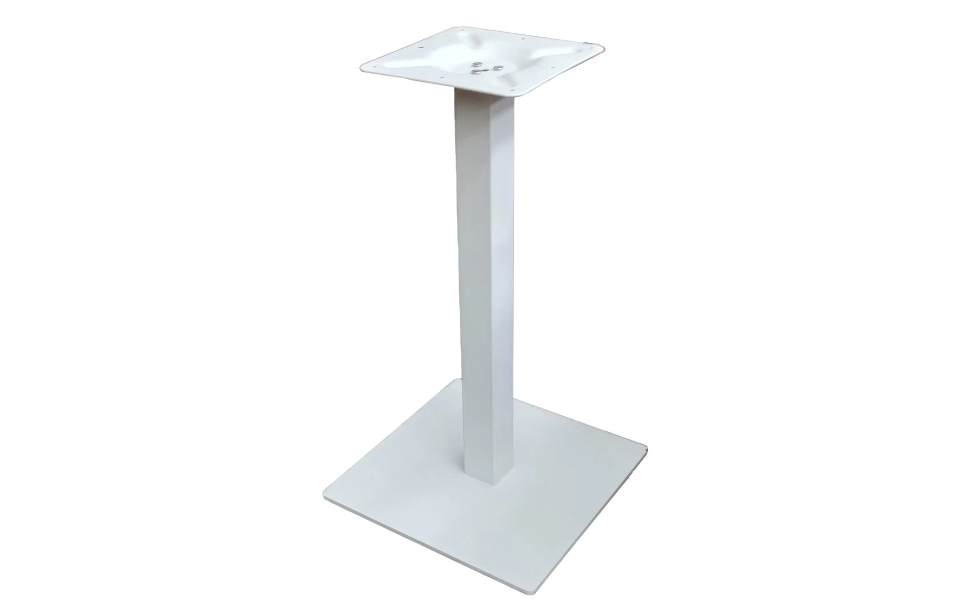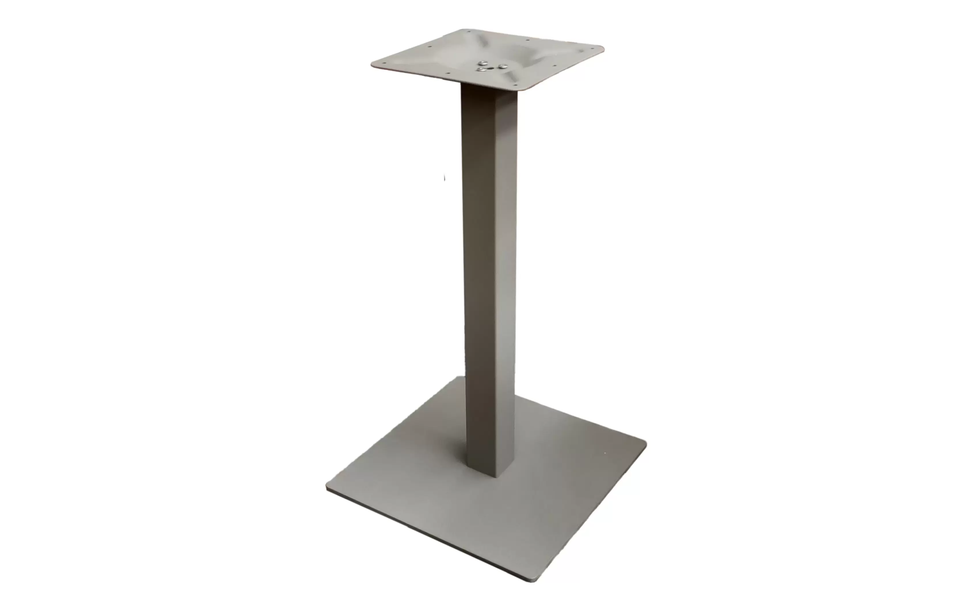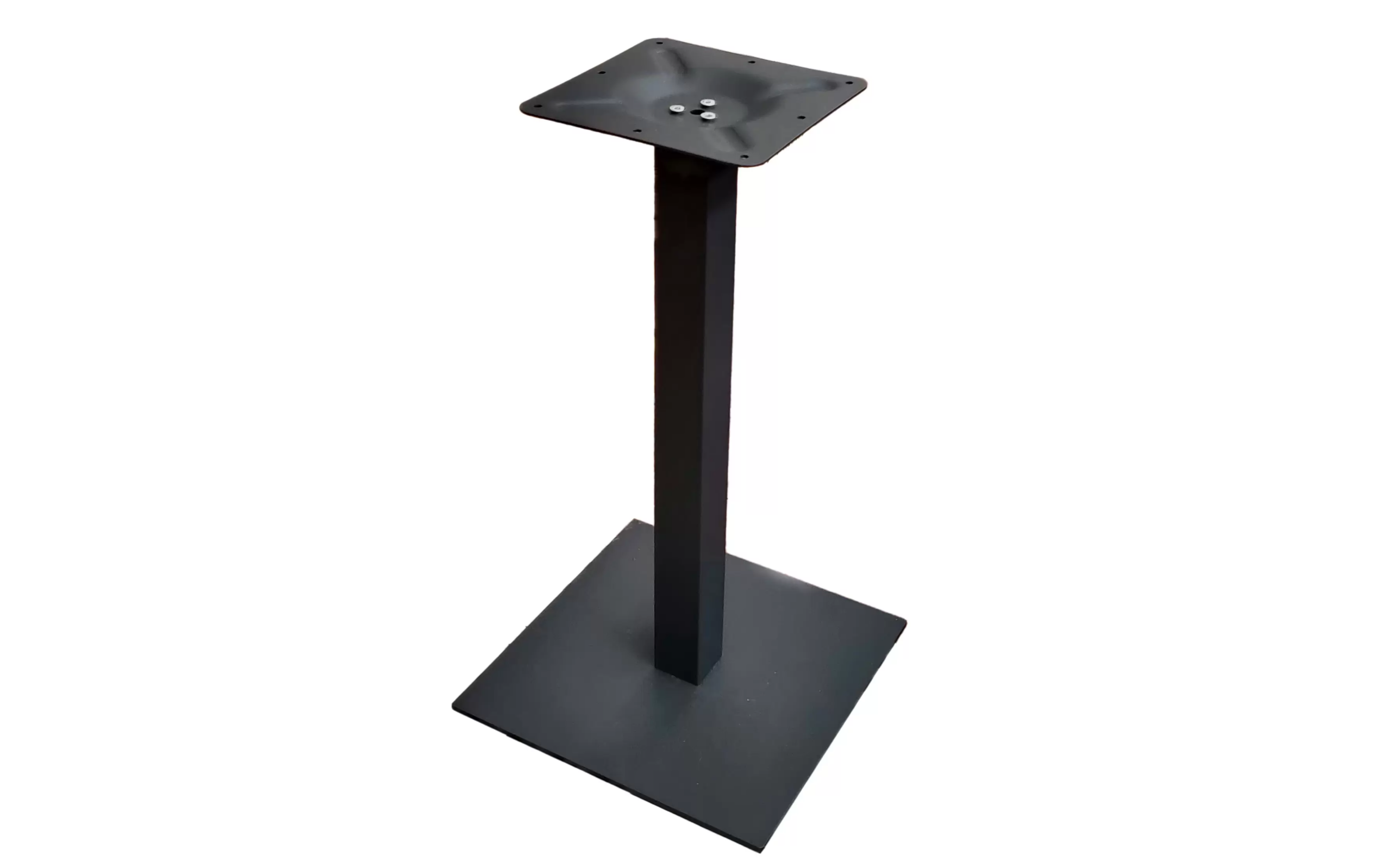 Stalowa podstawa stołu przeznaczona do zastosowań kontraktowych w przestrzeniach horeca – idealna do ogrodów, tarasów, restauracji i stref wypoczynkowych. Wykonana z lakierowanej stali, odporna na warunki atmosferyczne. Konstrukcja z kwadratową płytą 40×40 cm i rurą stalową 60×60 mm. System mocowania na 3 śruby zapewnia stabilność i łatwy montaż.