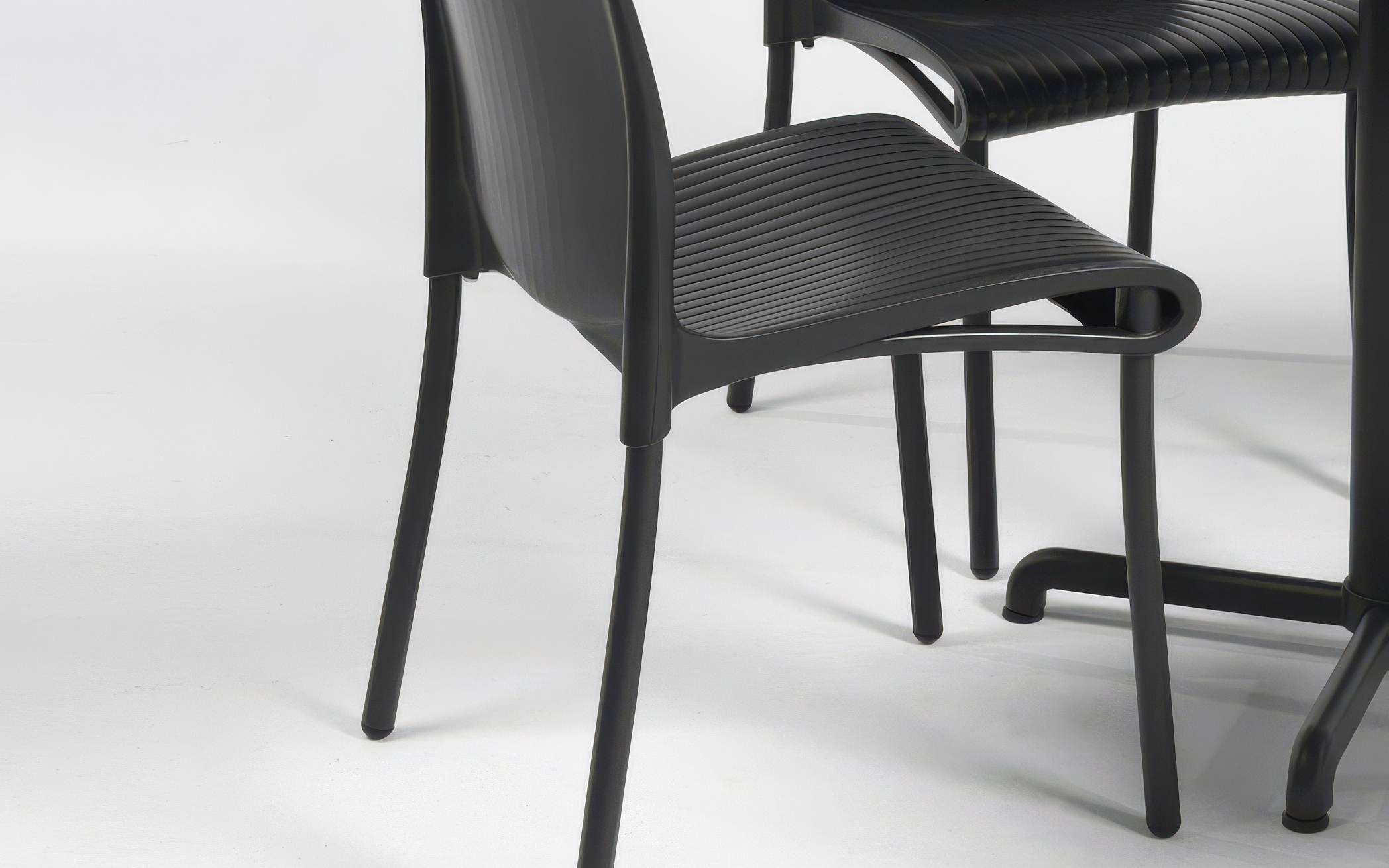 SCUDO można sztaplować poziomo, co pozwala znacząco ograniczyć przestrzeń magazynową. Model współpracuje z blatami okrągłymi i kwadratowymi, dzięki czemu sprawdzi się w restauracjach, kawiarniach, hotelach oraz w aranżacjach tarasowych.
