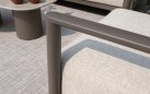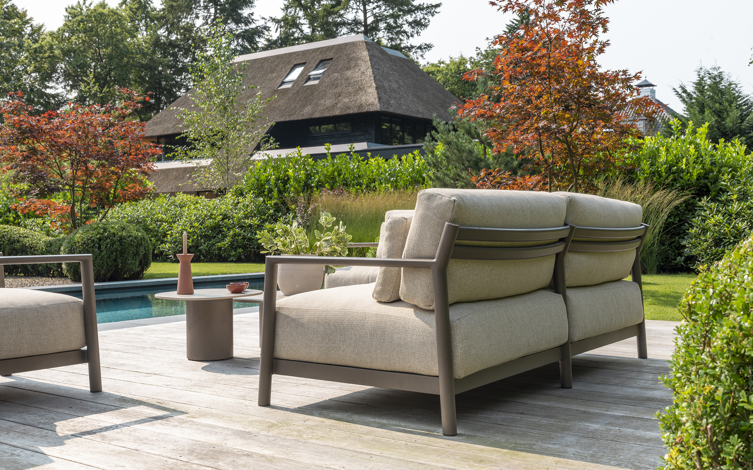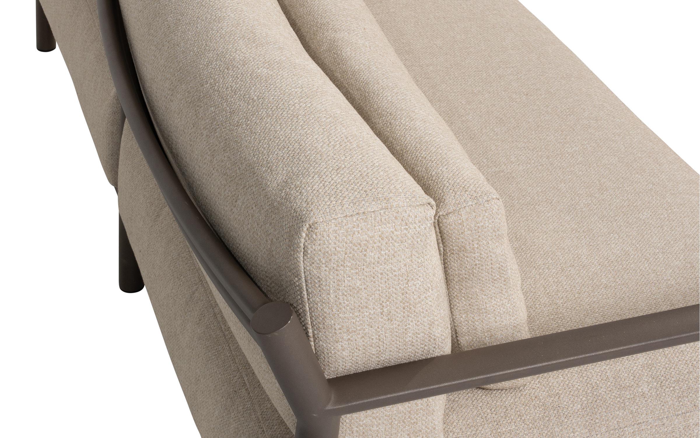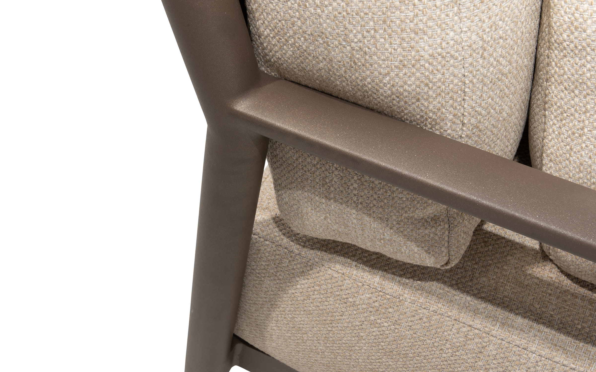 Sofa wypoczynkowa ma aluminiową ramę, która jest pokryta powłoką proszkową w kolorze ciemnobrązowym.