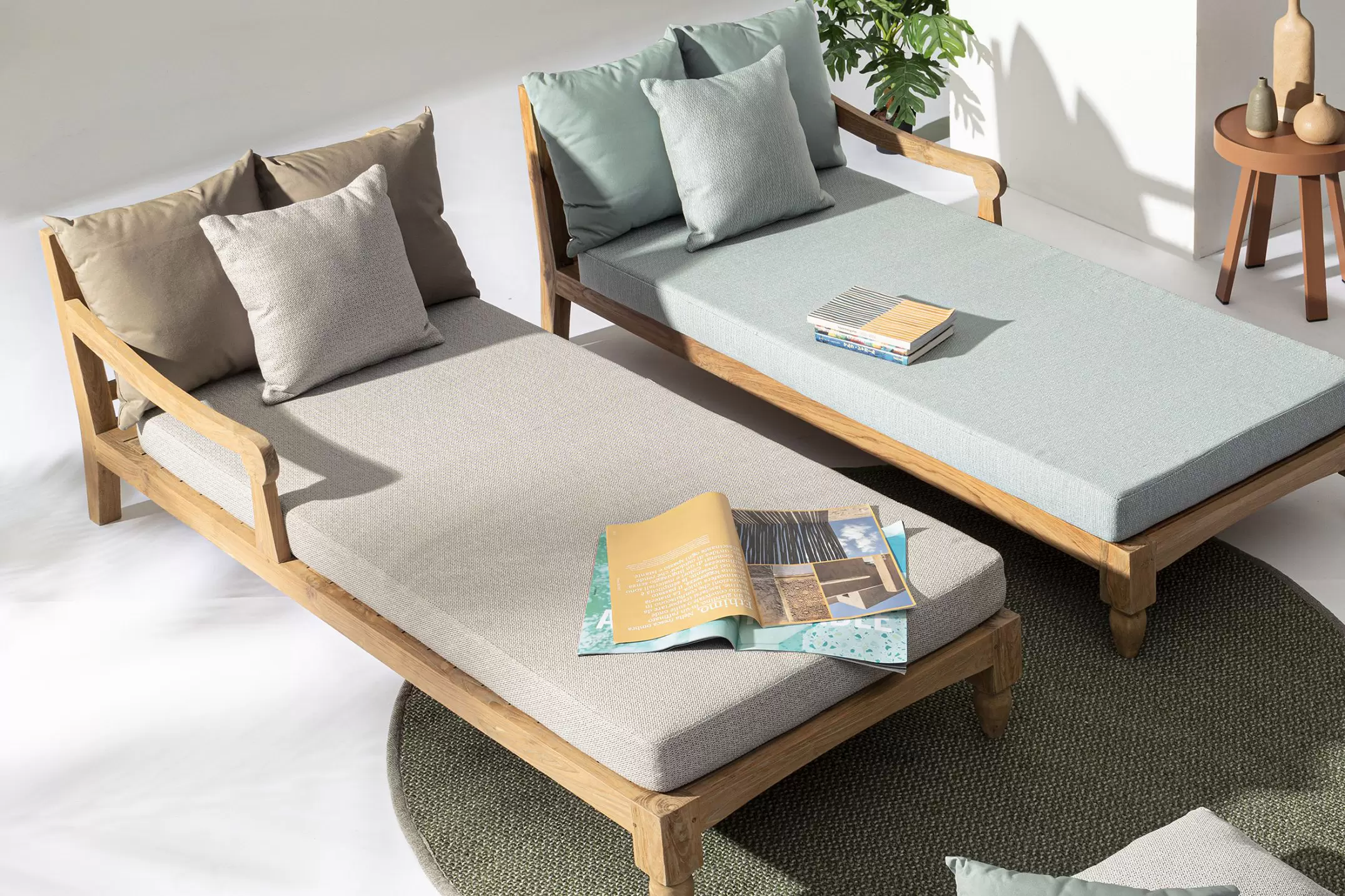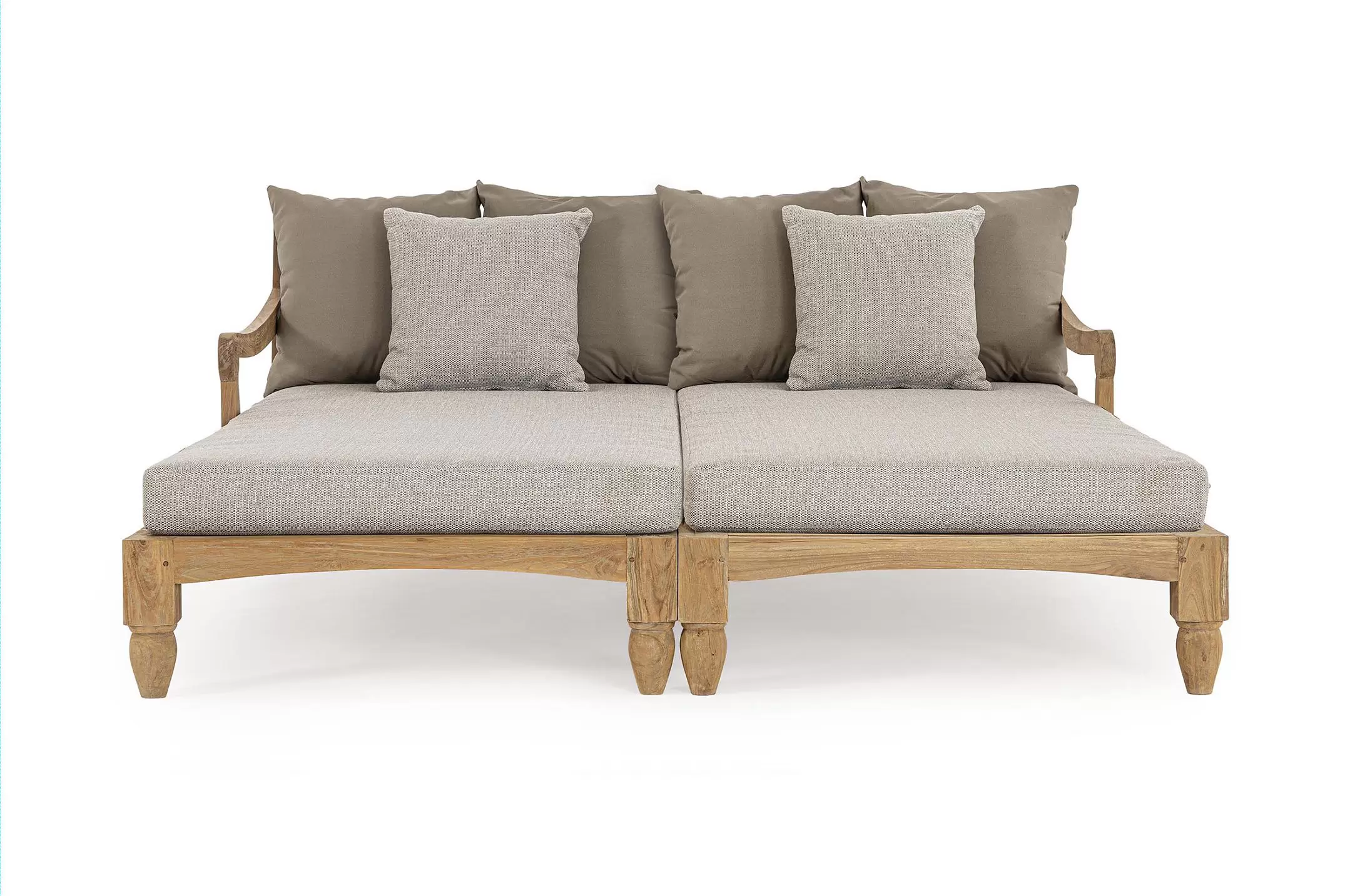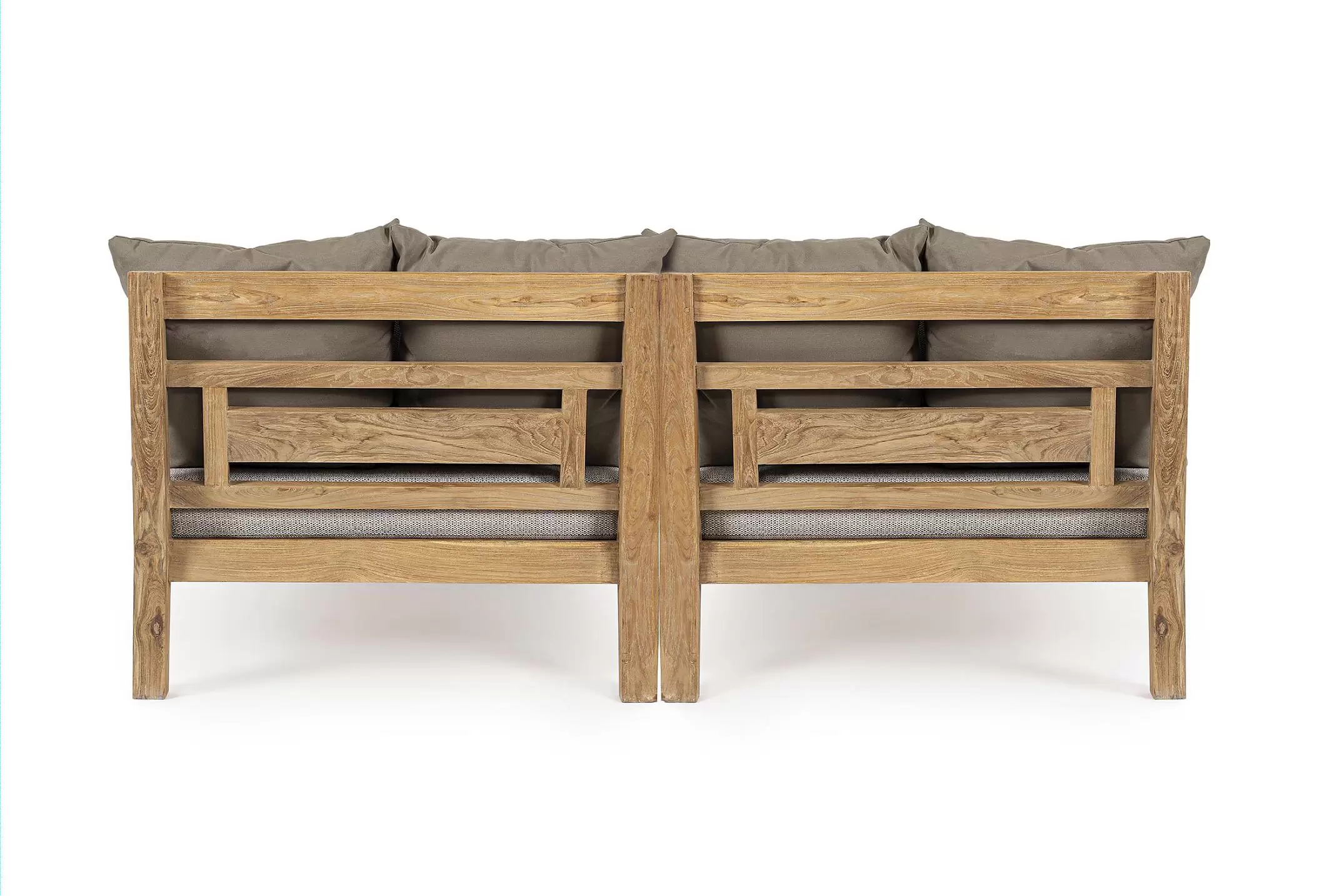 Zestaw 2 symetrycznych sof wykonany z piaskowanego drewna teakowego pokrytego wodnym lakierem nadającym naturalny a zarazem lekko głębszy kolor.