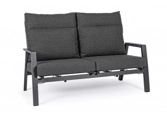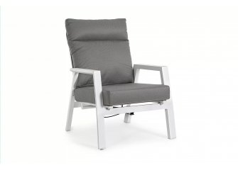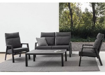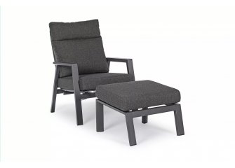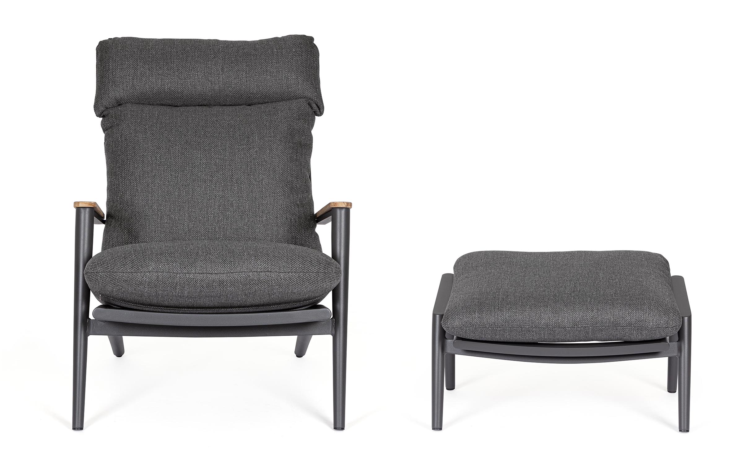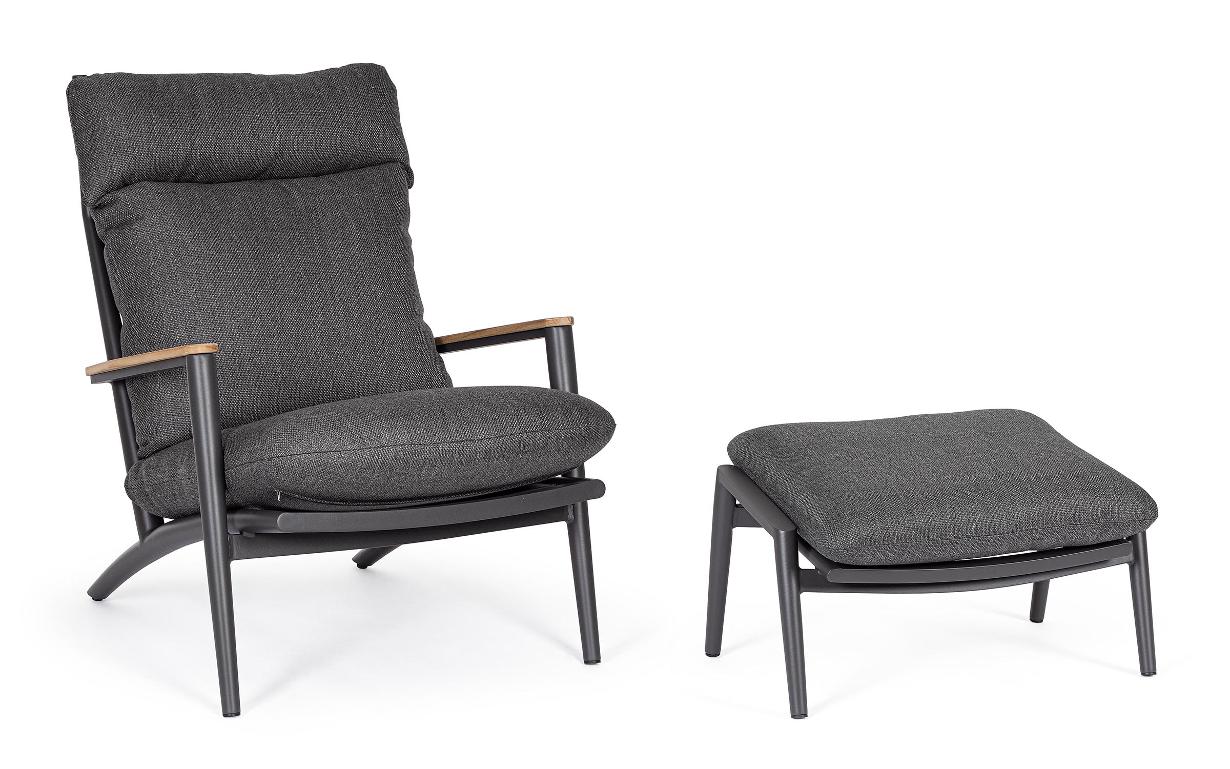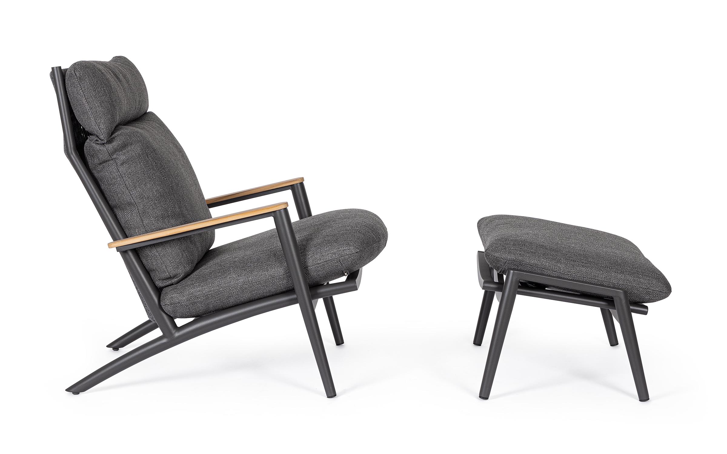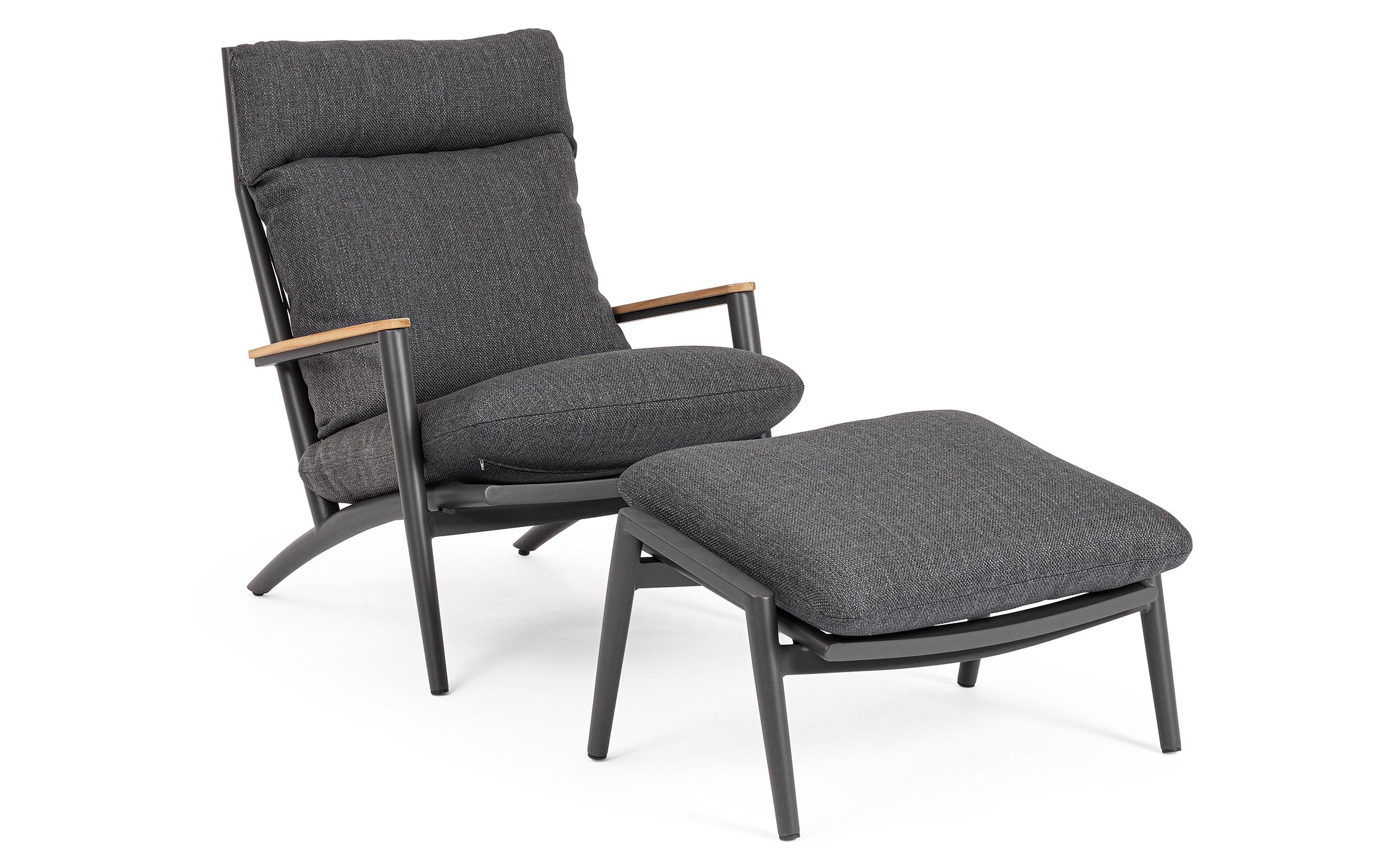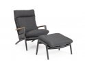 Duży, szeroki i wysoki fotel ogrodowy z podnóżkiem w grafitowym kolorze. Ozdobnie wyplatane oparcie z liny polipropylenowej oraz teakowe wstawki na podłokietnikach uzupełniają niecodzienny design tego wygodnego modelu.
