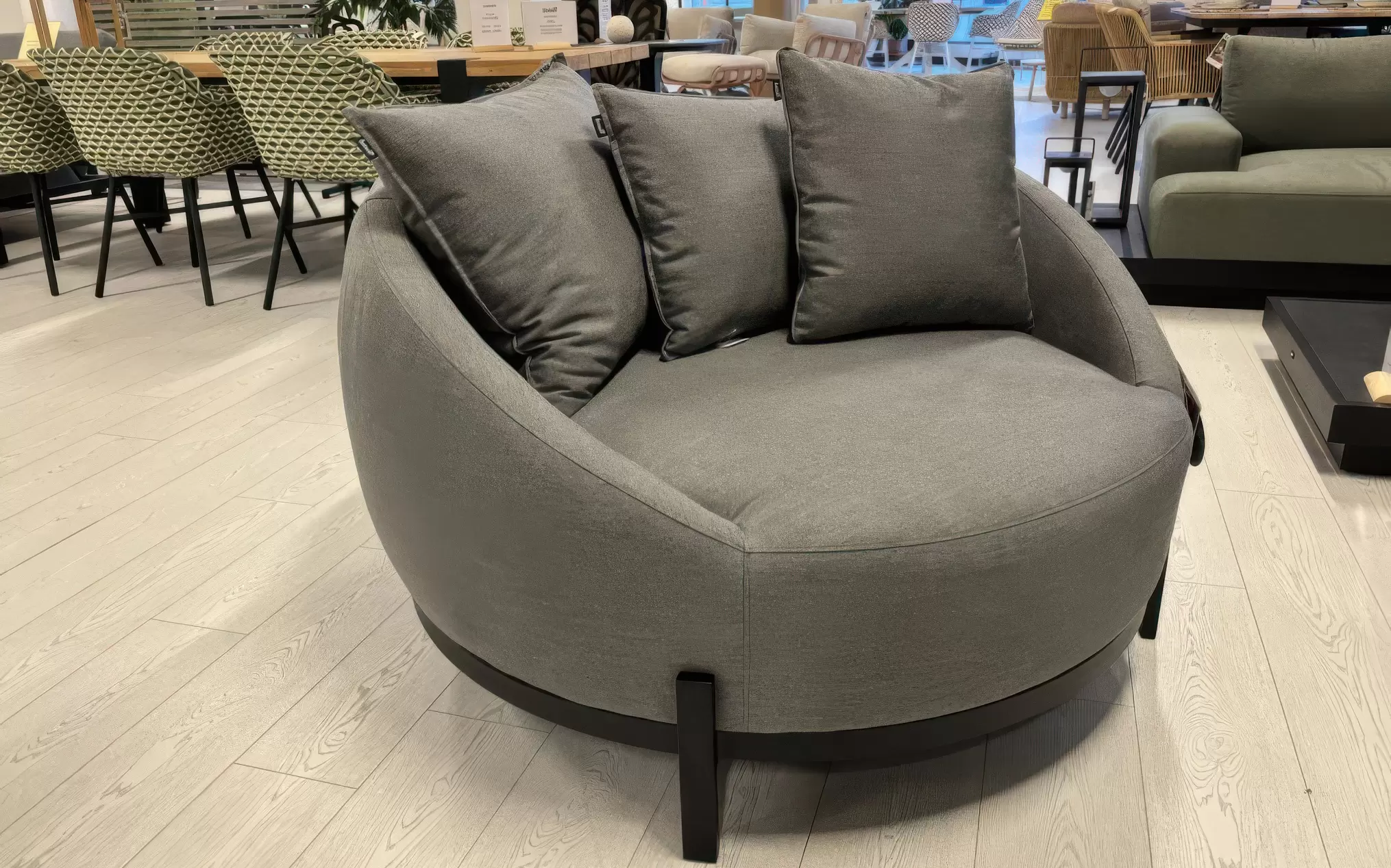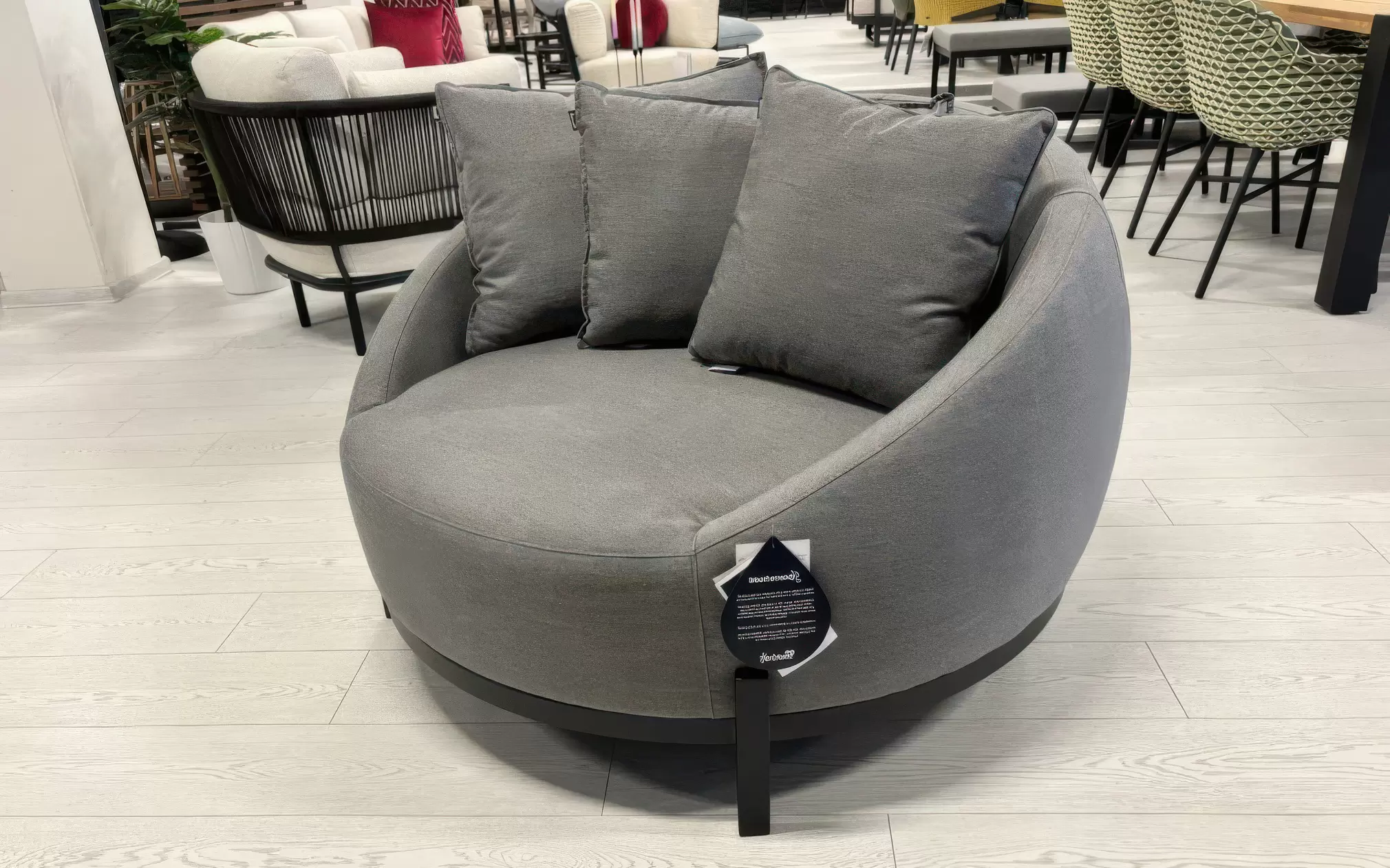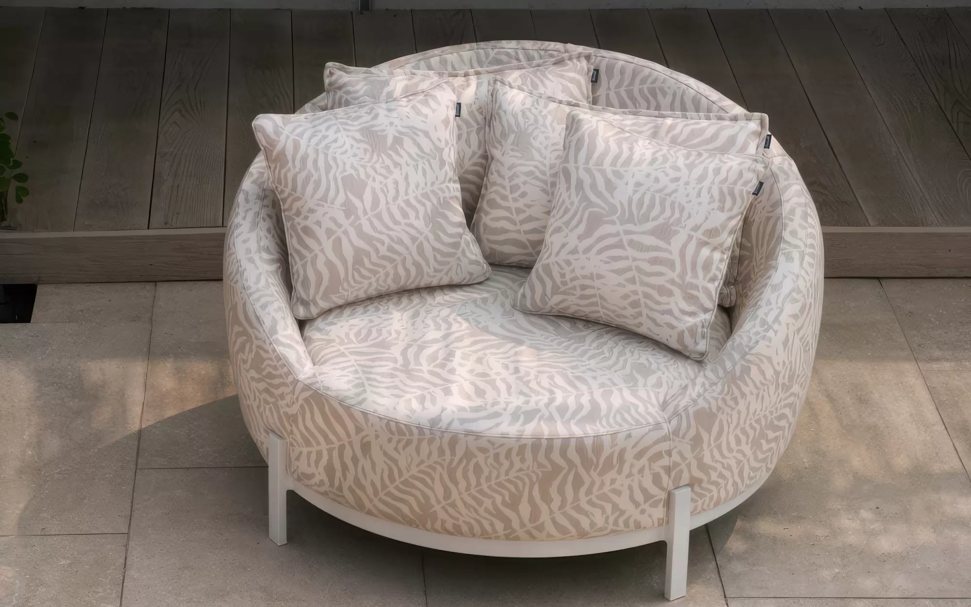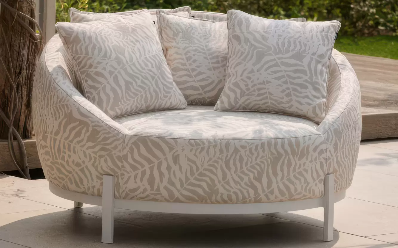 Tapicerka Sunbrella / All Weather ☀️ – zewnętrzna powłoka fotela to technologiczny majstersztyk w dziedzinie tekstyliów outdoorowych. Materiał ten jest w pełni oddychający, a zarazem całkowicie odporny na degradację promieniami UV, osadzanie się brudu i rozwój pleśni. Co istotne, zachowuje on niespotykaną na zewnątrz miękkość i strukturę przypominającą wysokogatunkowe tkaniny wnętrzarskie.