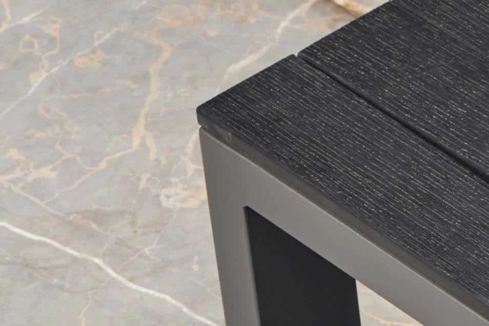 Proponujemy sofę ogrodową z kolekcji MALLORCA z aluminium w kolorze szarym z blatem z desek kompozytowych w kolorze czarnym.