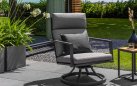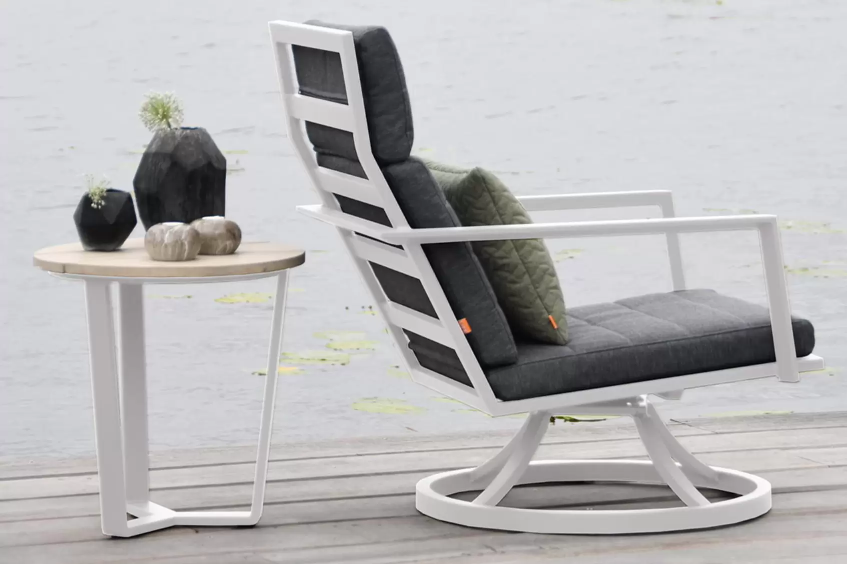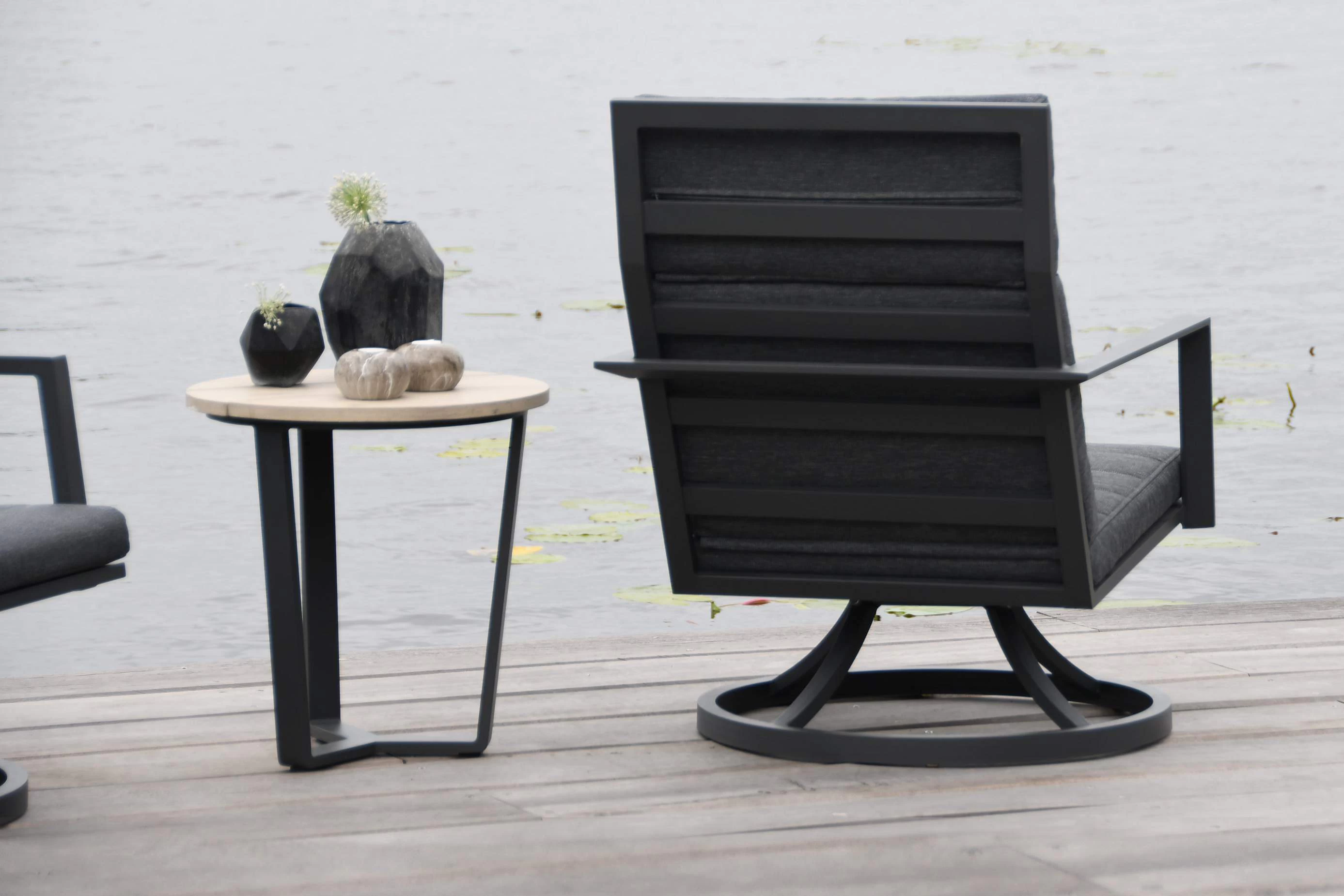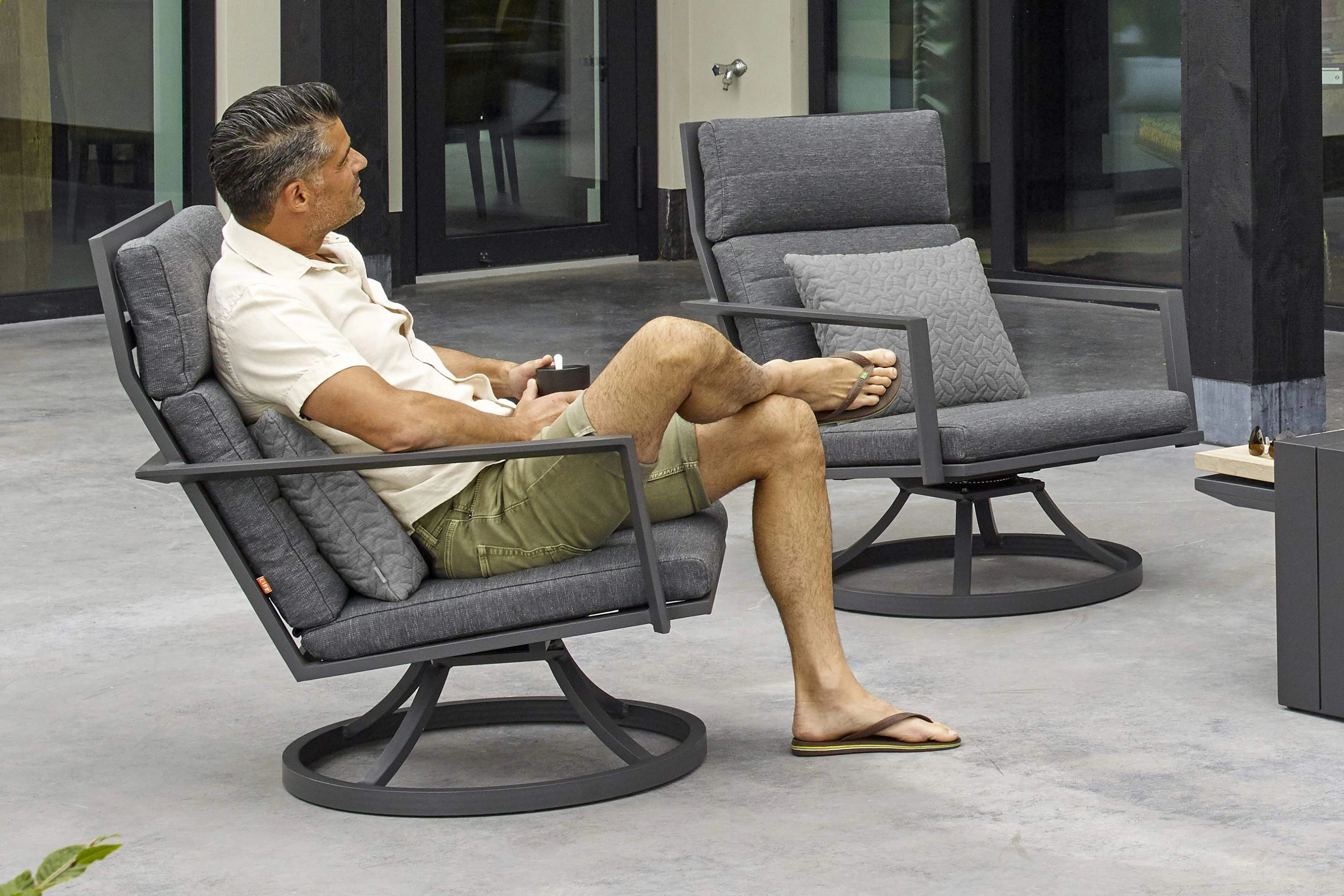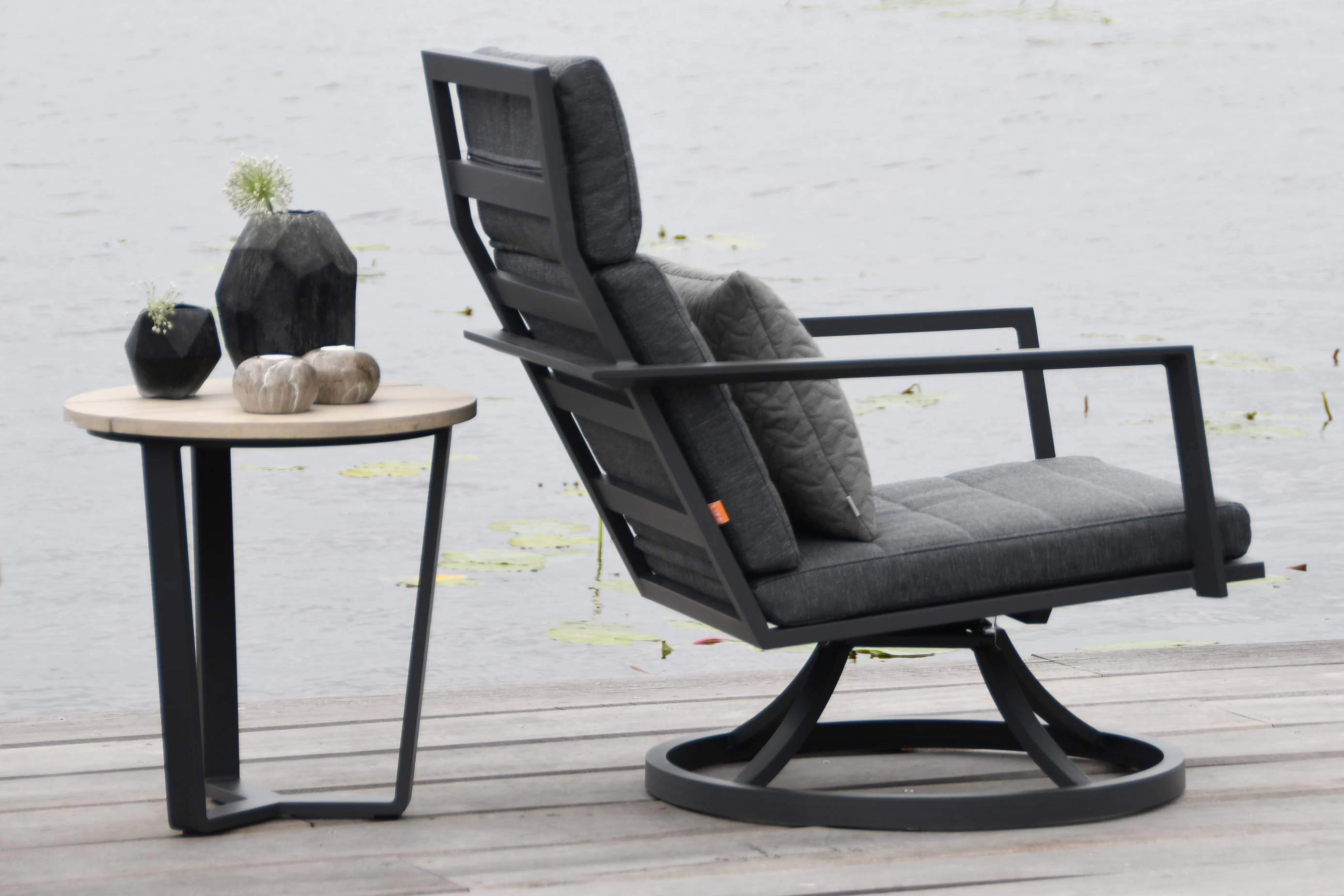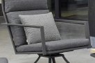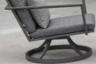 Obrotowy fotel ogrodowy Maroon to wygodny sposób odpoczynku na tarasie - można się w nim relaksować przez wiele godzin. Miękkie poduszki zapewniają wielogodzinną wygodę. Siedzisko fotela jest odchylone do tyłu, aby uzyskać maksymalnie wygodny kąt siedzenia. Ponieważ może obracać się o 360 stopni, słońce może być naprzeciwko Ciebie! Rama wykonana z aluminium malowanego proszkowo na kolor ciemnoszary. Okrągła podstawa krzesła ładnie kontrastuje z prostymi kątami podłokietników.