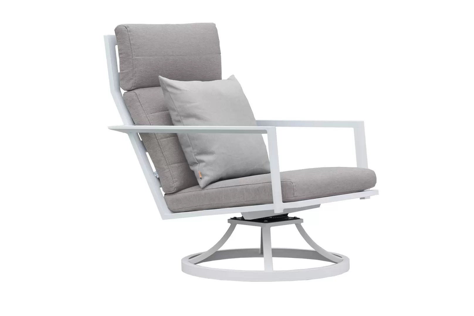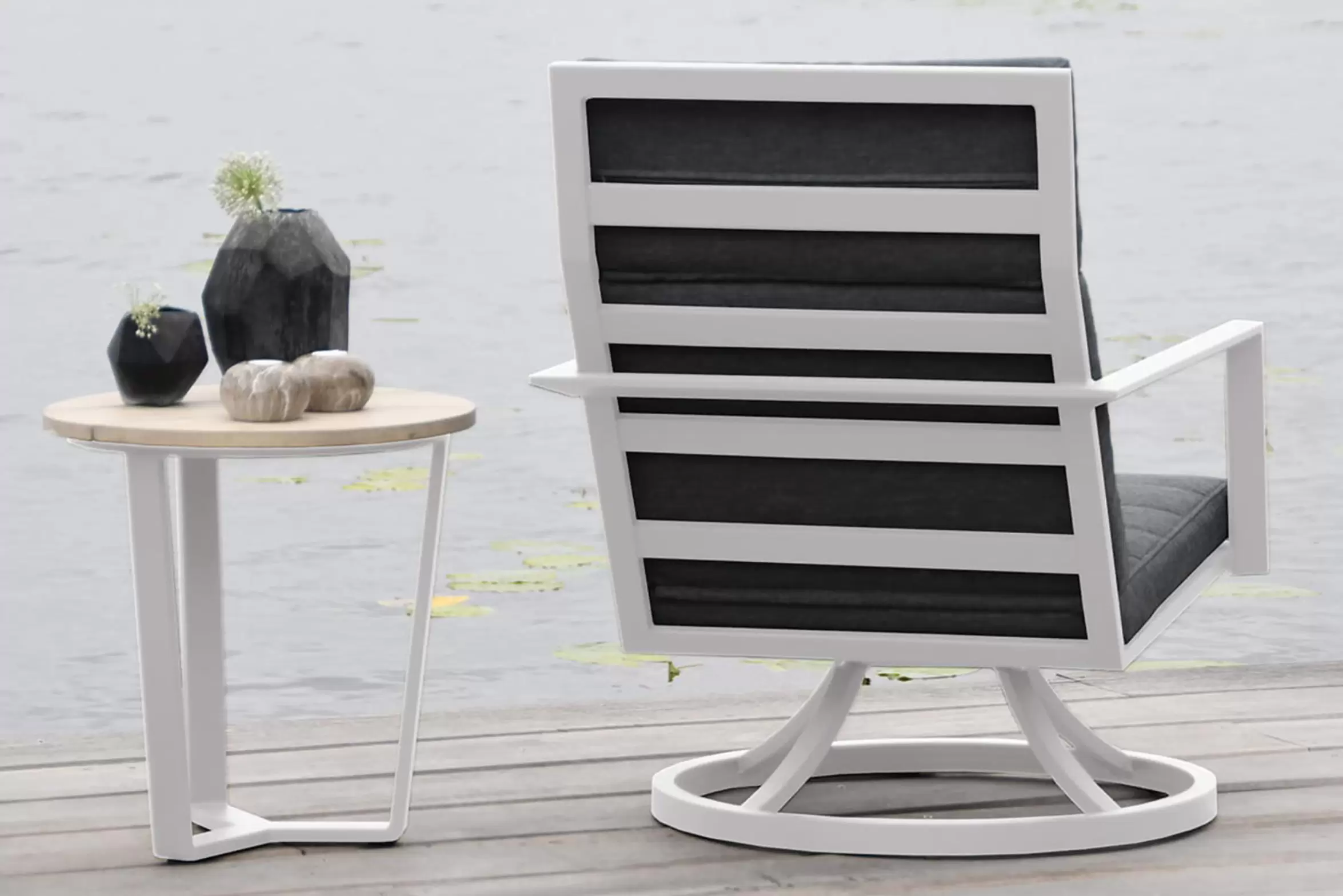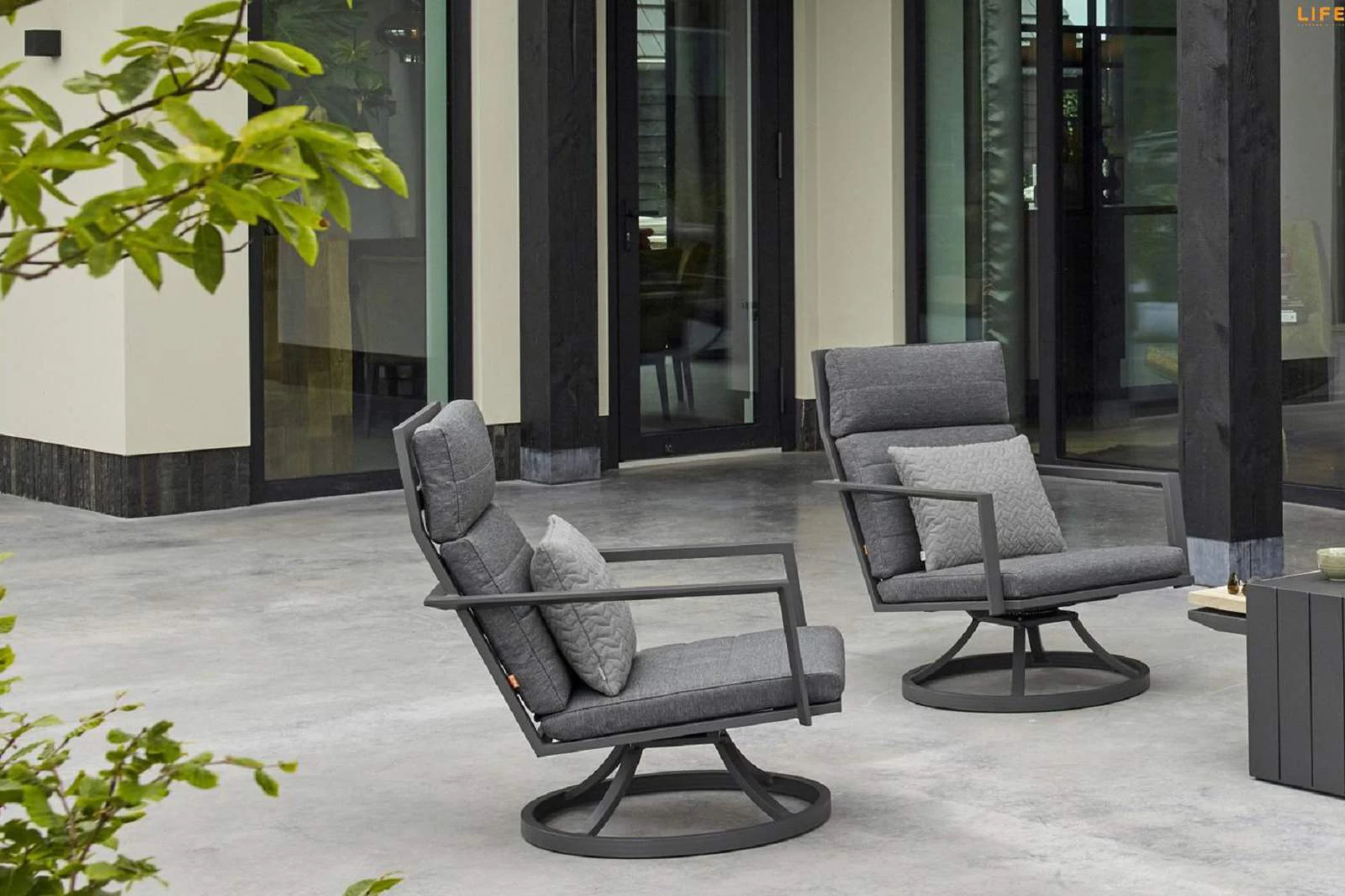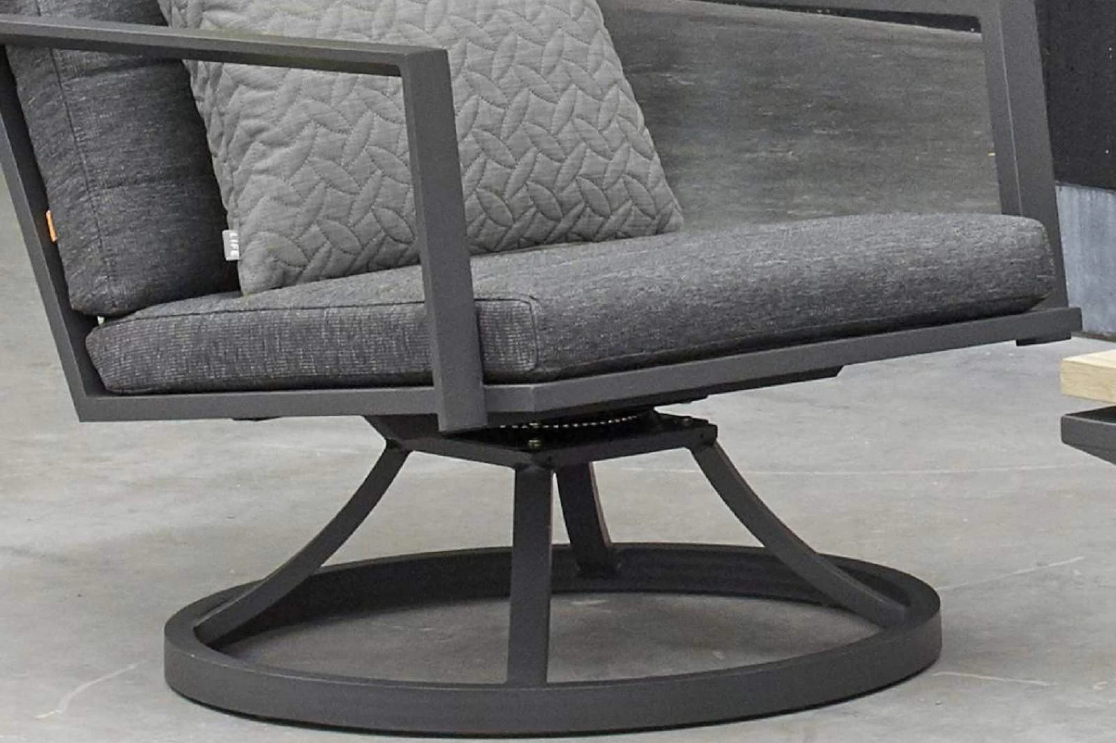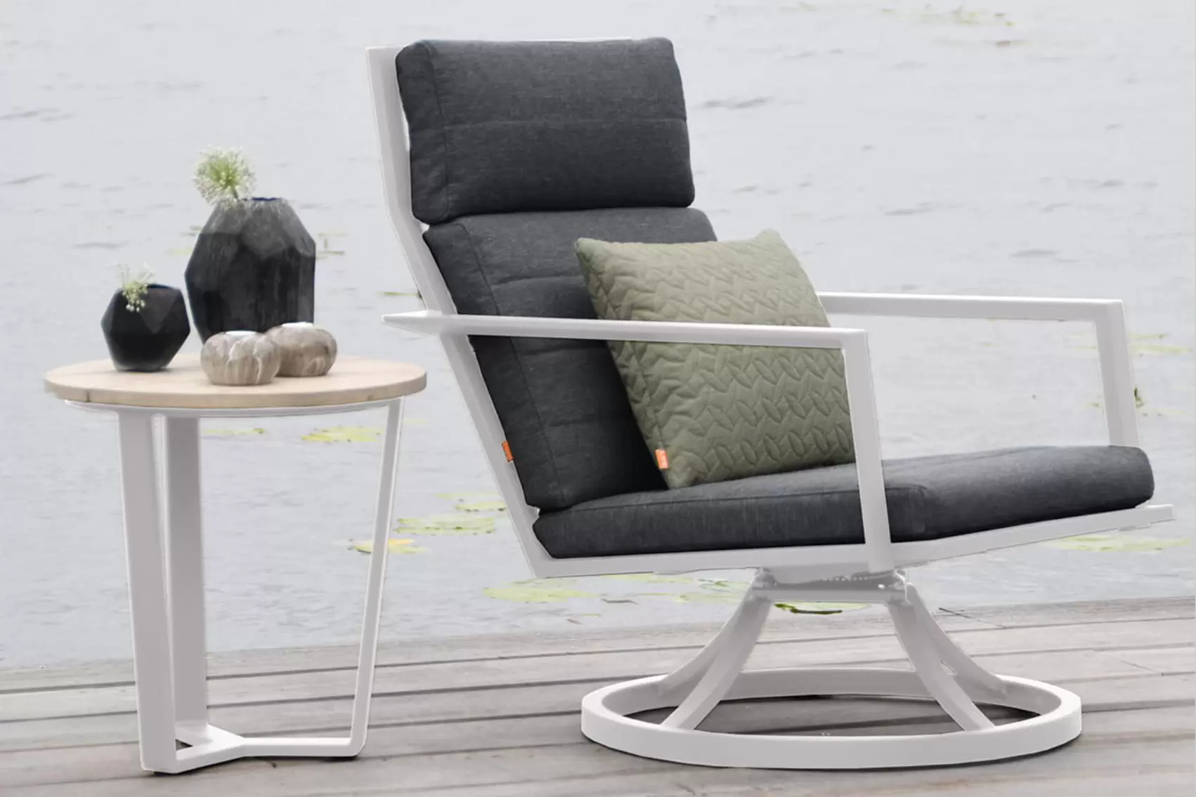 Obrotowy fotel ogrodowy Maroon to wygodny sposób odpoczynku na tarasie - można się w nim relaksować przez wiele godzin. Miękkie poduszki zapewniają wielogodzinną wygodę. Siedzisko fotela jest odchylone do tyłu, aby uzyskać maksymalnie wygodny kąt siedzenia. Ponieważ może obracać się o 360 stopni, słońce może być naprzeciwko Ciebie! Rama wykonana z aluminium malowanego proszkowo na kolor ciemnoszary. Okrągła podstawa krzesła ładnie kontrastuje z prostymi kątami podłokietników.