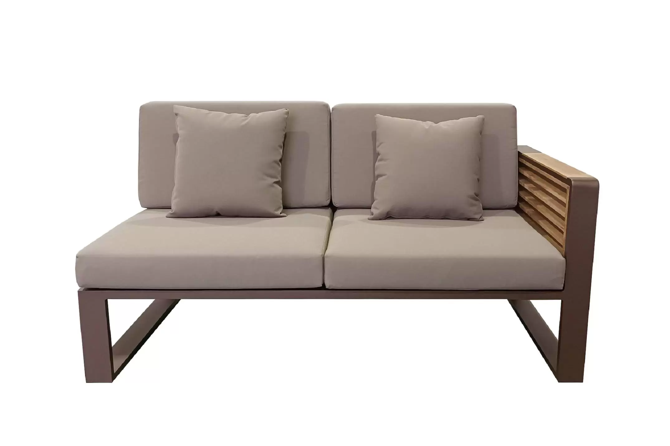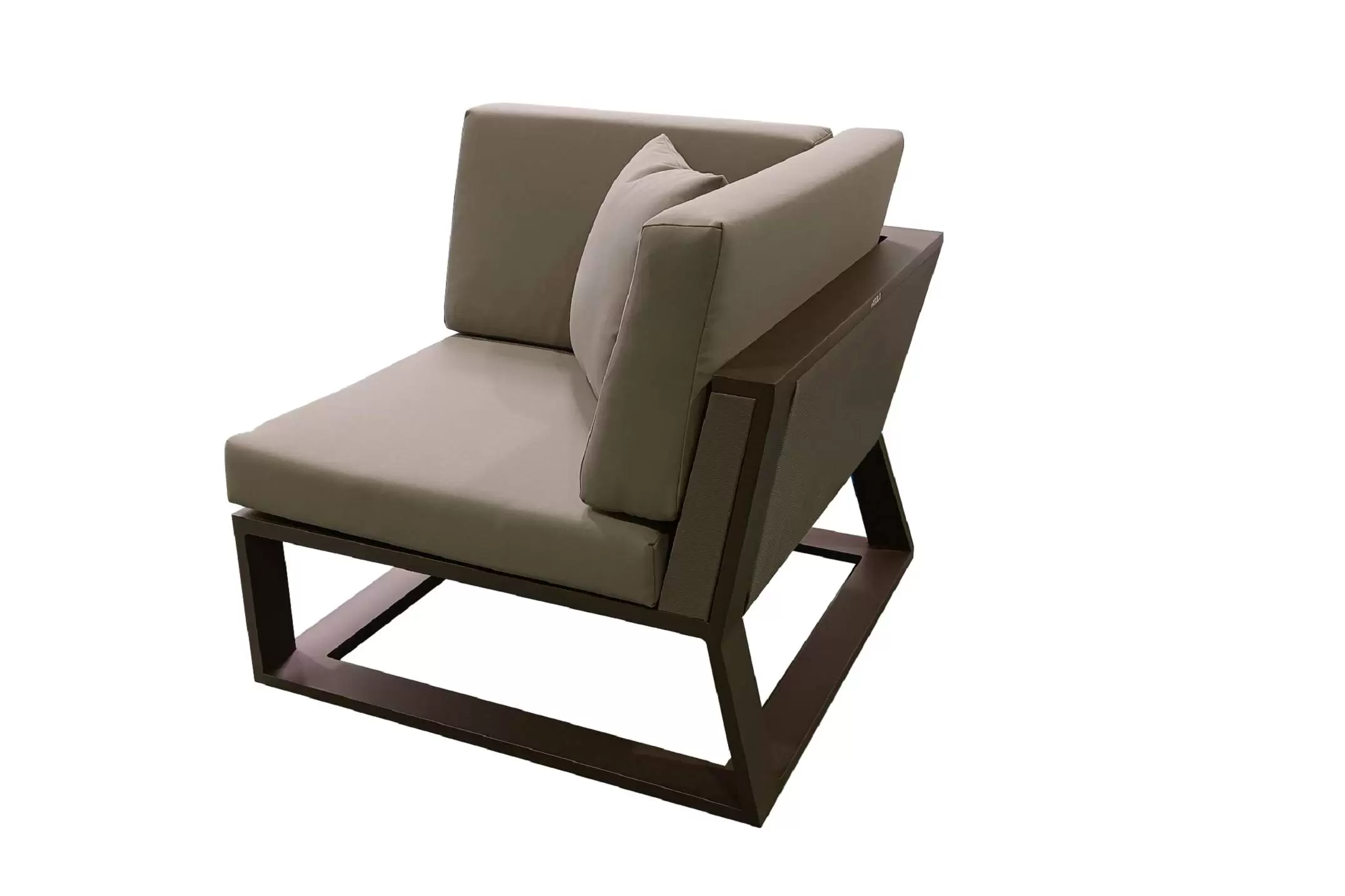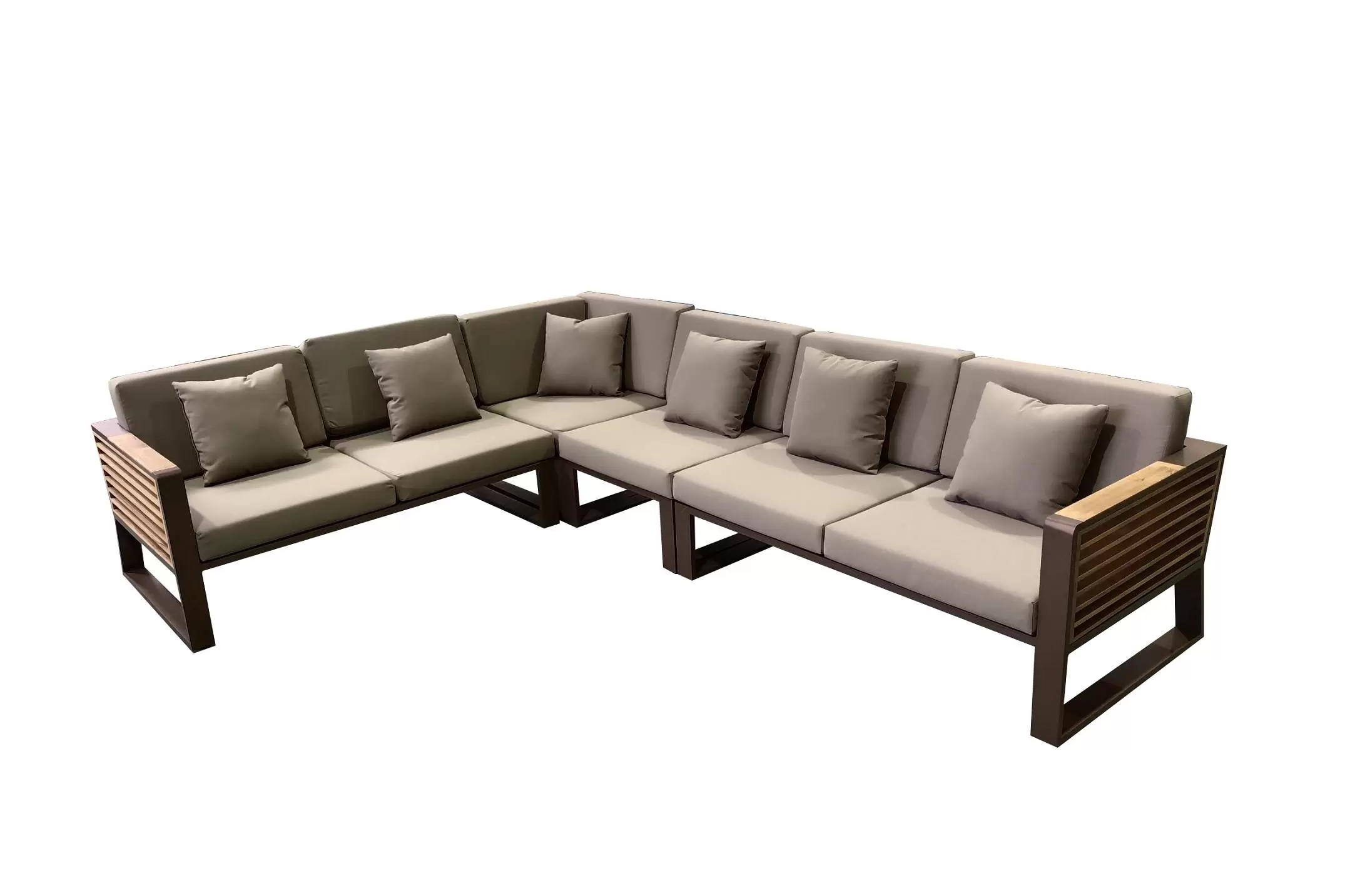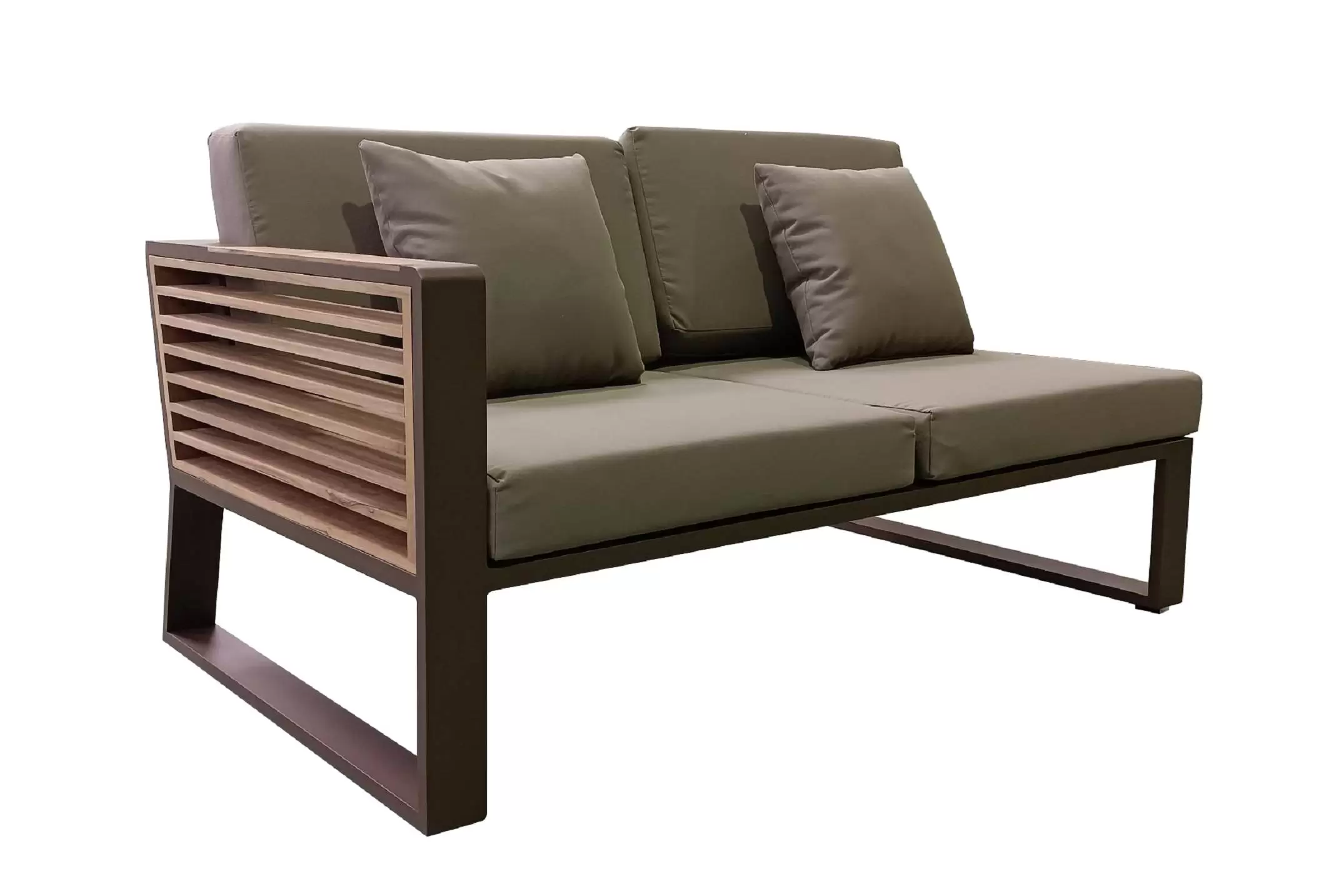 Nowoczesny modułowy komplet narożnikowy na taras firmy HIGOLD. Konstrukcja opiera się na spawanej ramie aluminiowej malowanej proszkowo, elementach dekoracyjnych z teaku i wygodnych poduszkach z obiciami z materiału Olefin. Poduszki położone na opinającej ramę tekstylinie.