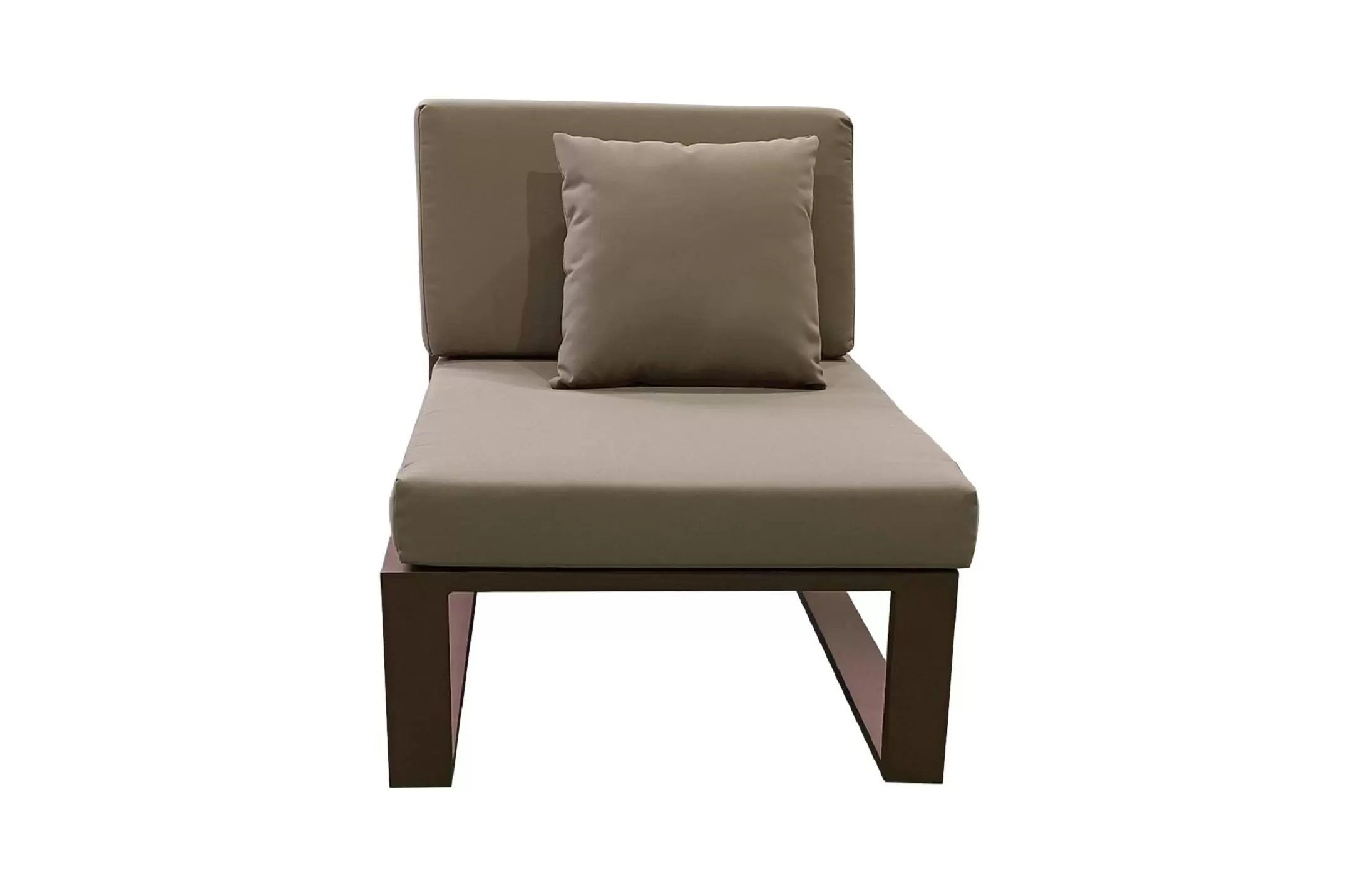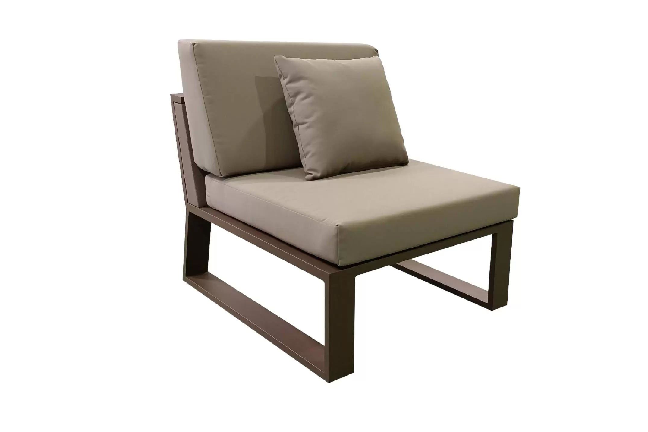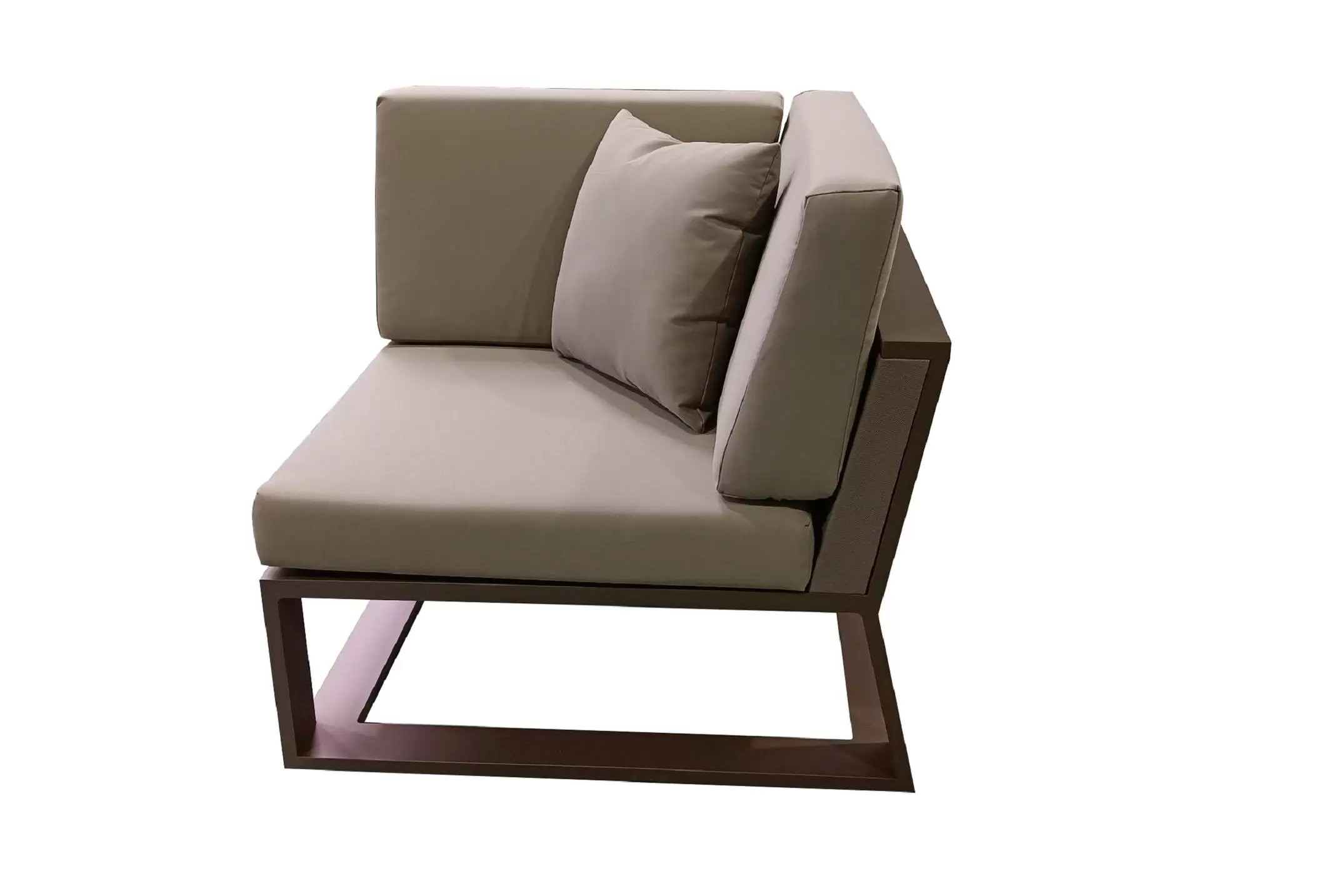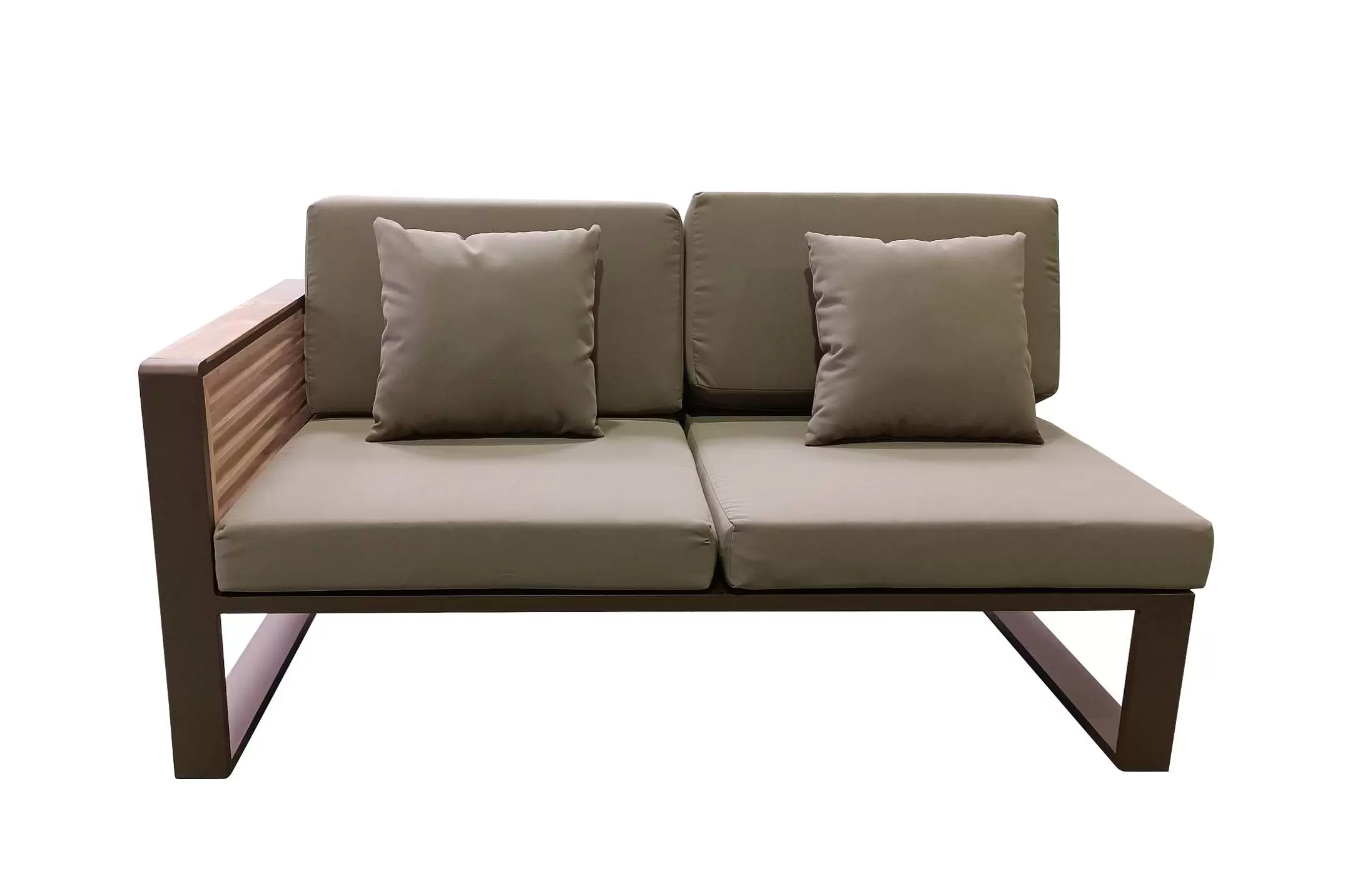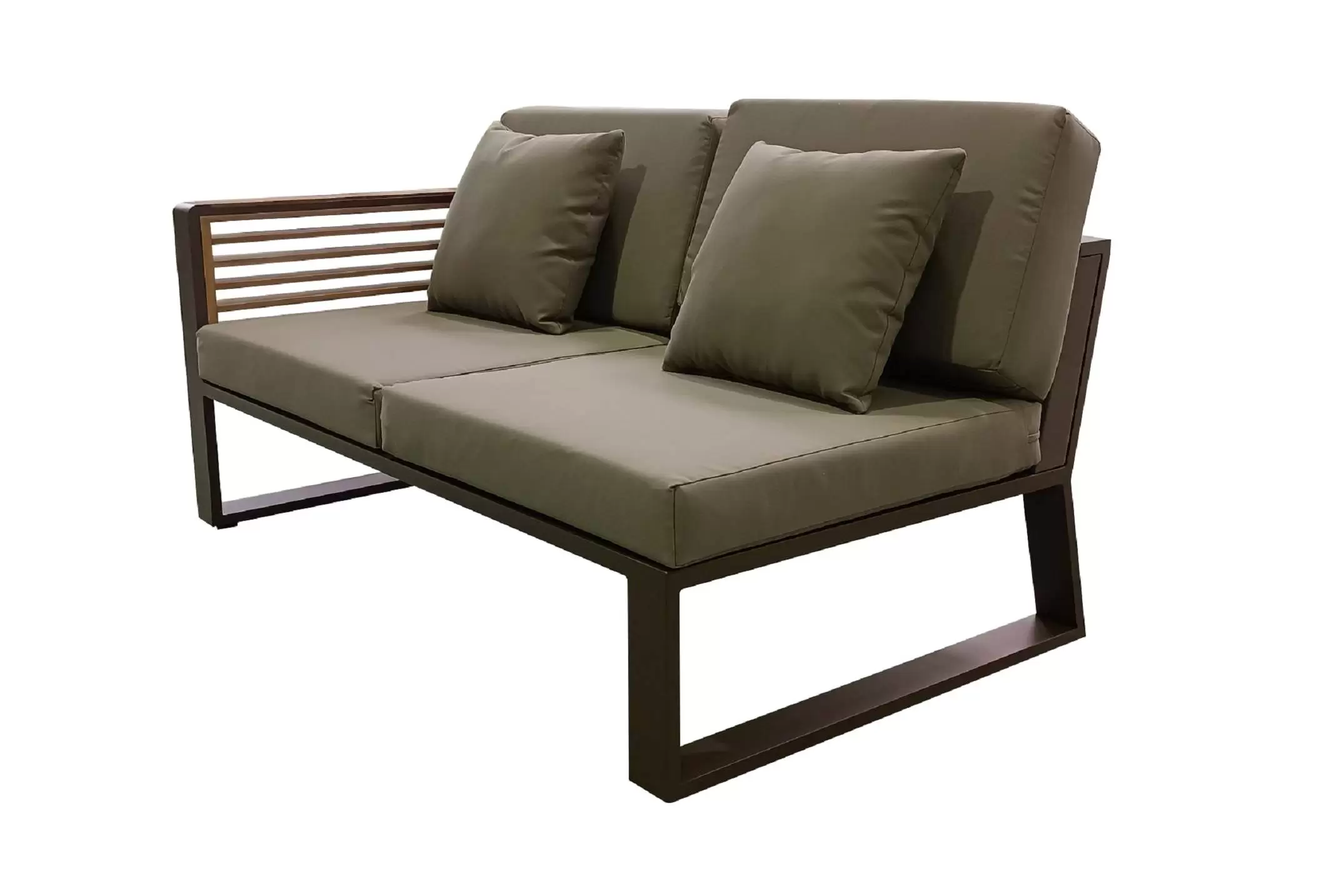 Nowoczesny modułowy komplet narożnikowy na taras firmy HIGOLD. Konstrukcja opiera się na spawanej ramie aluminiowej malowanej proszkowo, elementach dekoracyjnych z teaku i wygodnych poduszkach z obiciami z materiału Olefin. Poduszki położone na opinającej ramę tekstylinie.