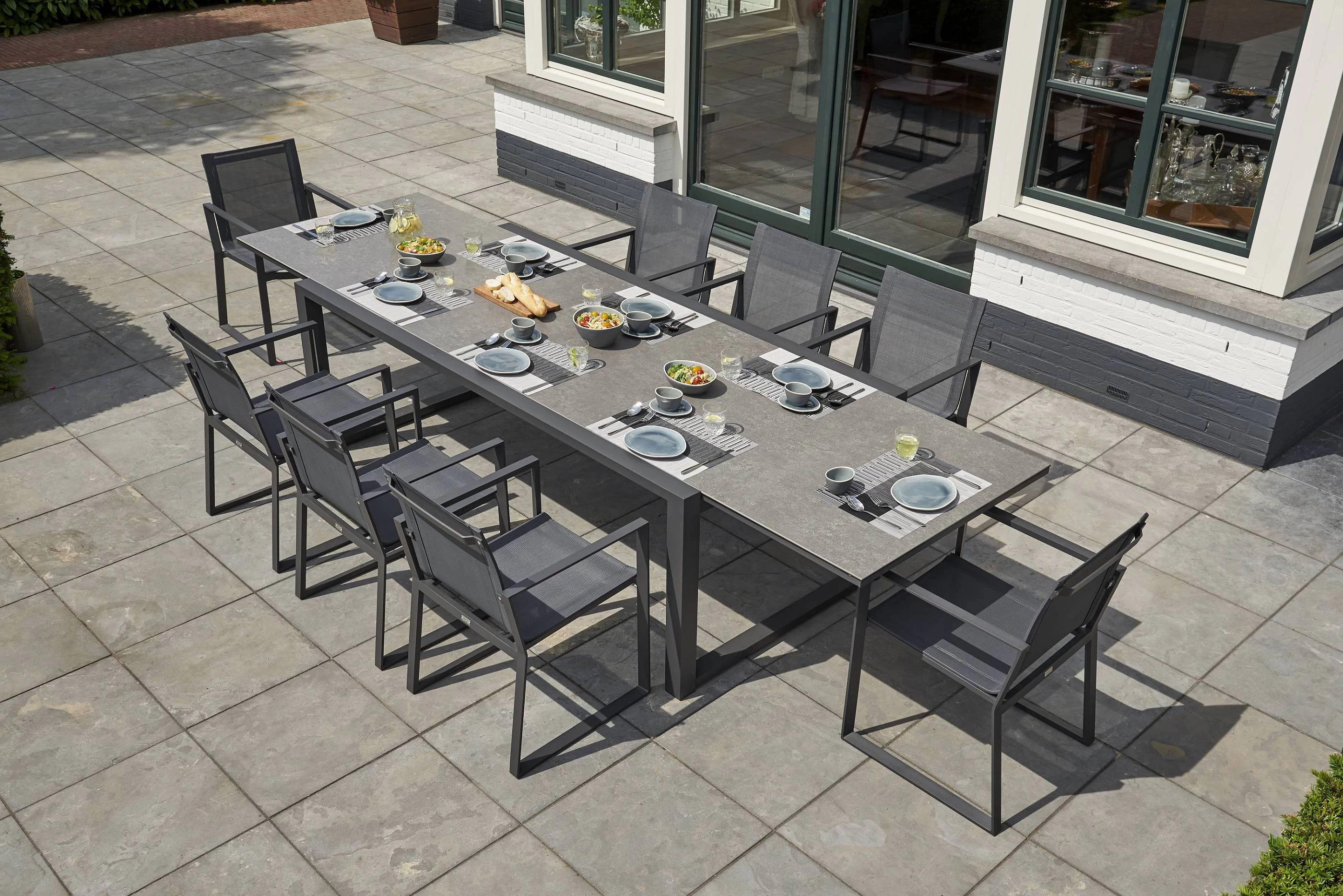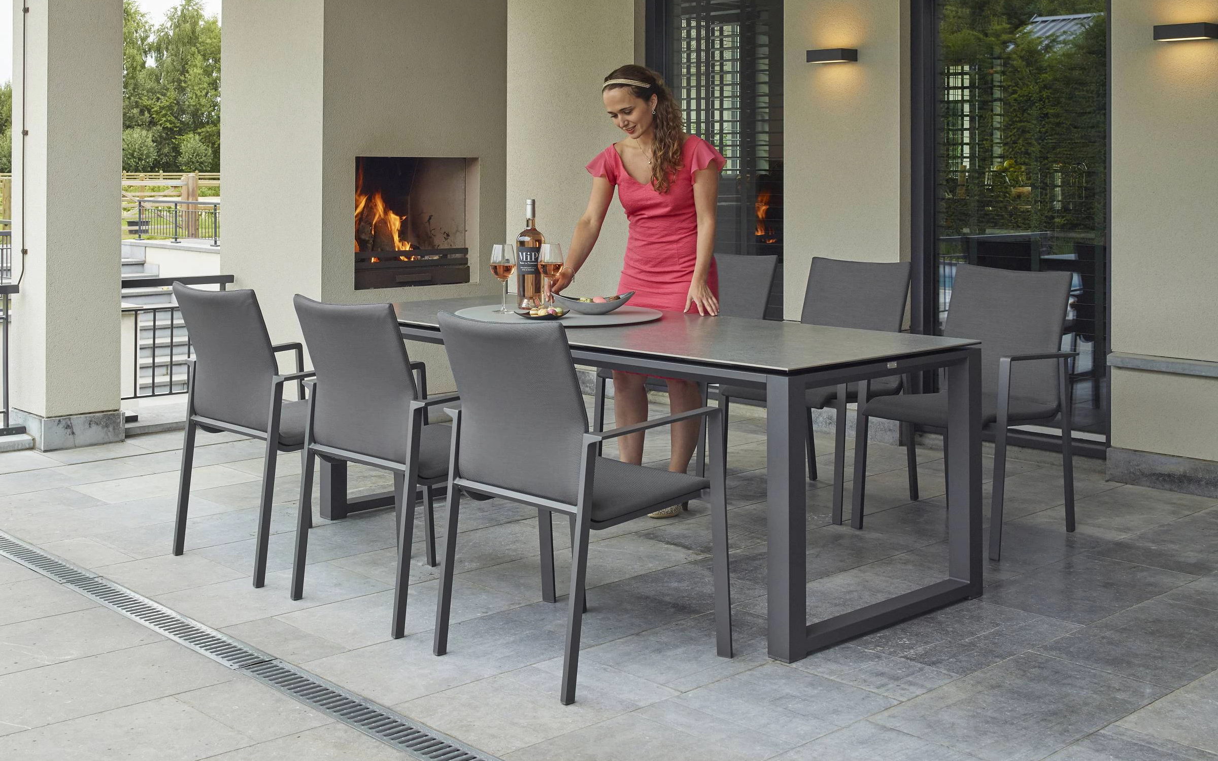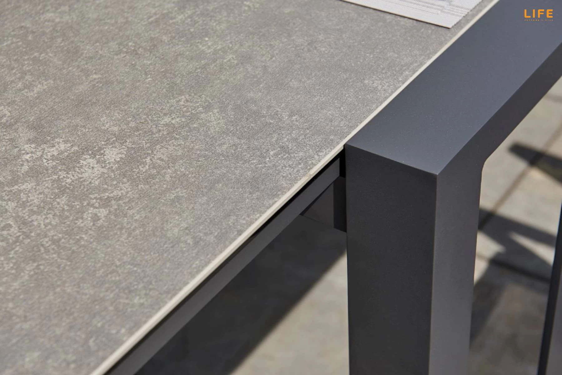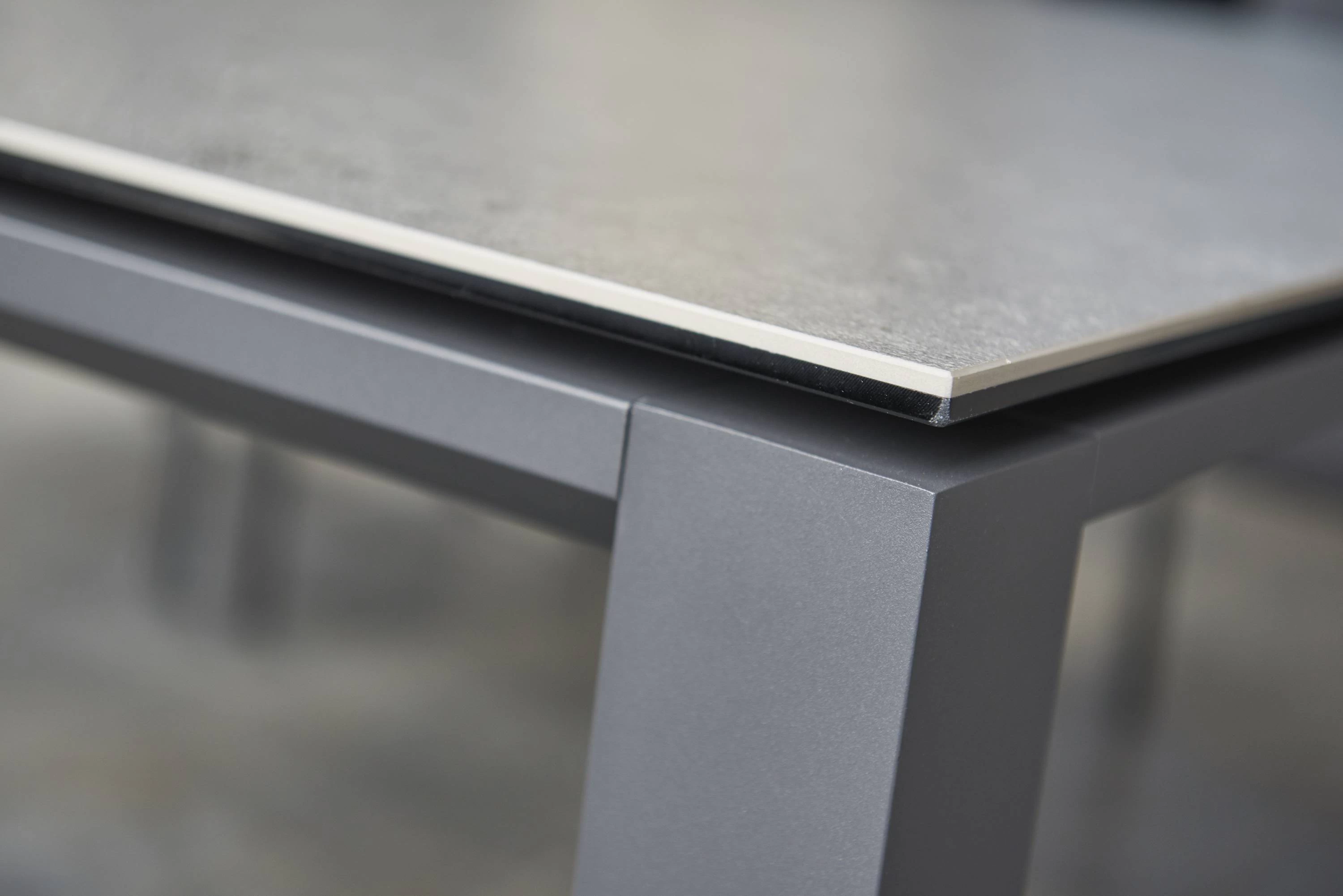 Stół Primavera jest dostępny jako rozsuwany stół od 220 cm do 340 cm z trwałym i eleganckim blatem ceramicznym w szarym wykończeniu "beton look". Mechanizm rozsuwania jest idealnie płynny, a wyciąganie środkowego elementu jest bardzo proste, ponieważ wstawka porusza się na mimośrodowym połączeniu. Jedno pociągnięcie do góry i wskakuje na odpowiednie miejsce. Nogi w kolorze ciemnoszarym.