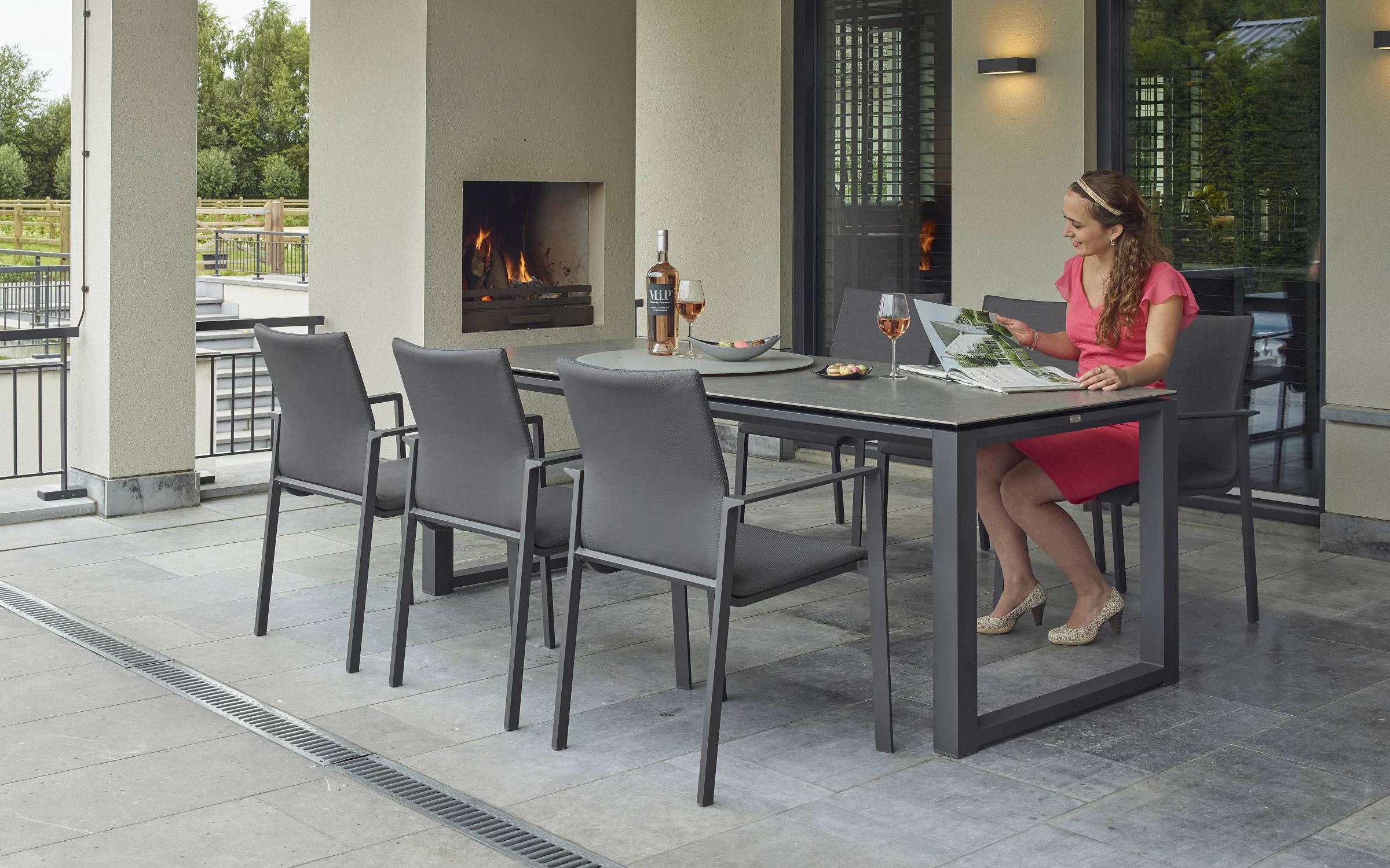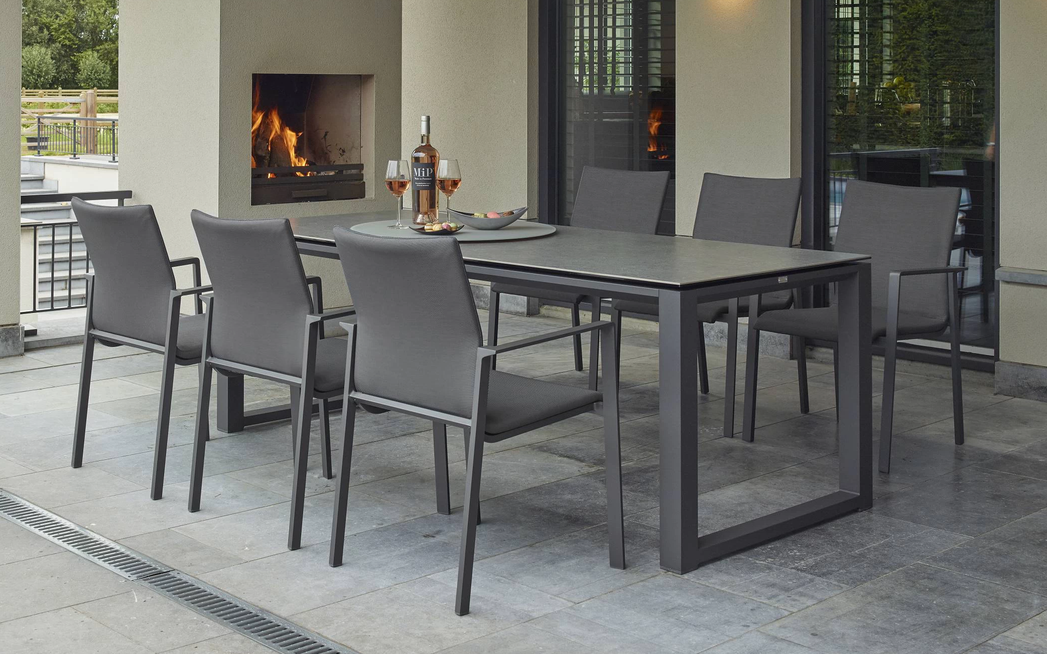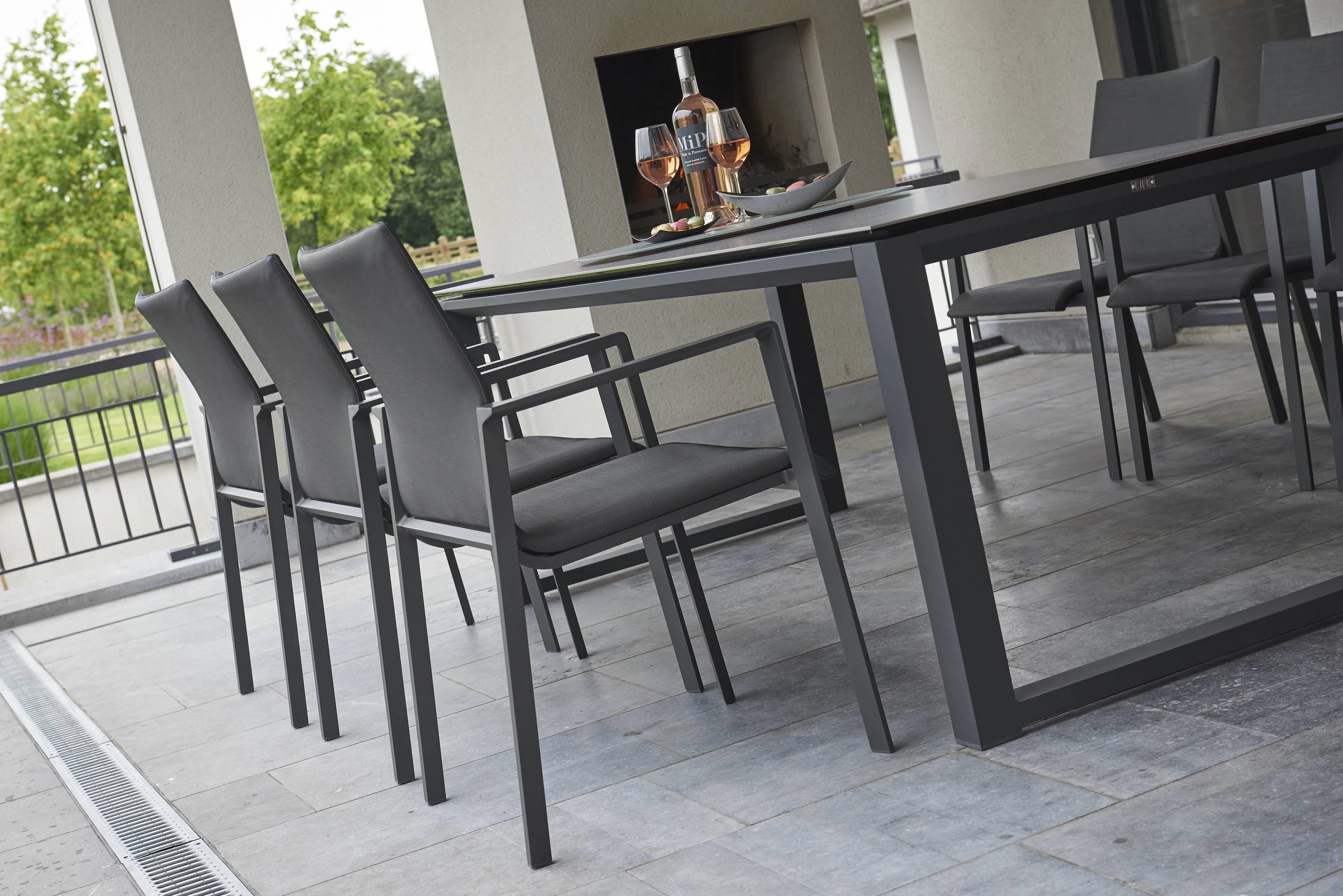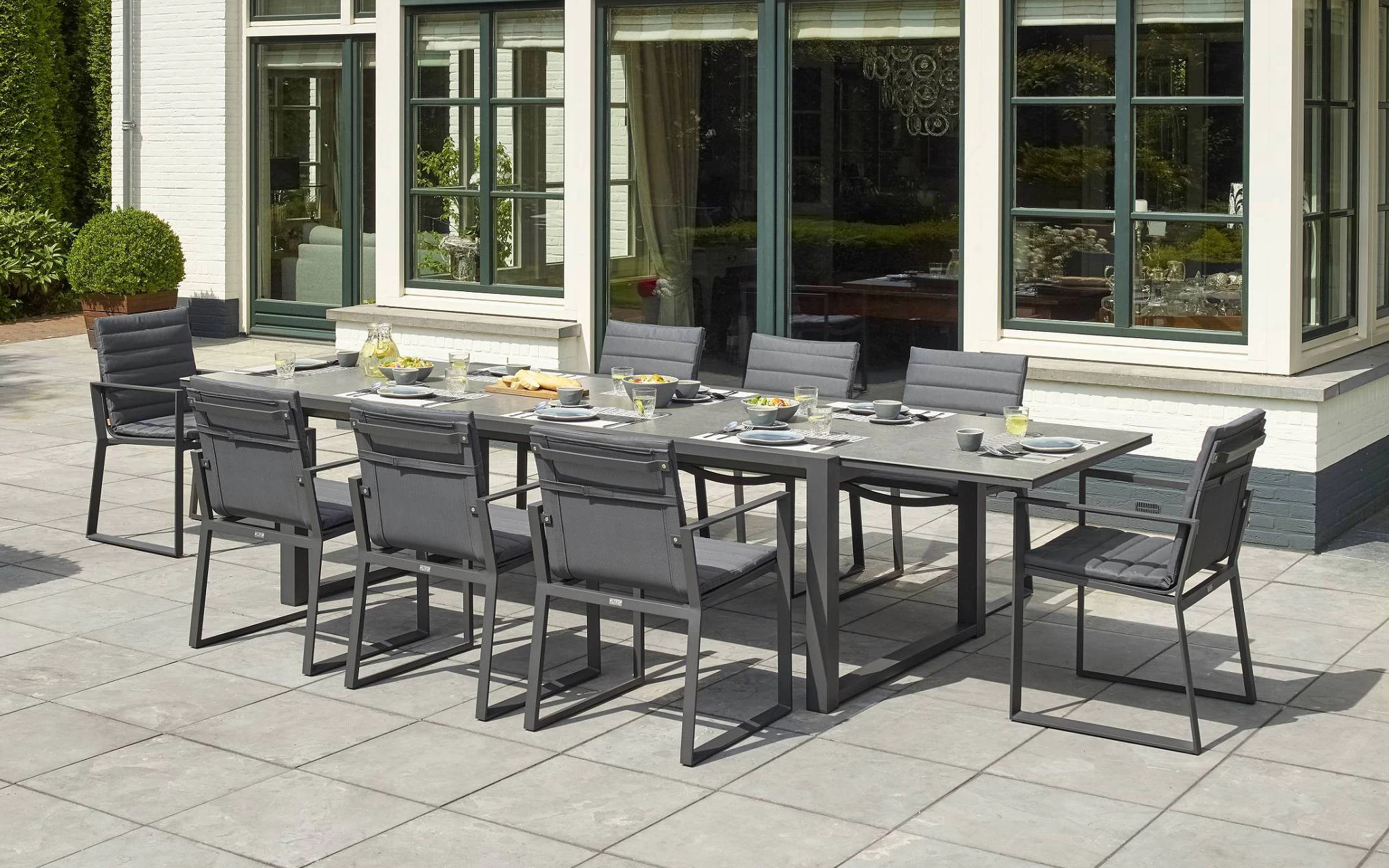 Stół Primavera jest dostępny jako rozsuwany stół od 220 cm do 340 cm z trwałym i eleganckim blatem ceramicznym w szarym wykończeniu "beton look". Mechanizm rozsuwania jest idealnie płynny, a wyciąganie środkowego elementu jest bardzo proste, ponieważ wstawka porusza się na mimośrodowym połączeniu. Jedno pociągnięcie do góry i wskakuje na odpowiednie miejsce. Nogi w kolorze ciemnoszarym.