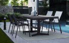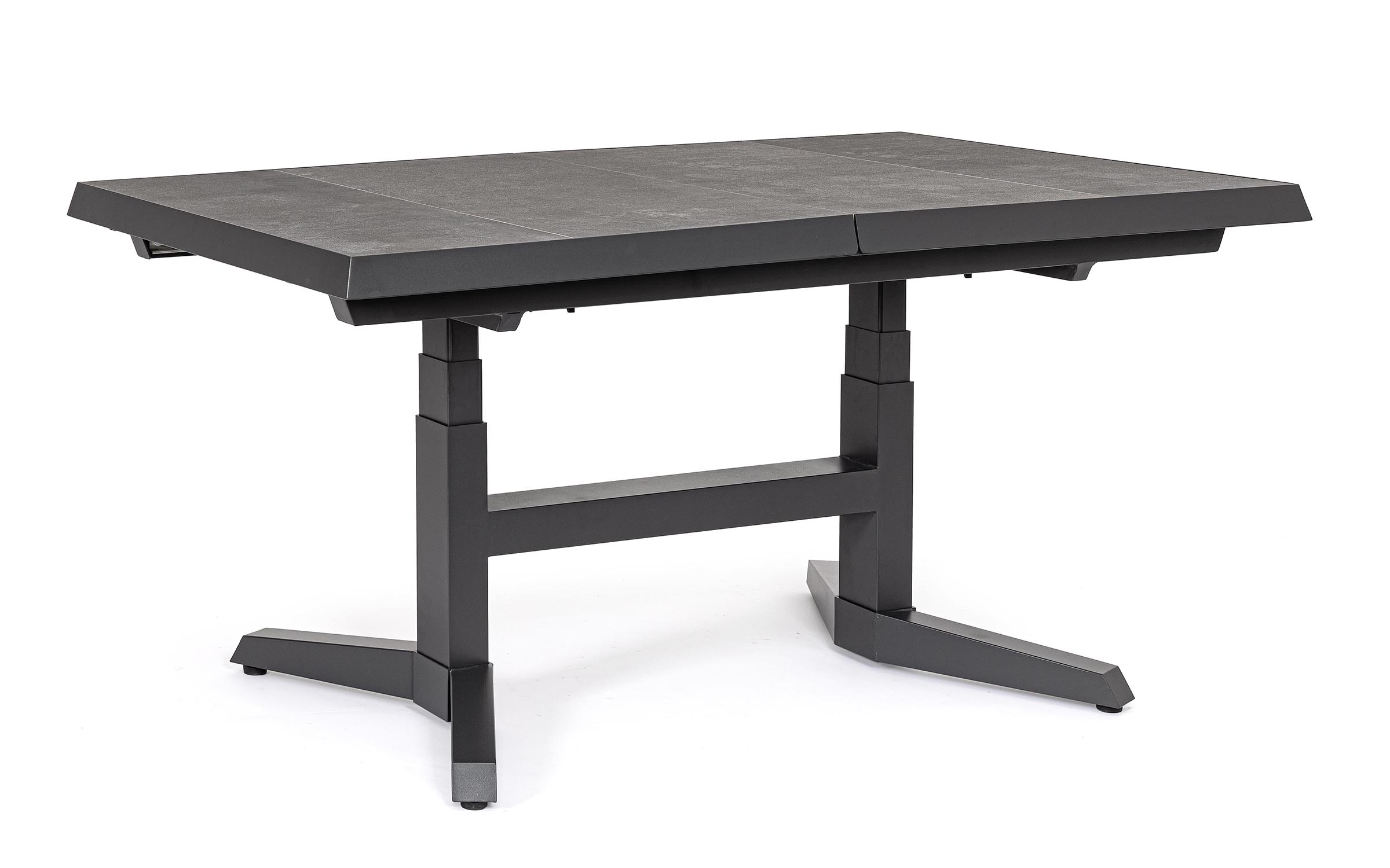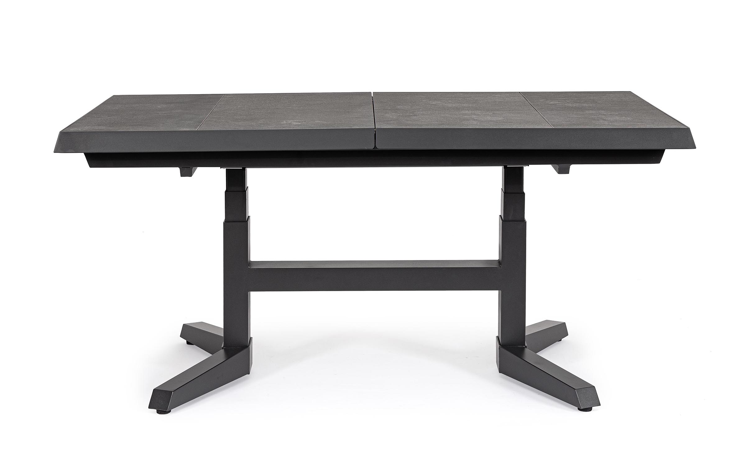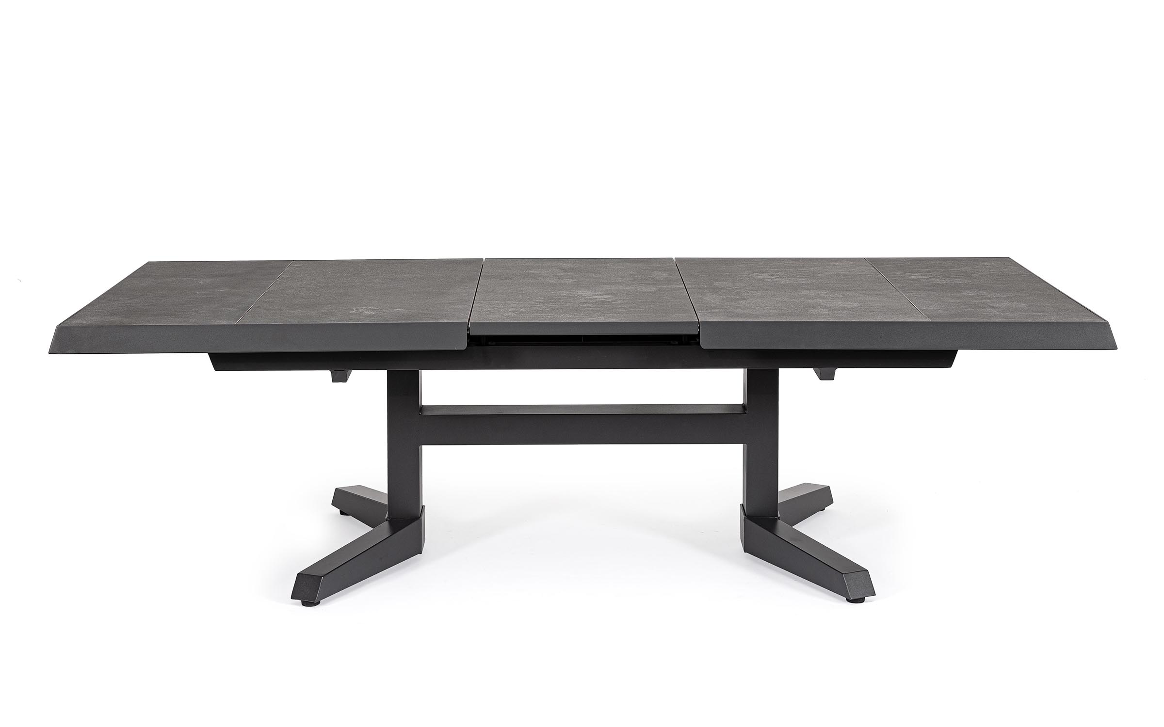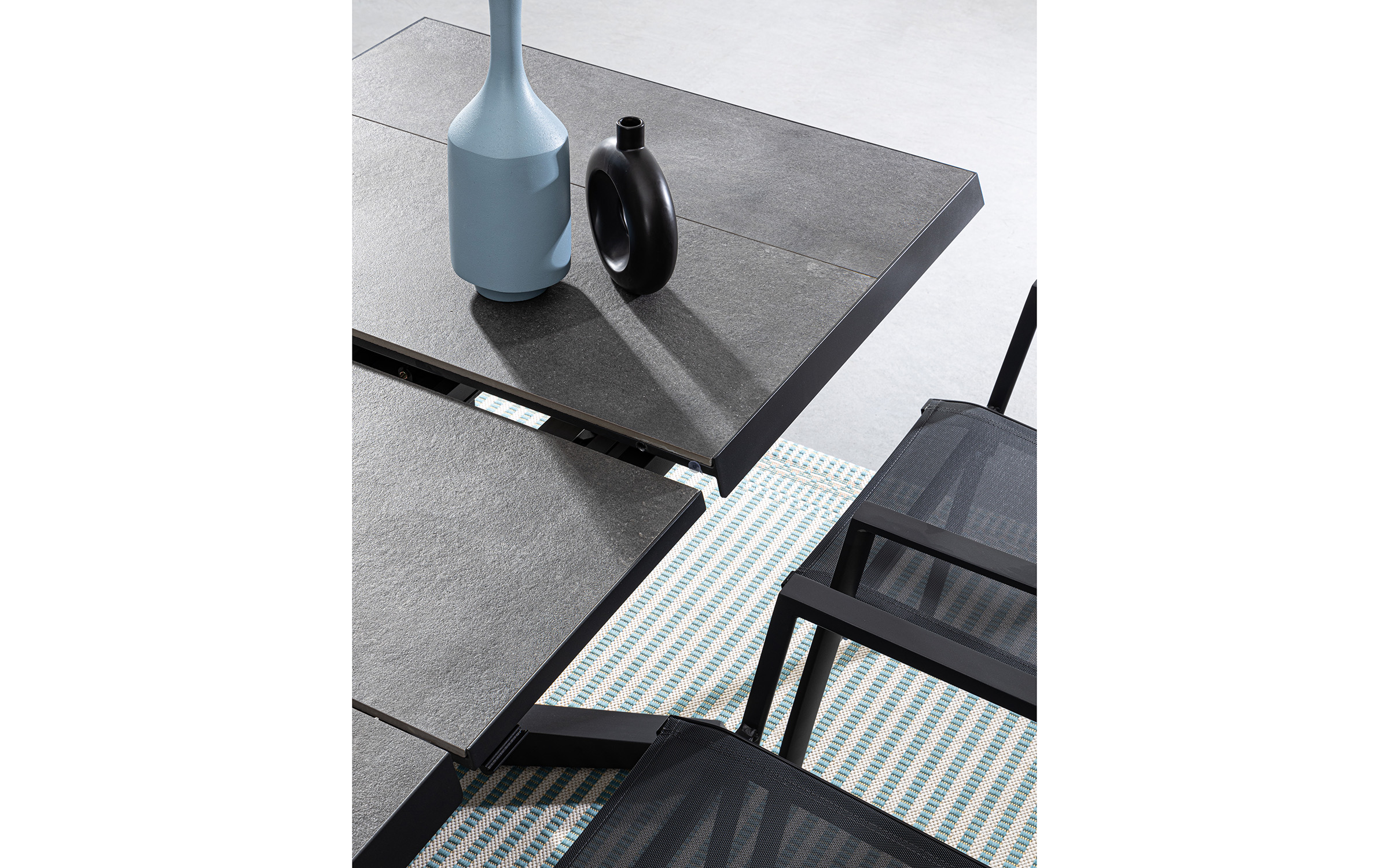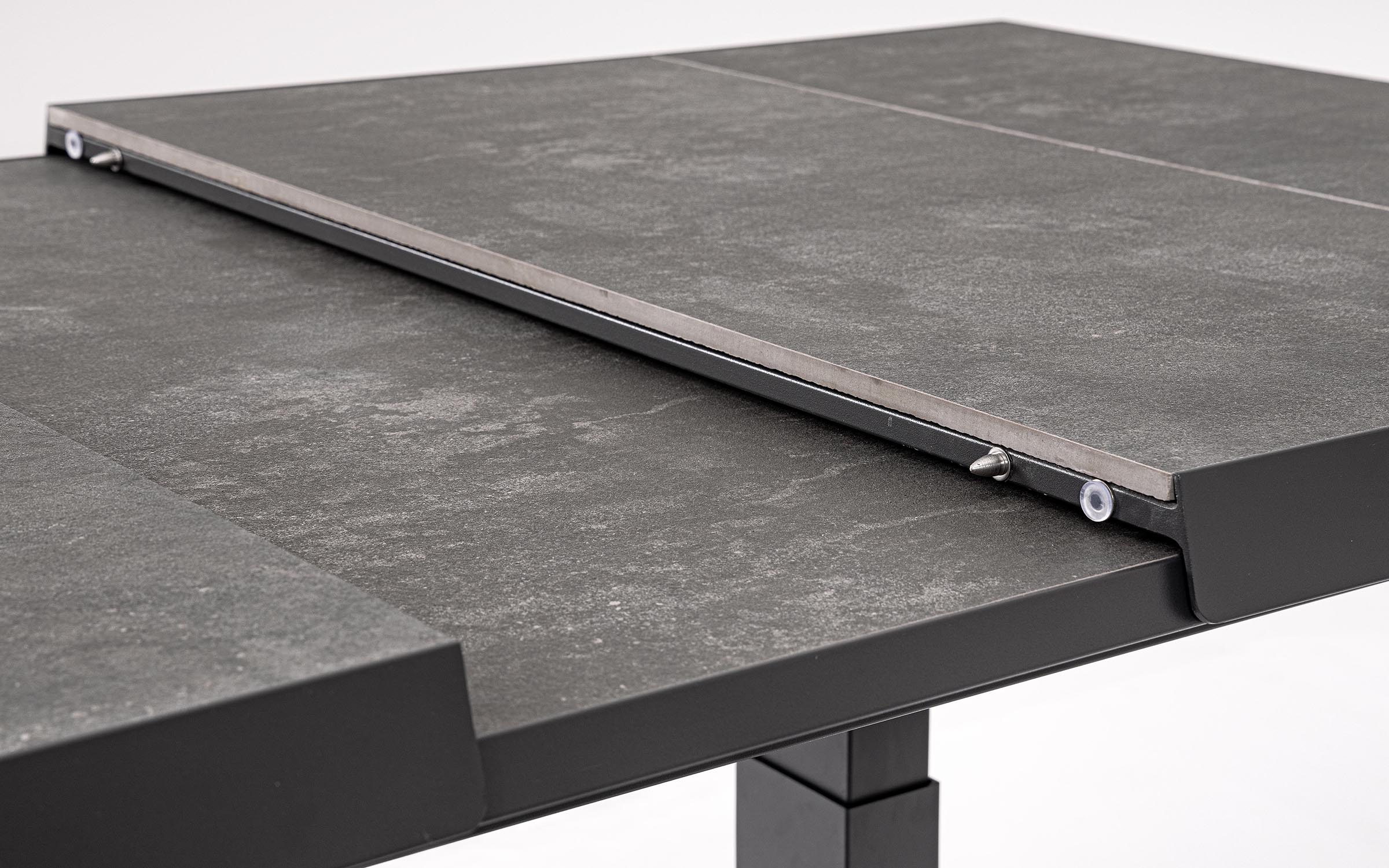 Konstrukcja stołu aluminiowa z blatem z ceramicznych płyt z powierzchnią imitującą naturalny kamień (kolor antracyt) lub z imitacją postarzanego drewna (kolor biały konstrukcji).