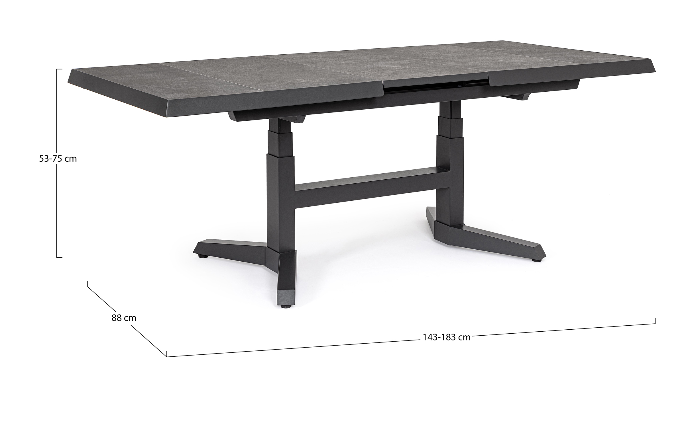Stół ogrodowy o ogromnej funkcjonalności dzięki możliwości płynnej regulacji wysokości blatu od wysokości 53 cm do 73 cm (wysokość standardowego stołu) i możliwości wydłużenia blatu (system rozkładnia za pomocą 1 ręki).